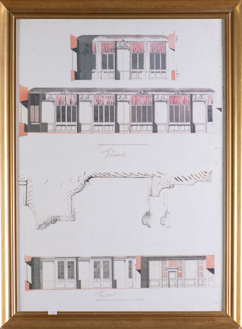 Deux pièces encadrées représentants façade et coupe du Château de Sturehov (Suède). 68 x 48,5 cm à vue 31,5 x 48 cm à vue