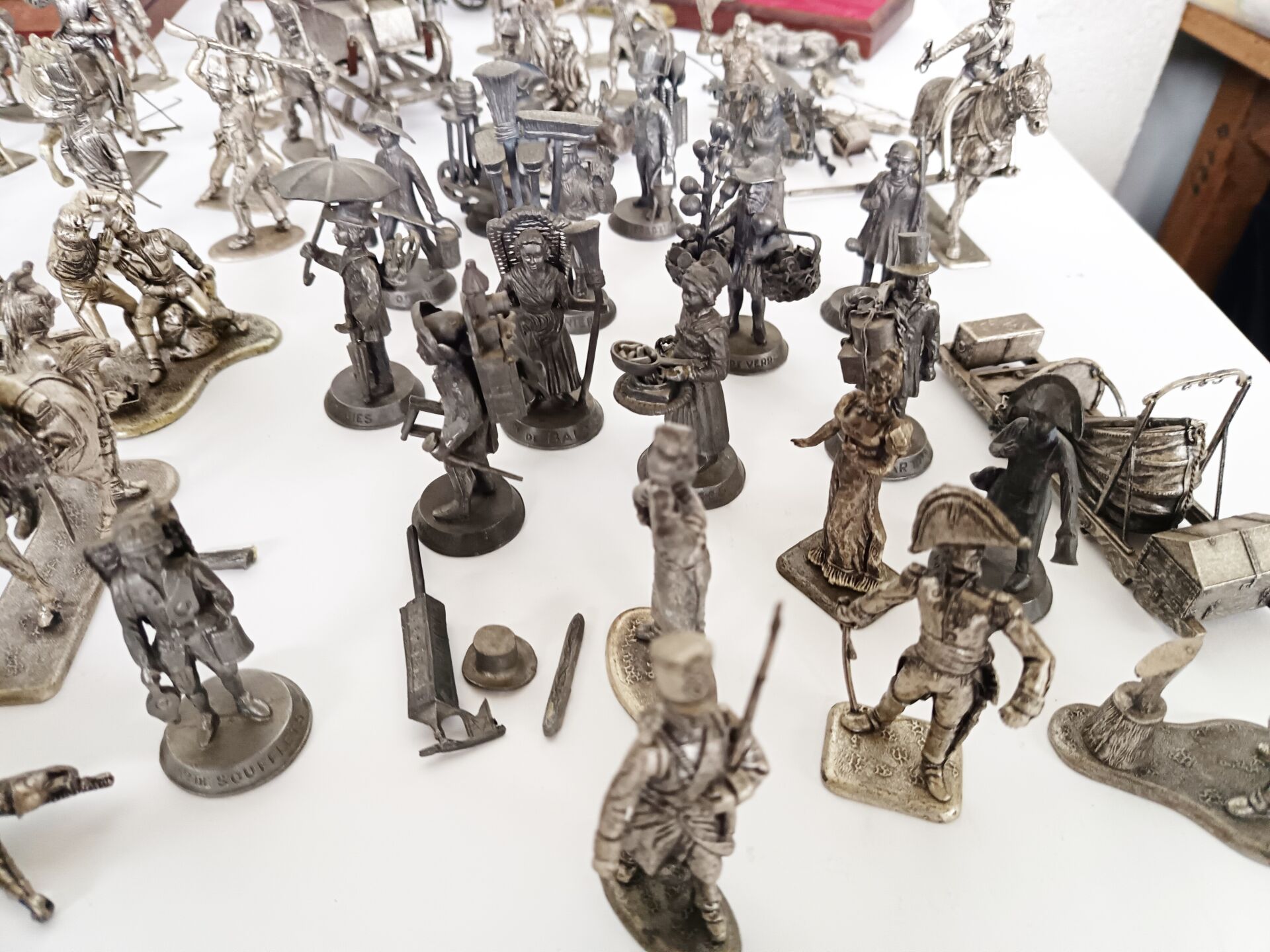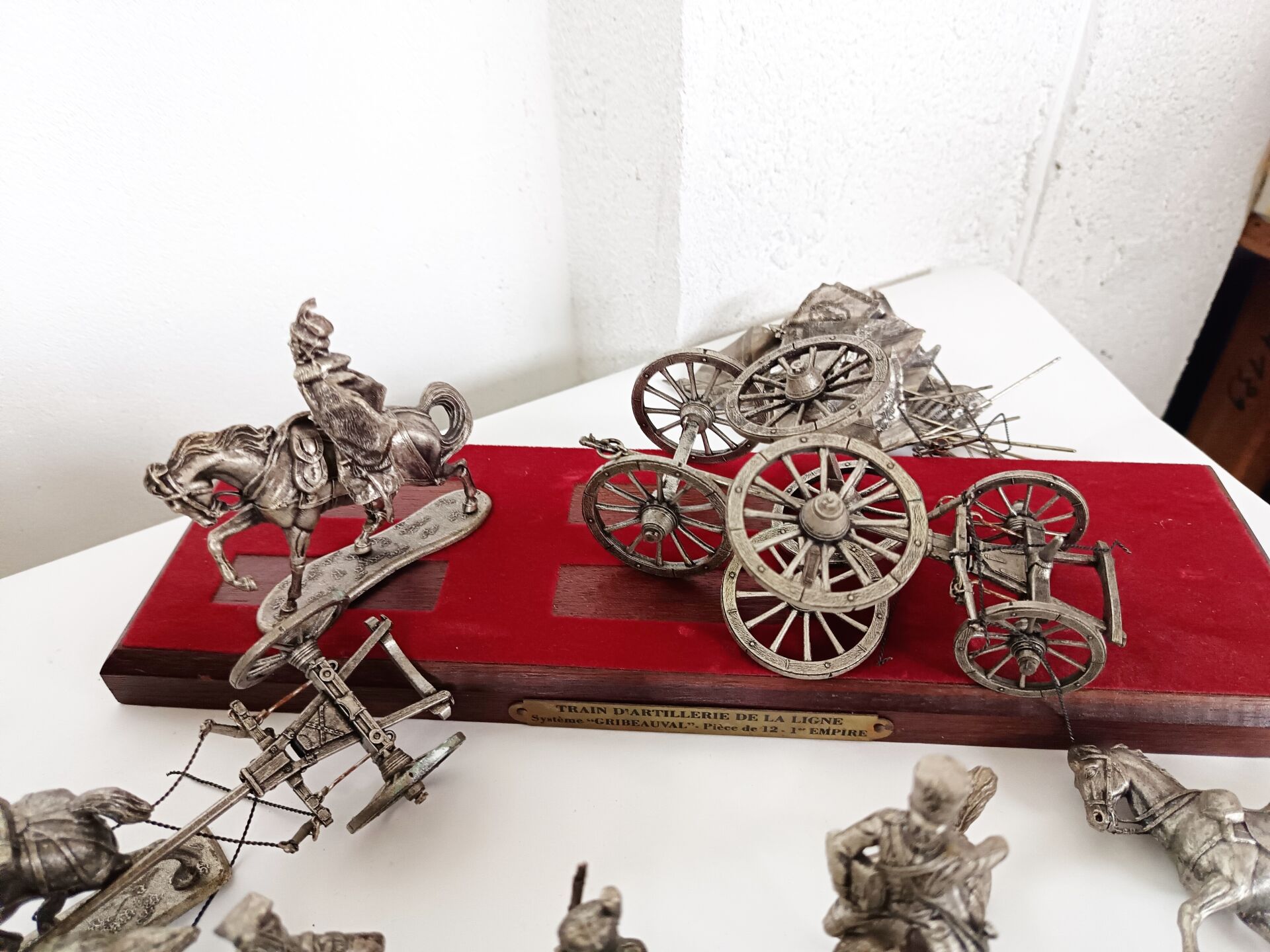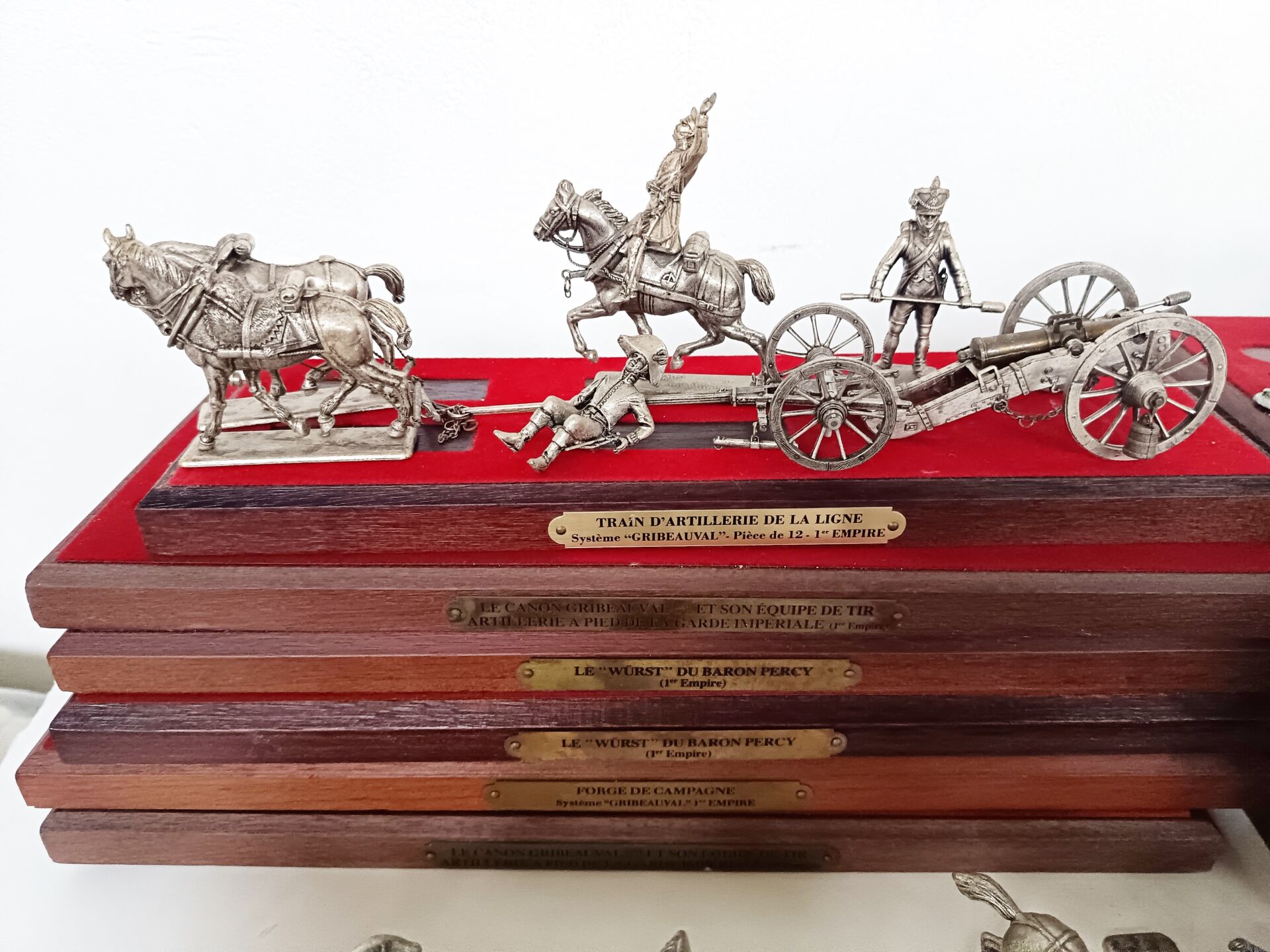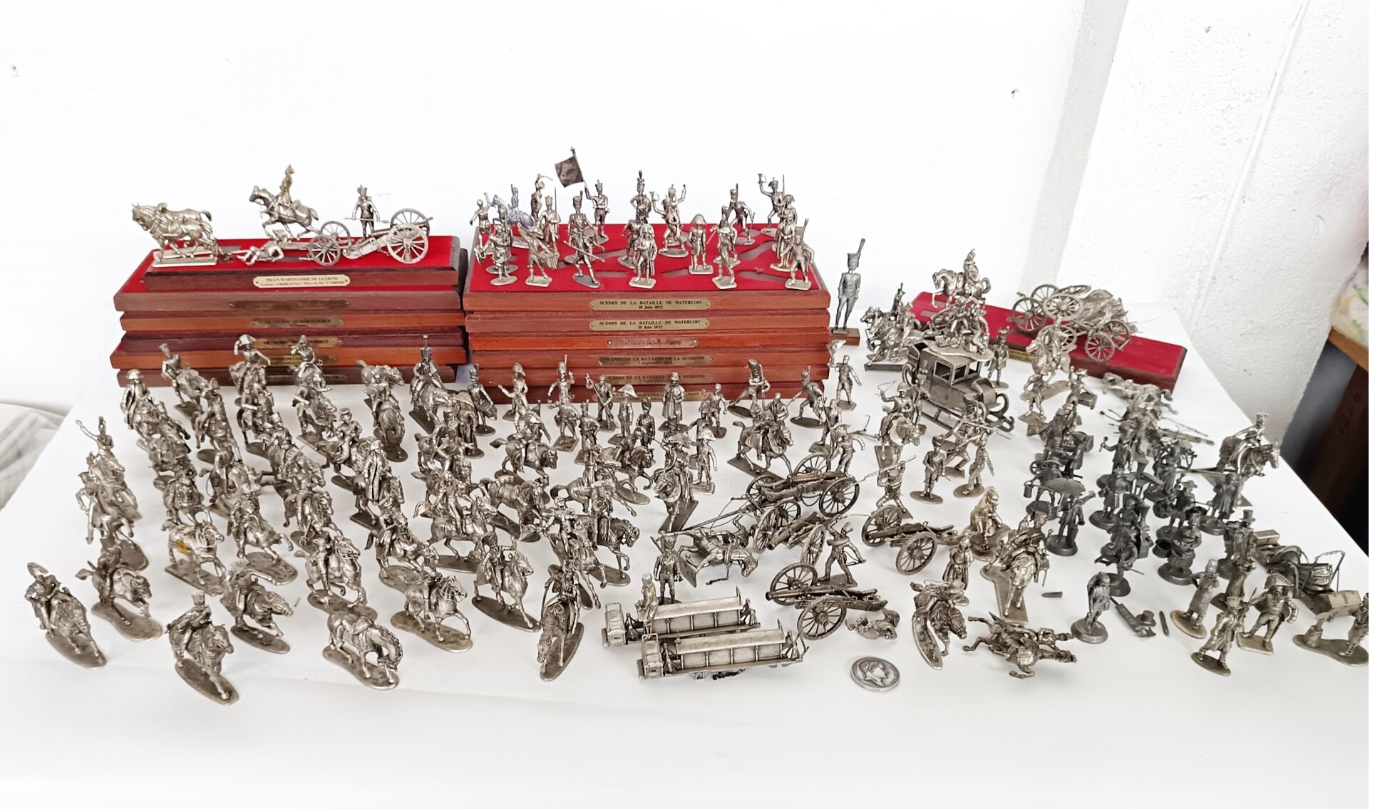 MHSP - lot de soldats en étain fin XXème, sur le thème des armées du 1er Empire et des petits colporteurs comprenant 70 ++ piétons, 50 cavaliers, 3 trains d'artillerie, divers accessoires, 13 planches de présentation et 5 planches d'illustrations l'ensemble est vendu en l'état (manque et accidents)