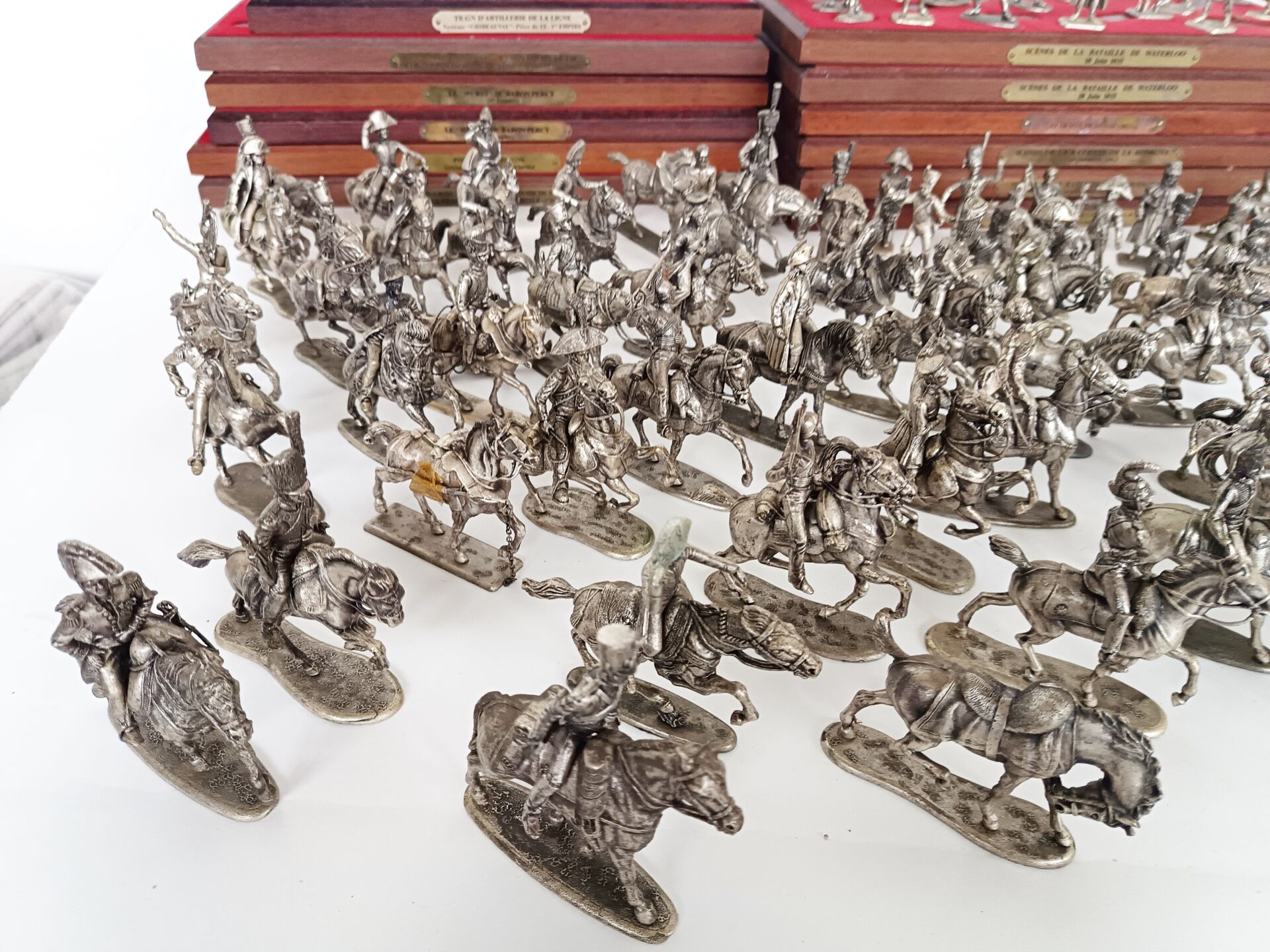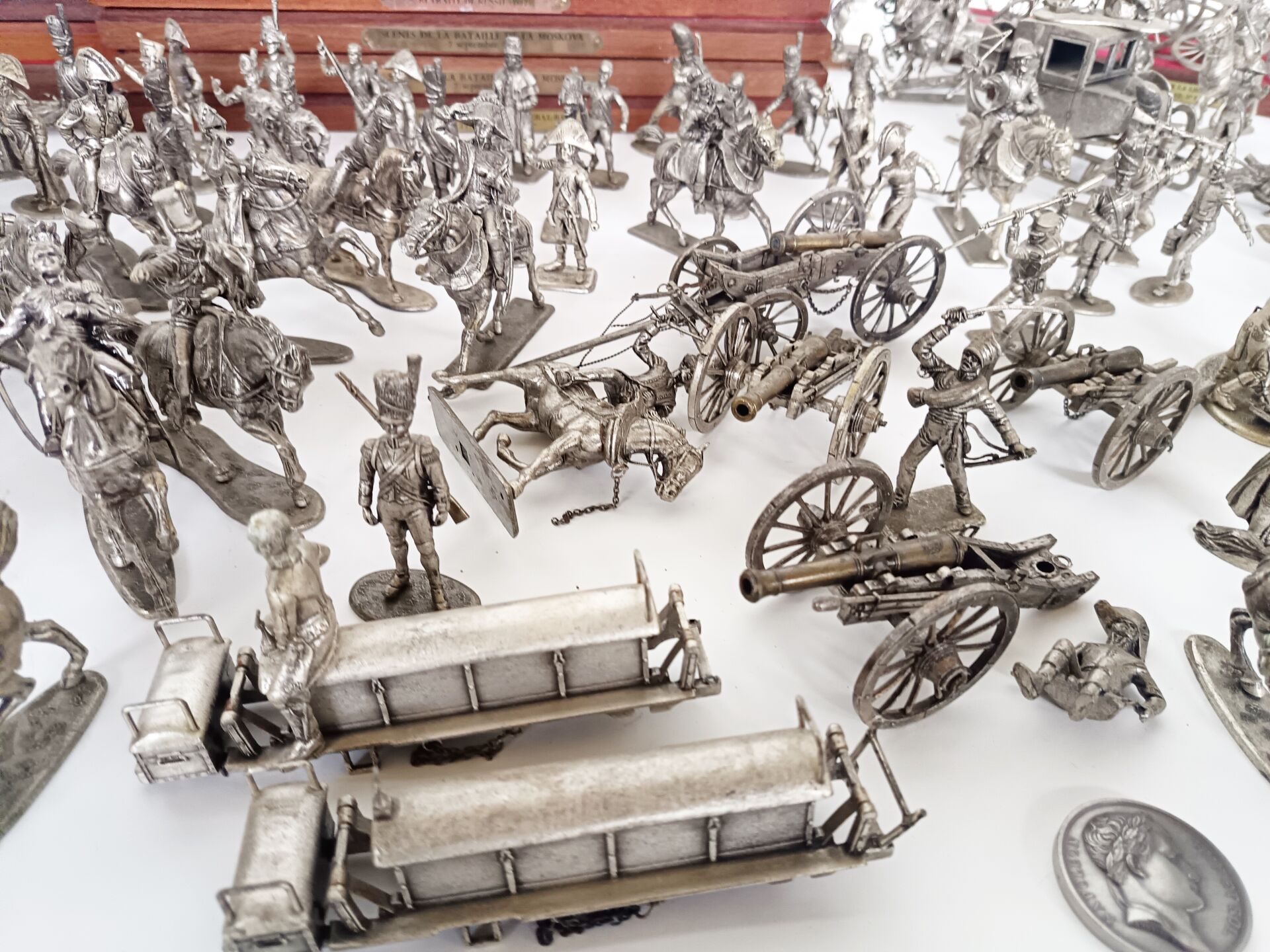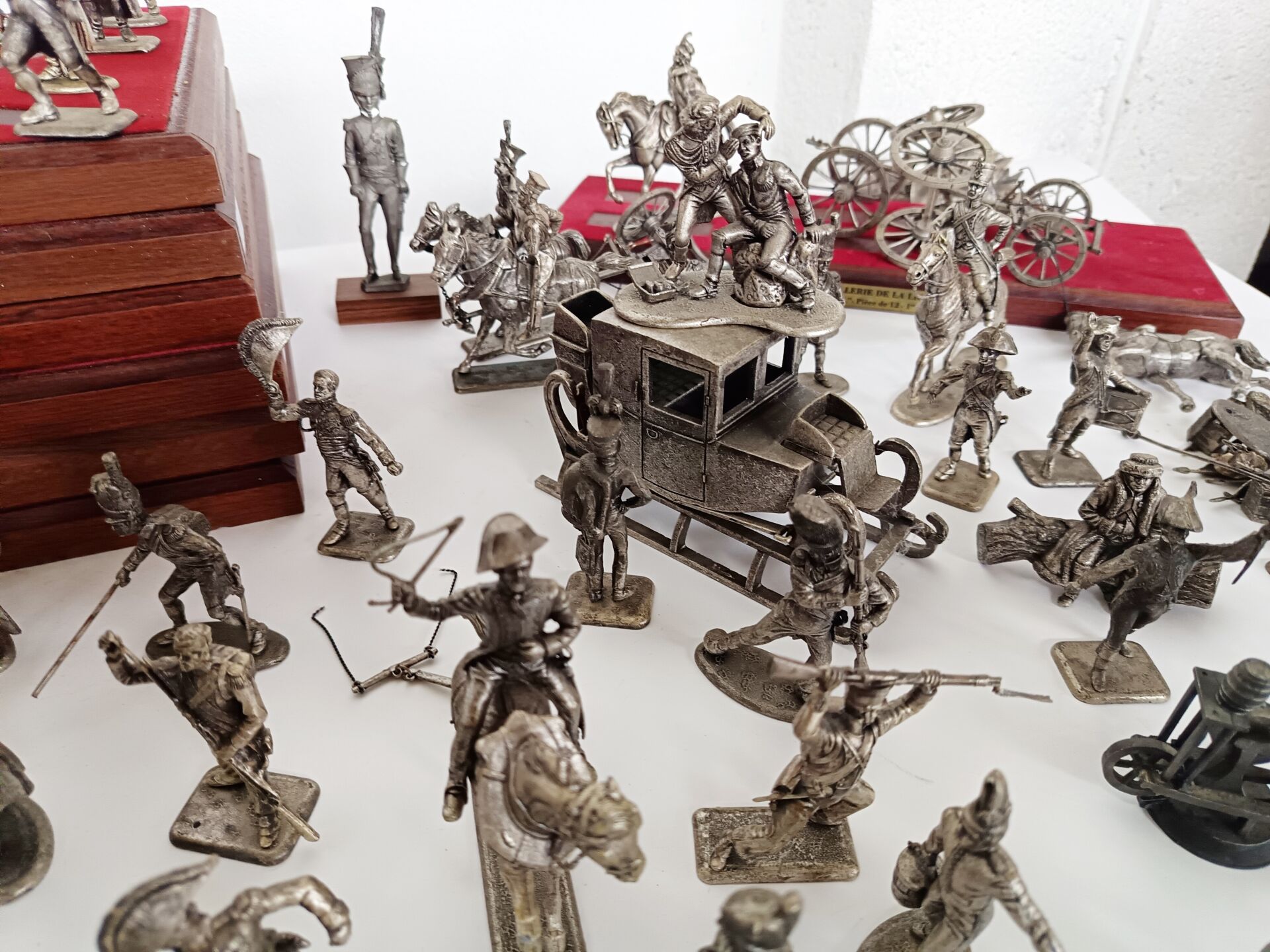 MHSP - lot de soldats en étain fin XXème, sur le thème des armées du 1er Empire et des petits colporteurs comprenant 70 ++ piétons, 50 cavaliers, 3 trains d'artillerie, divers accessoires, 13 planches de présentation et 5 planches d'illustrations l'ensemble est vendu en l'état (manque et accidents)