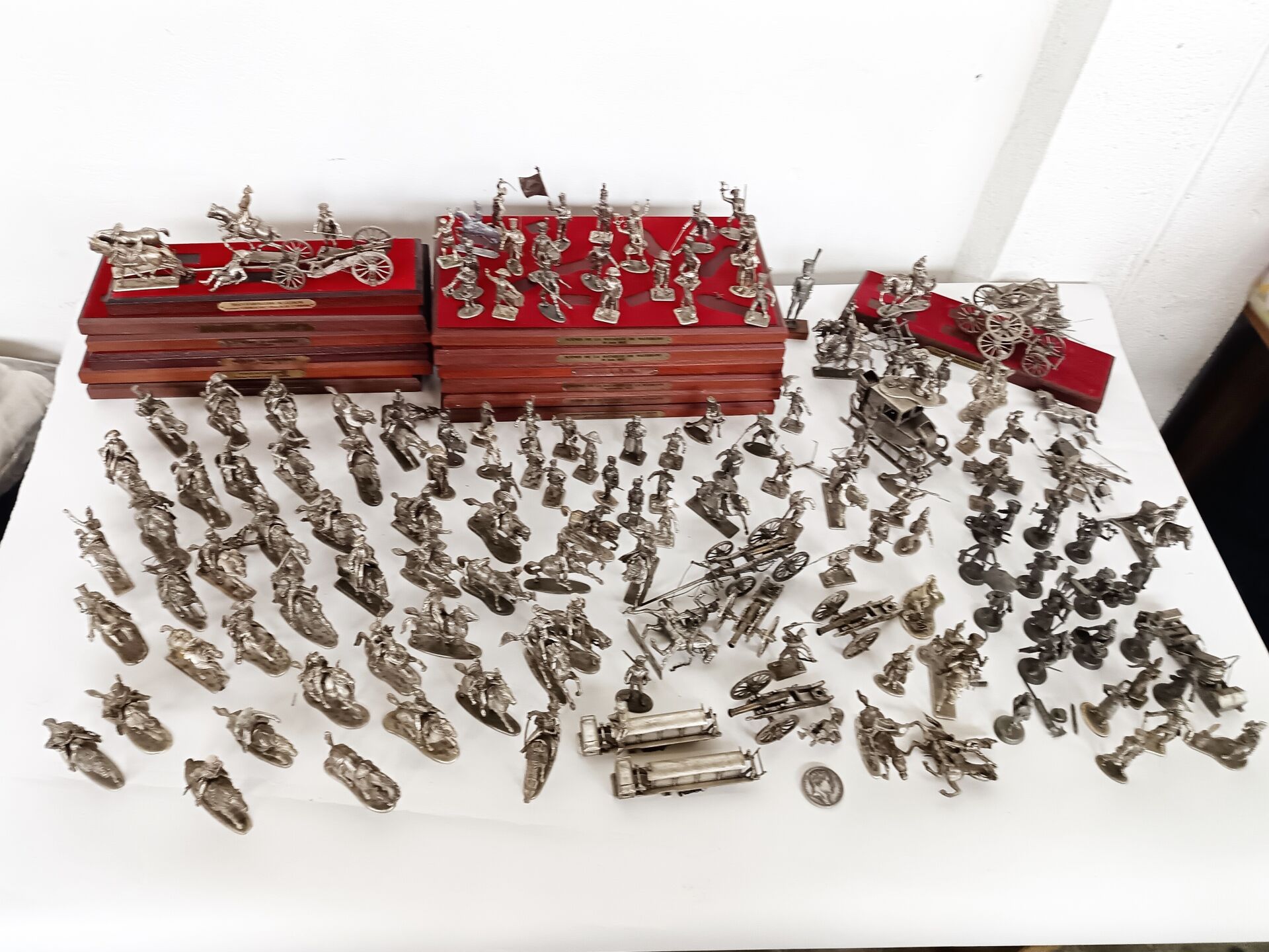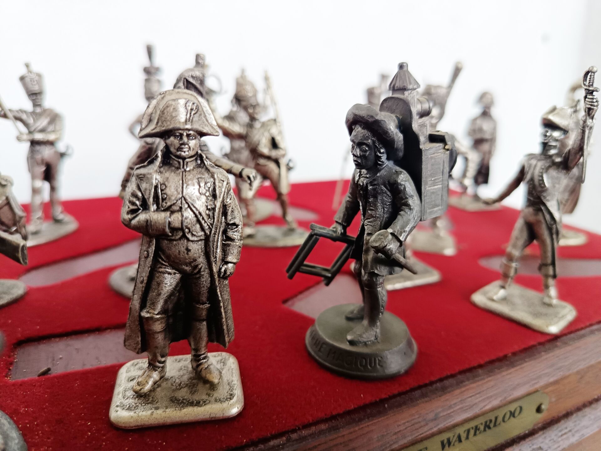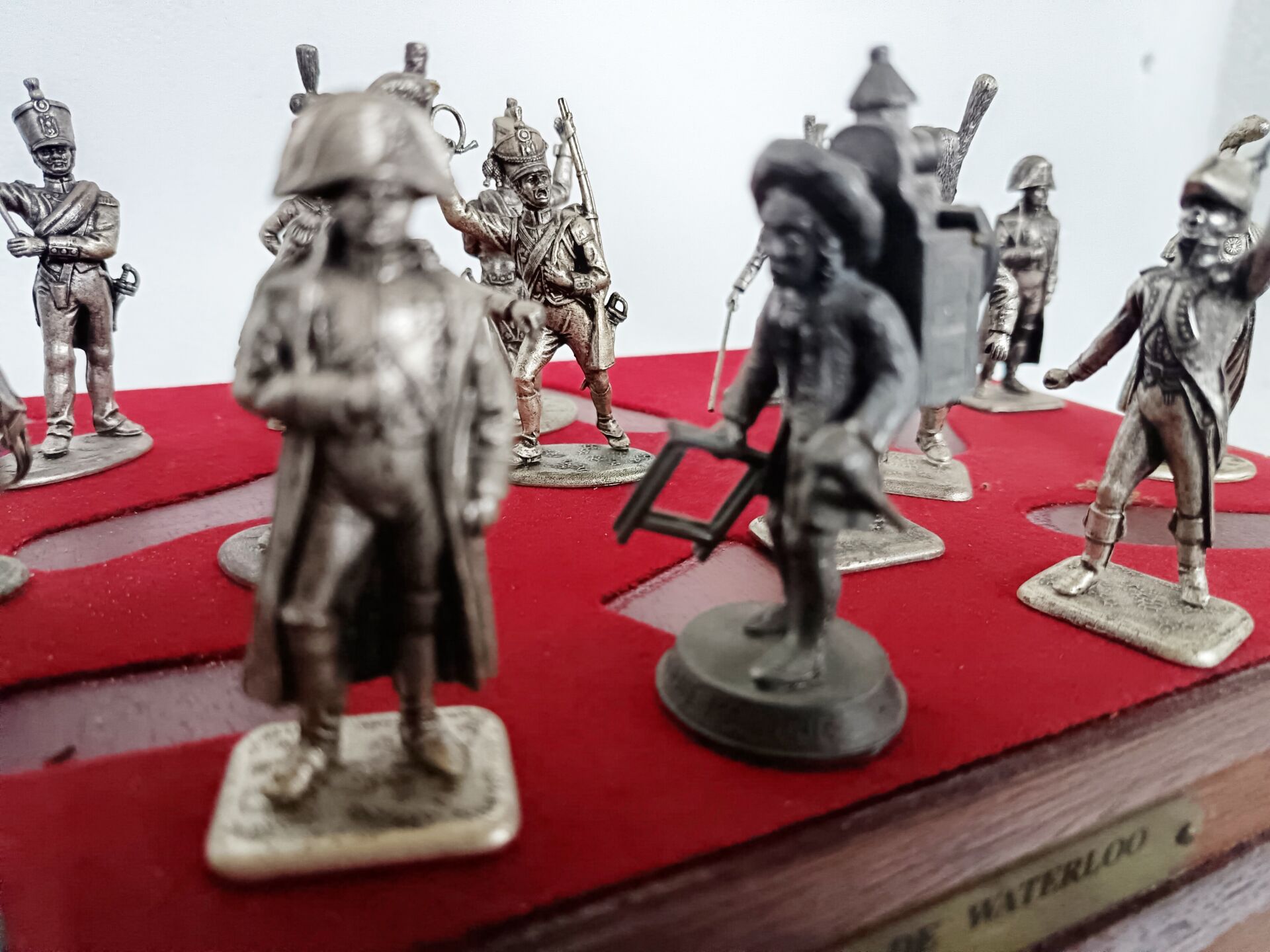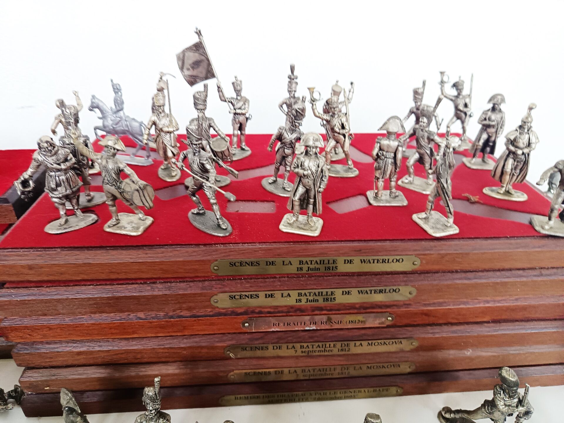 MHSP - lot de soldats en étain fin XXème, sur le thème des armées du 1er Empire et des petits colporteurs comprenant 70 ++ piétons, 50 cavaliers, 3 trains d'artillerie, divers accessoires, 13 planches de présentation et 5 planches d'illustrations l'ensemble est vendu en l'état (manque et accidents)