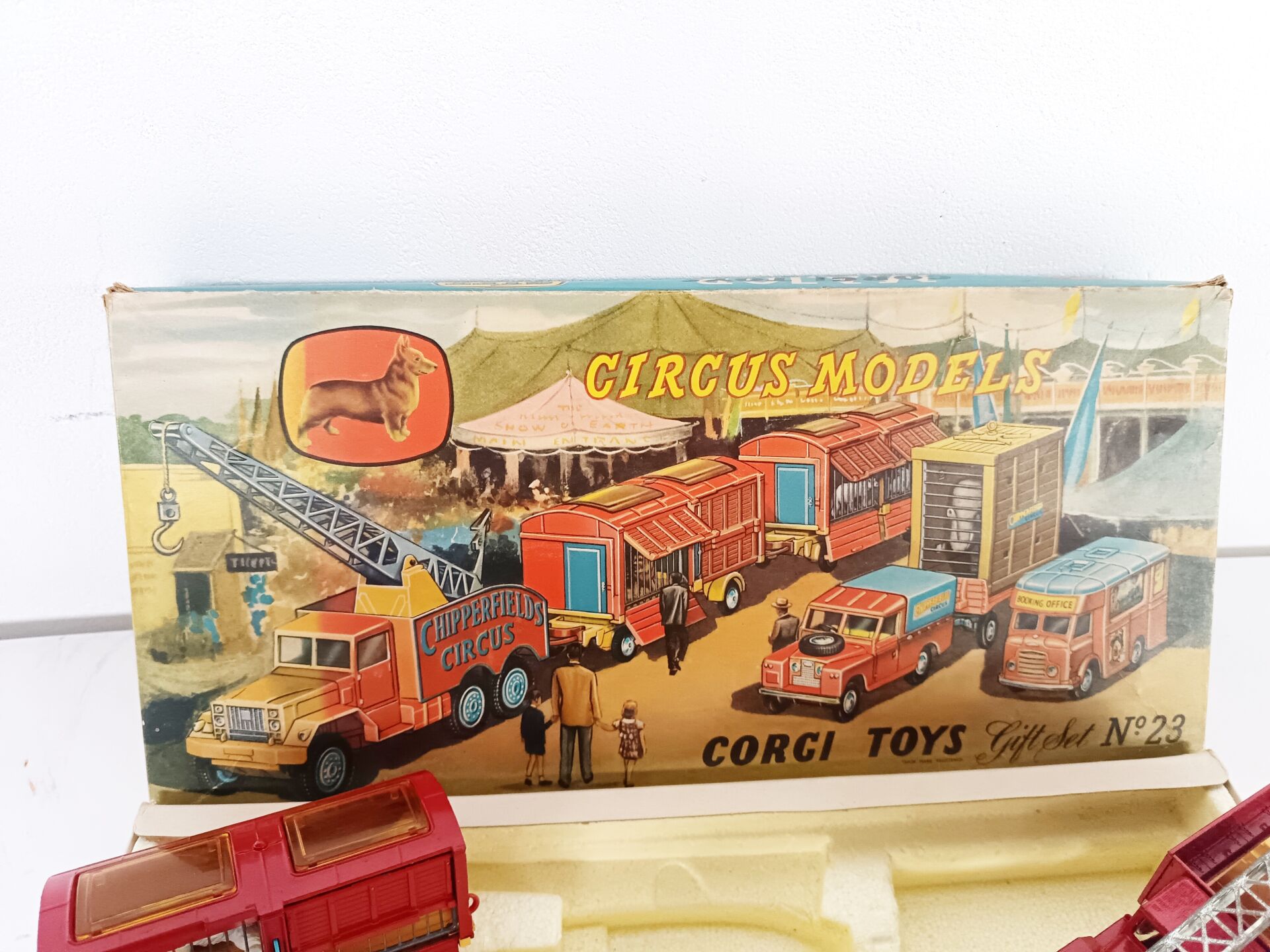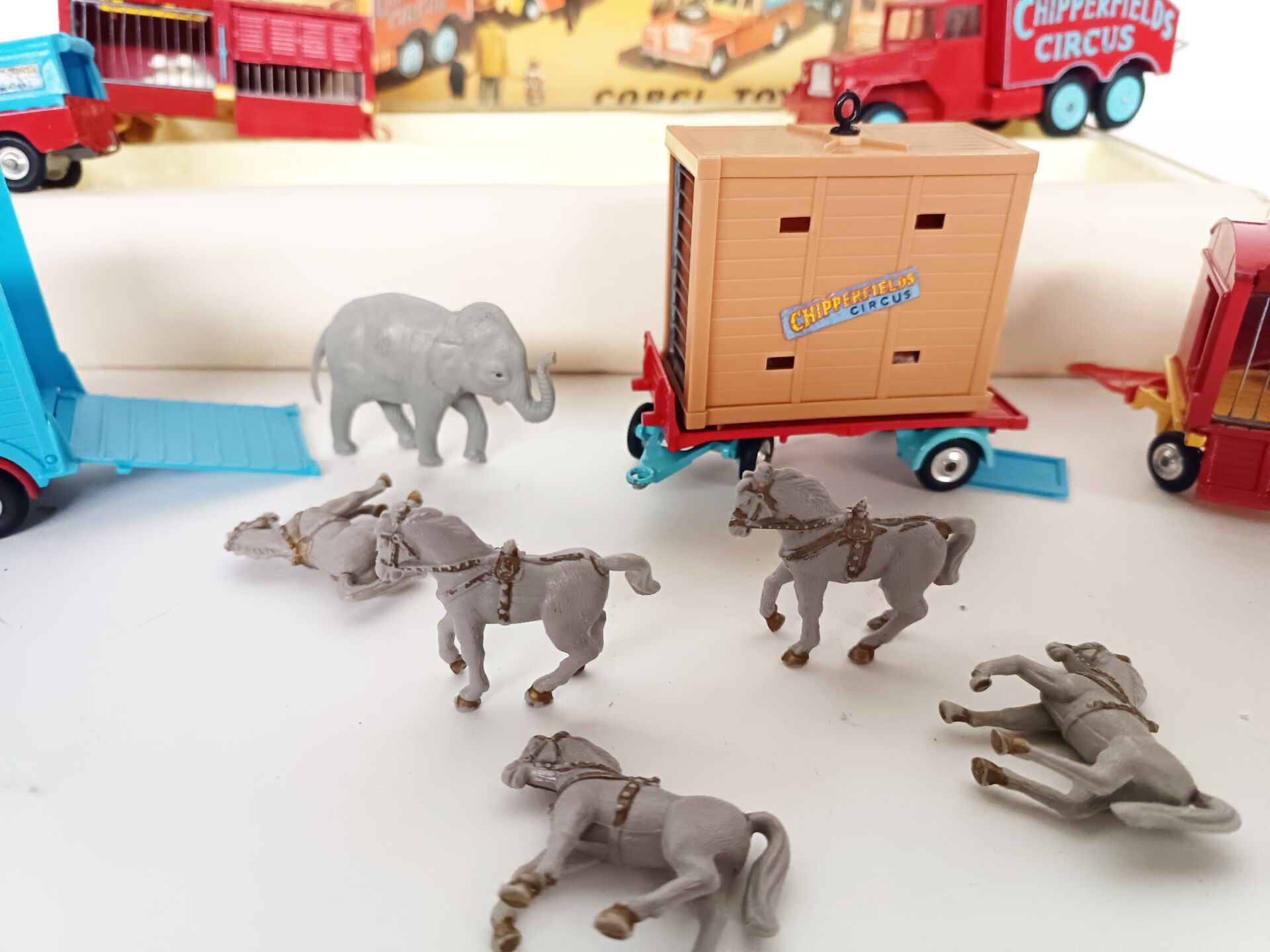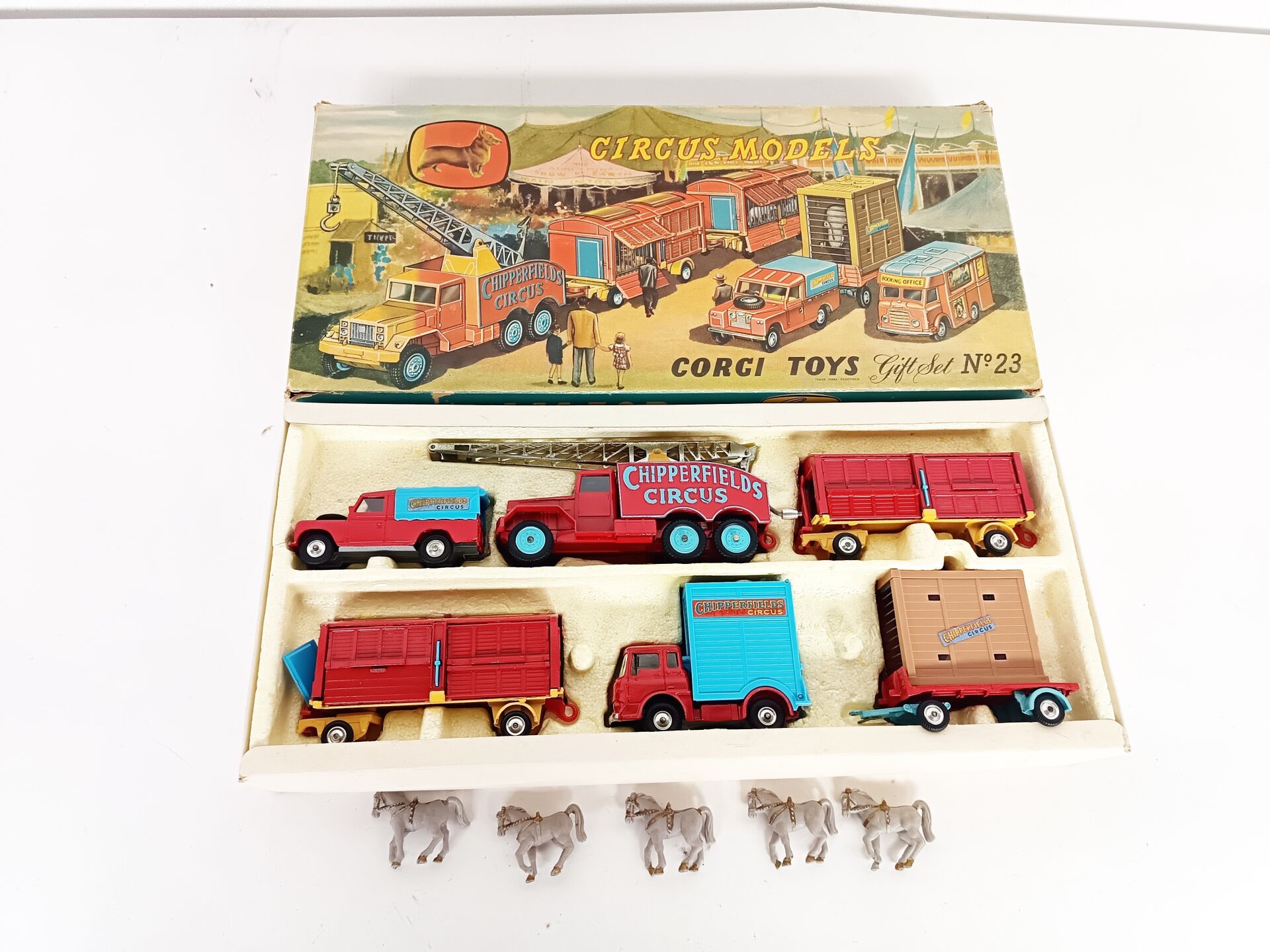 1/43ème Corgi toys, set n° 23 cirque Chipperfields circus. Il contient 3 véhicules et 3 remorques avec animaux (4 ours polaire, 1 lion,1 éléphant, 5 chevaux de parade en sus) A signaler : lionne manquante. Bel état d'origine, à signaler couvercle légèrement défraîchi.