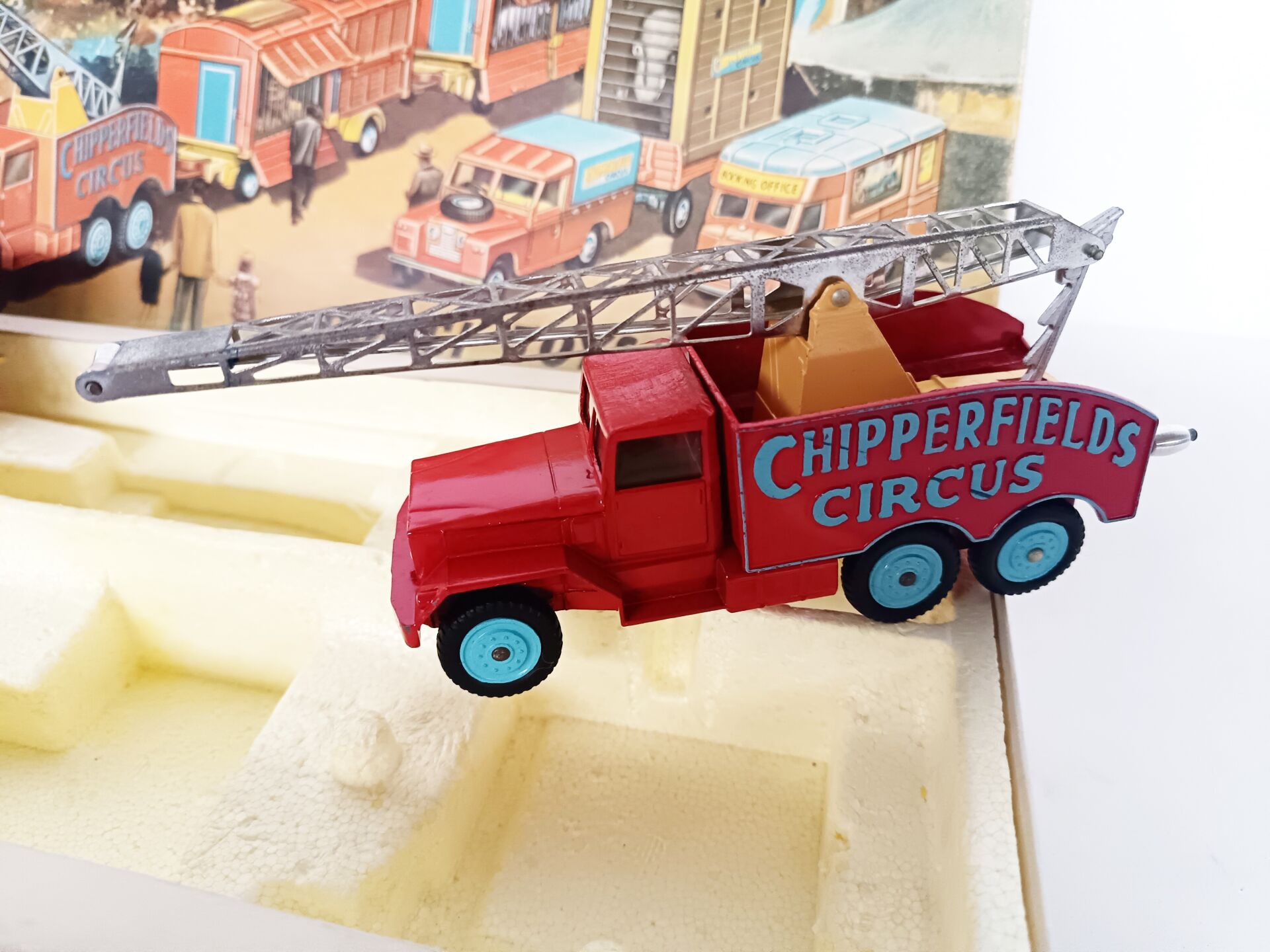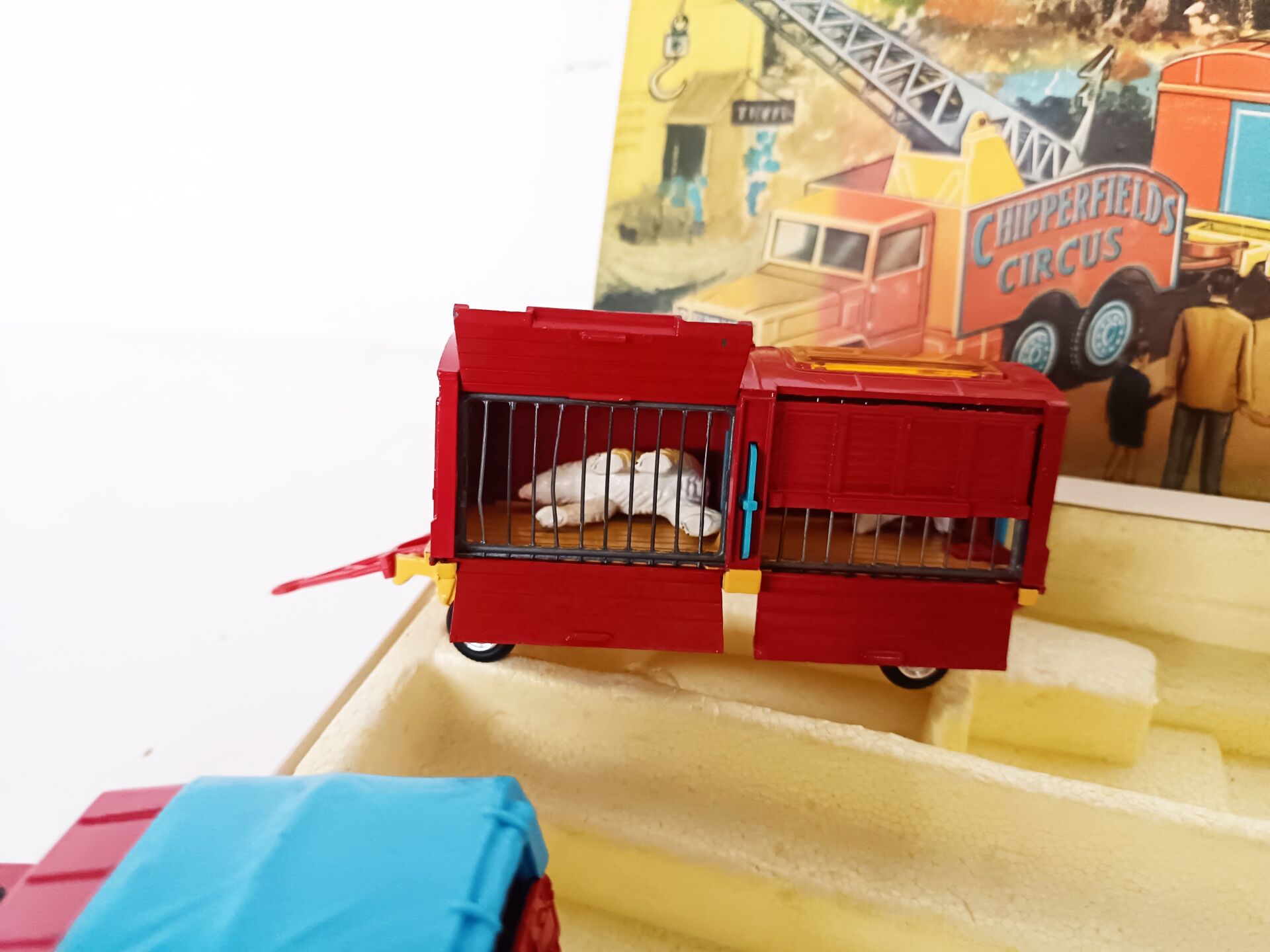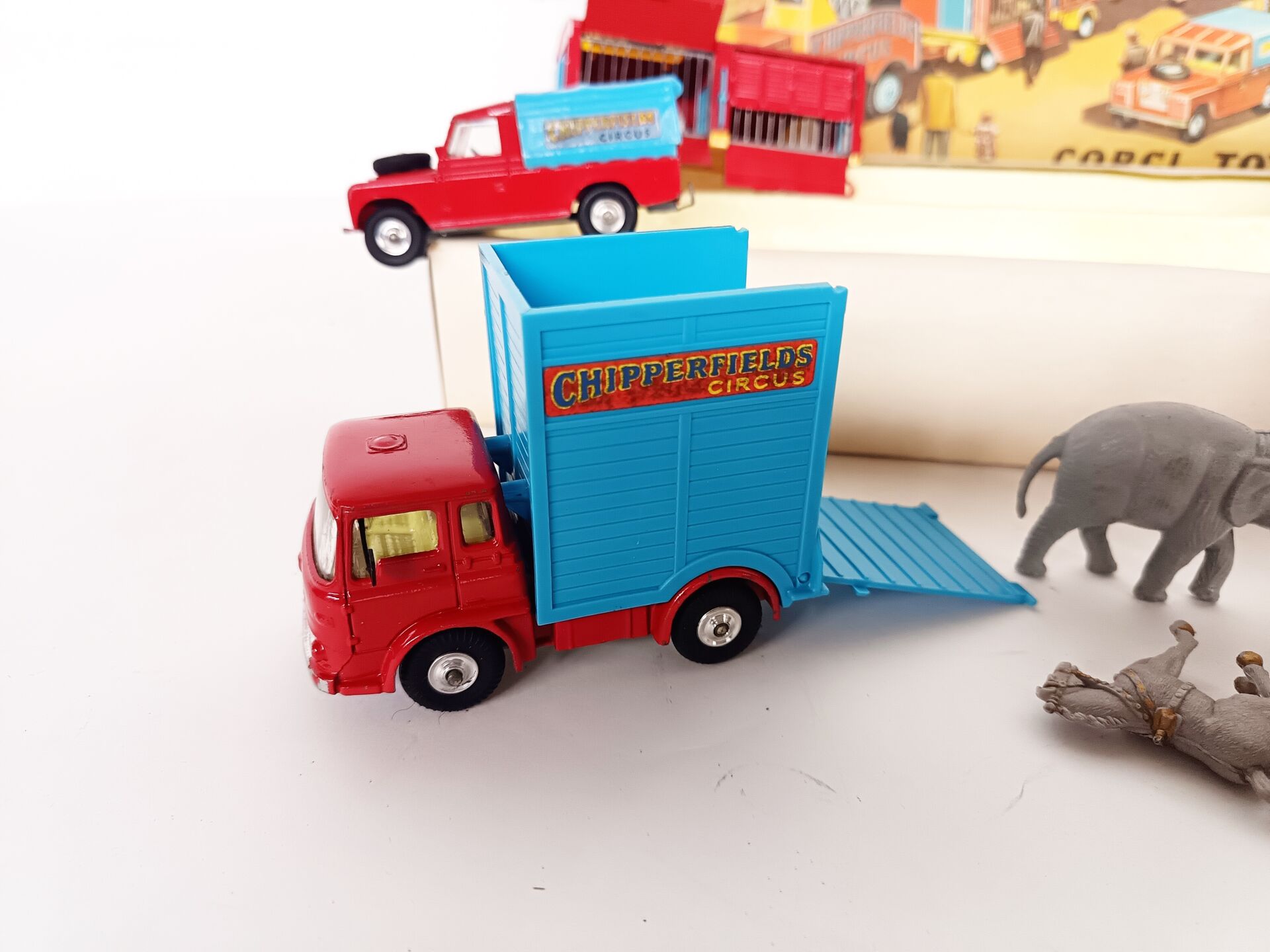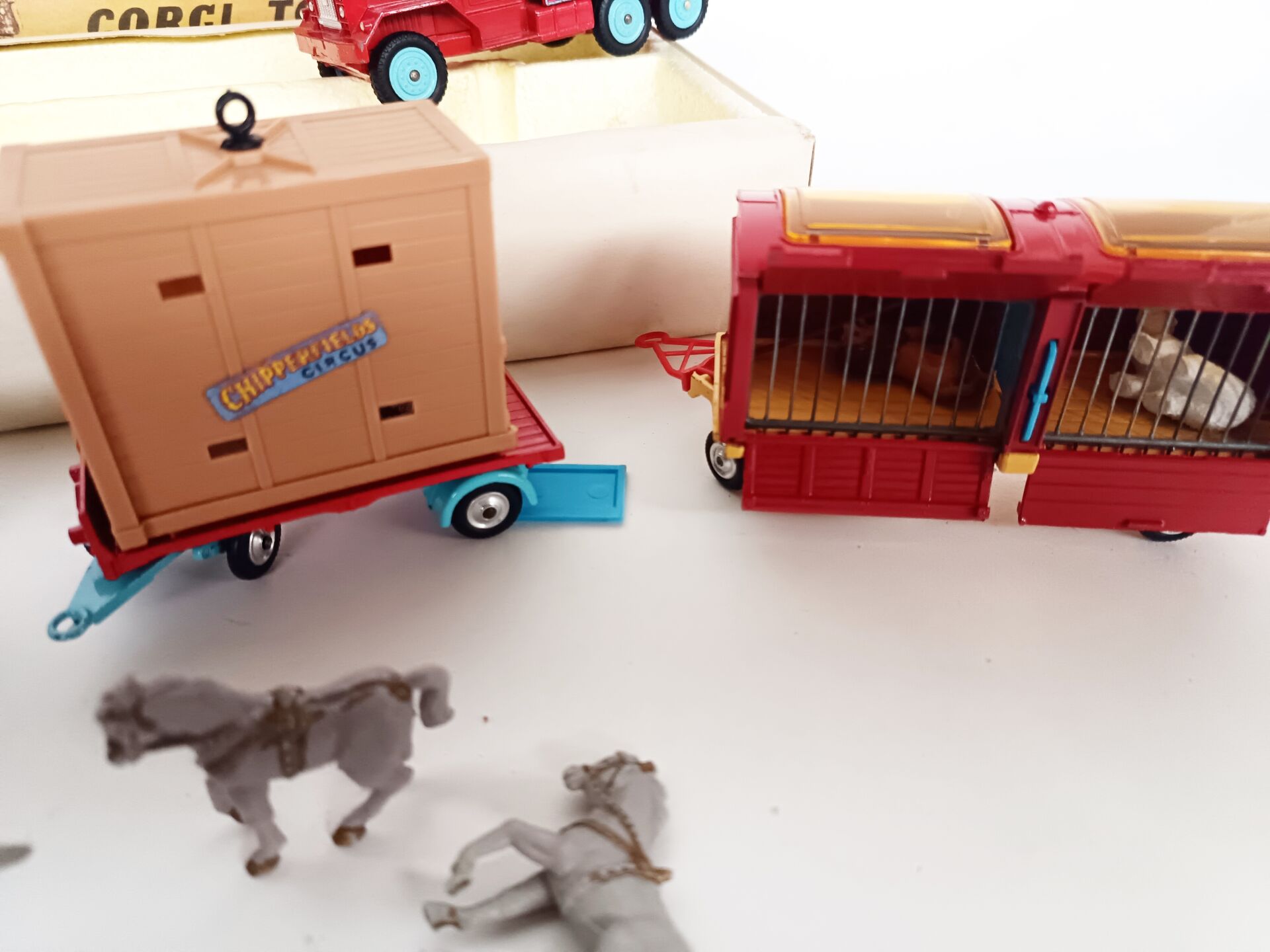 1/43ème Corgi toys, set n° 23 cirque Chipperfields circus. Il contient 3 véhicules et 3 remorques avec animaux (4 ours polaire, 1 lion,1 éléphant, 5 chevaux de parade en sus) A signaler : lionne manquante. Bel état d'origine, à signaler couvercle légèrement défraîchi.