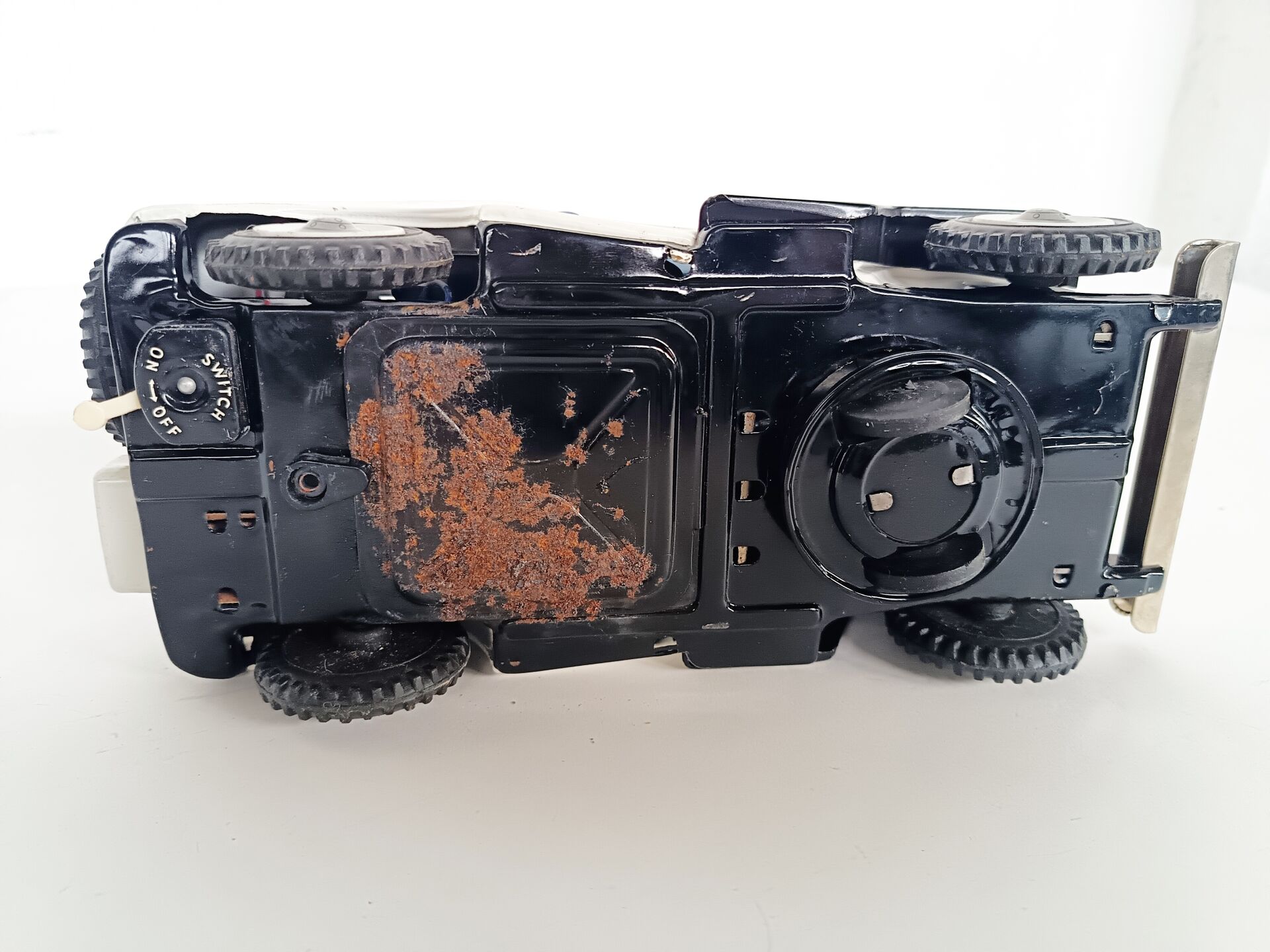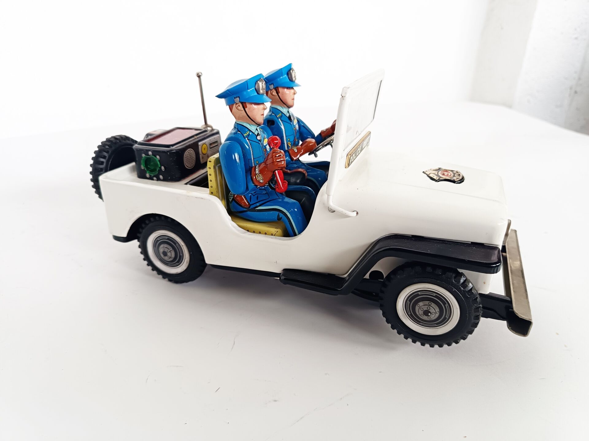 T.N. ( Nomura Toys Japan ). Jeep Police Dept, Battery toys vers 1950-60. L : 28 cm. Rouille au niveau de la plaque des piles mais sinon bel état d'ensemble