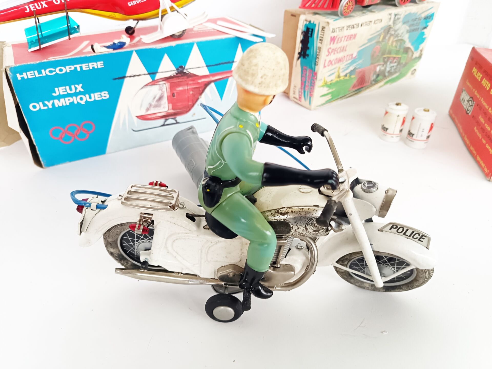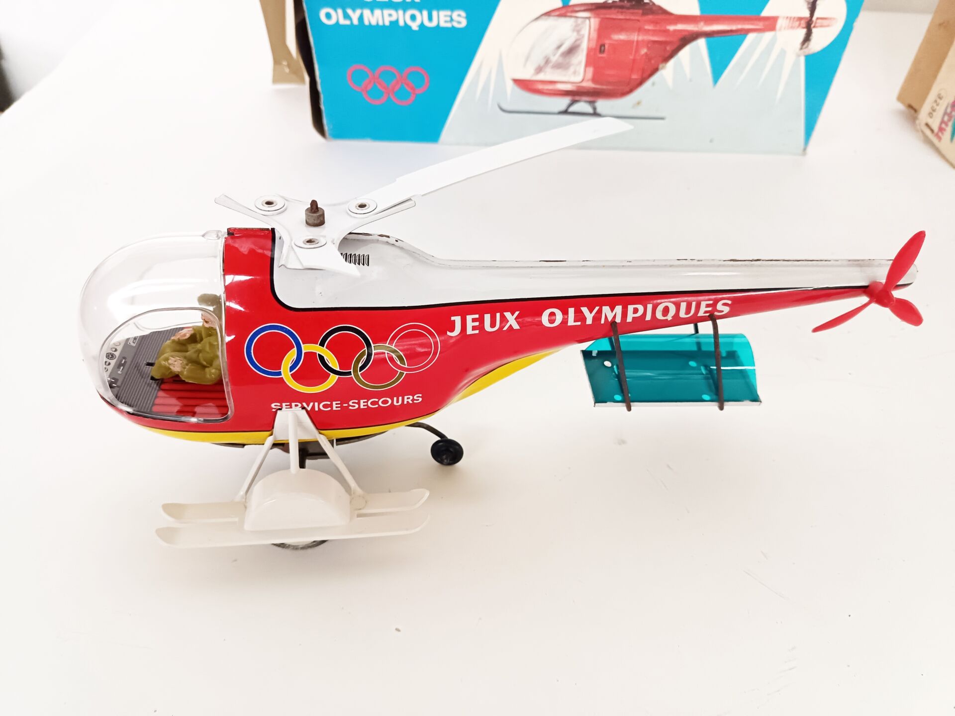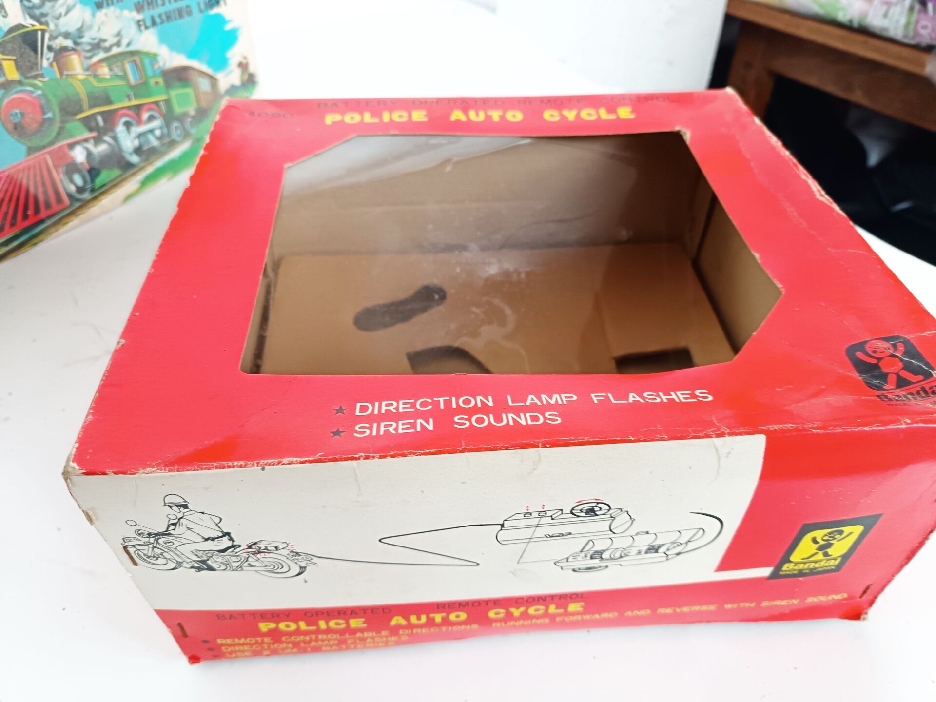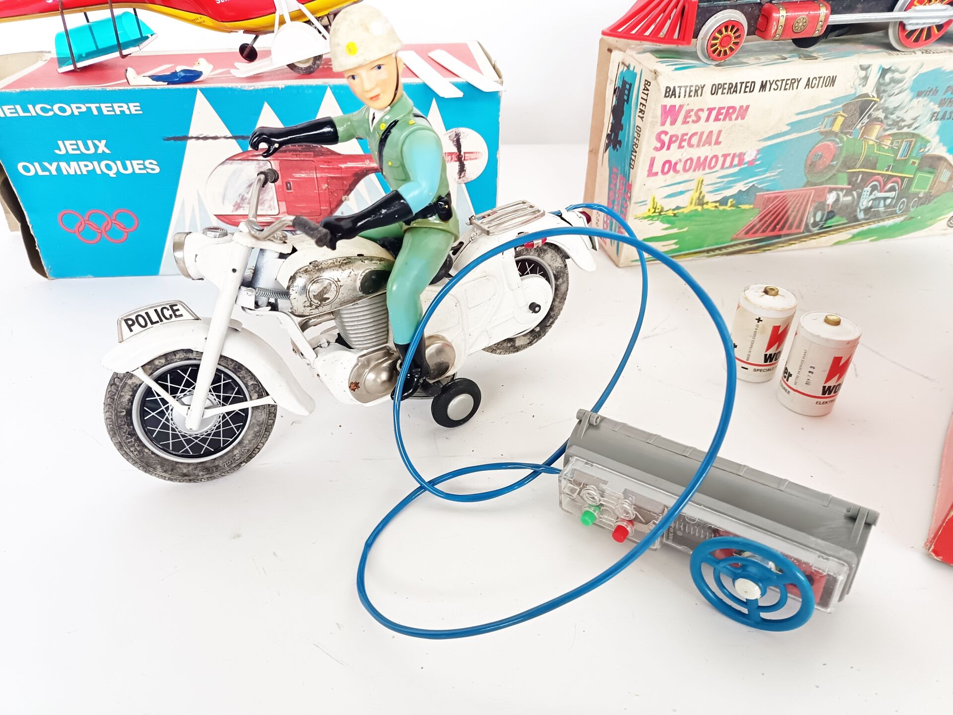 MODERN TOYS, JOUSTRA, BANDAI. Lot de 3 jouets en boite d'origine dont : - battery toys locomotive western réf : 3230 - moto de police jouet filoguidé réf : 4090 - 1 hélicoptère de secours pour les JO jouet mécanique en tôle lithographiée Réf 574, accidents aux pâles. Bel état à passable (boîtes défraîchies)