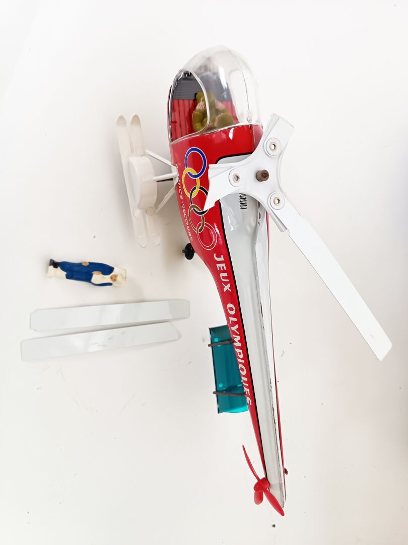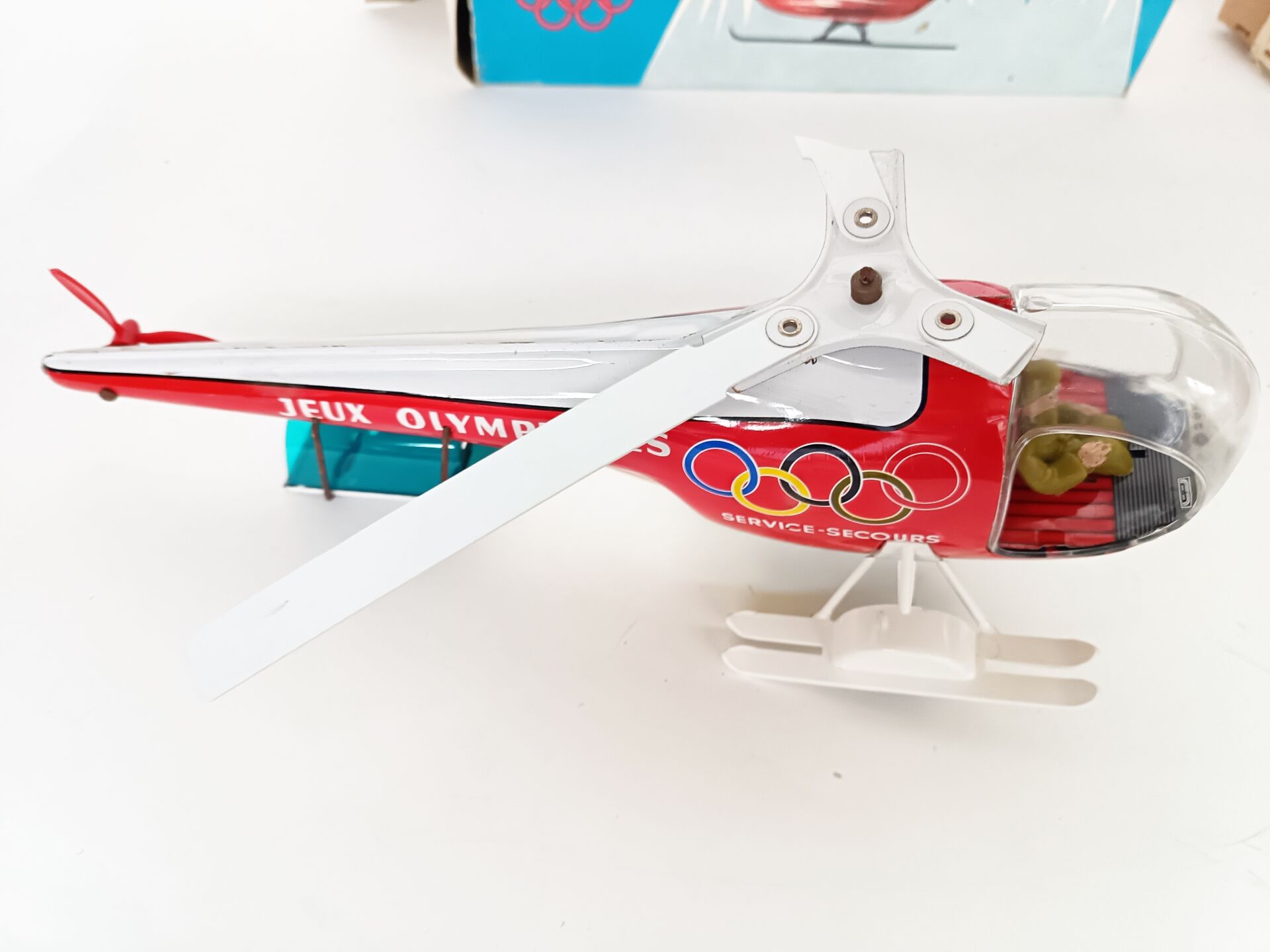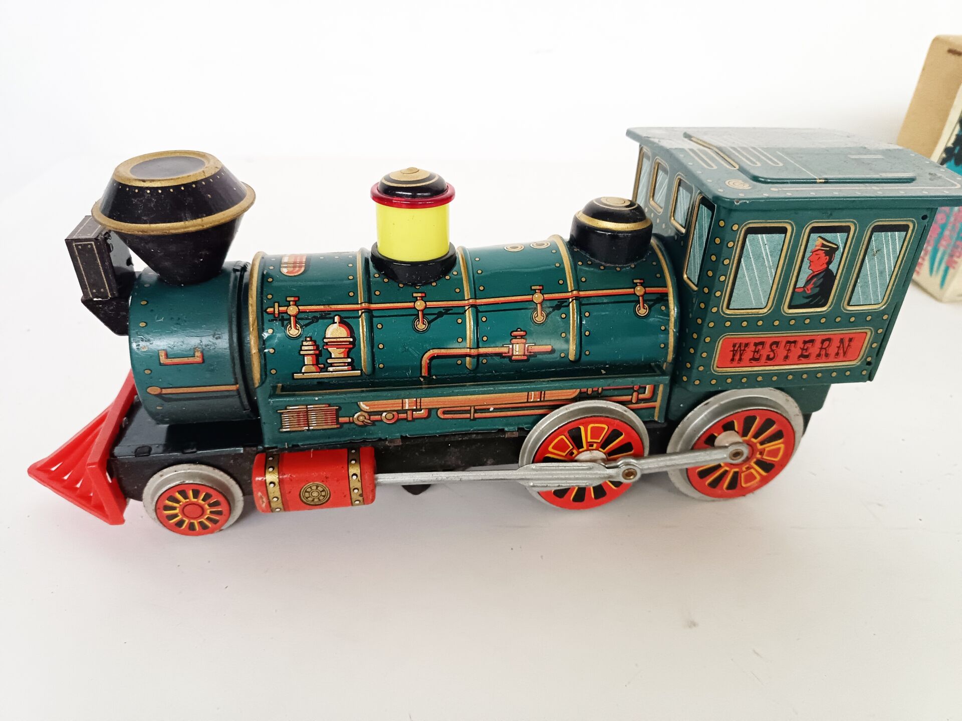 MODERN TOYS, JOUSTRA, BANDAI. Lot de 3 jouets en boite d'origine dont : - battery toys locomotive western réf : 3230 - moto de police jouet filoguidé réf : 4090 - 1 hélicoptère de secours pour les JO jouet mécanique en tôle lithographiée Réf 574, accidents aux pâles. Bel état à passable (boîtes défraîchies)