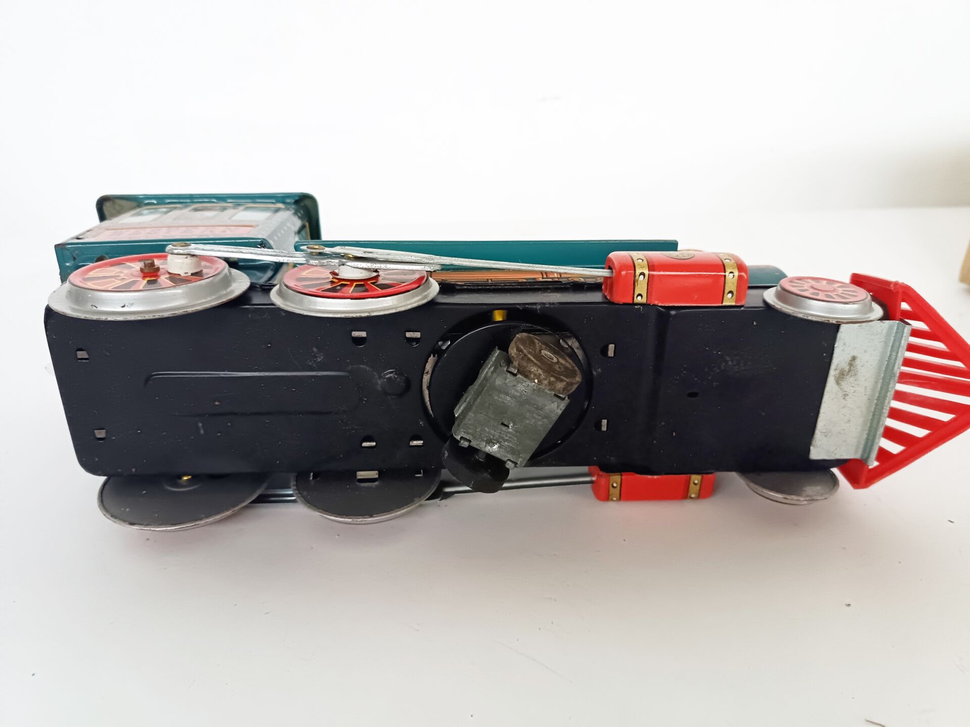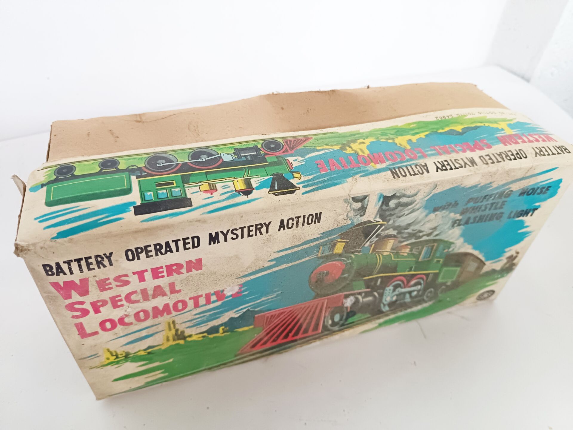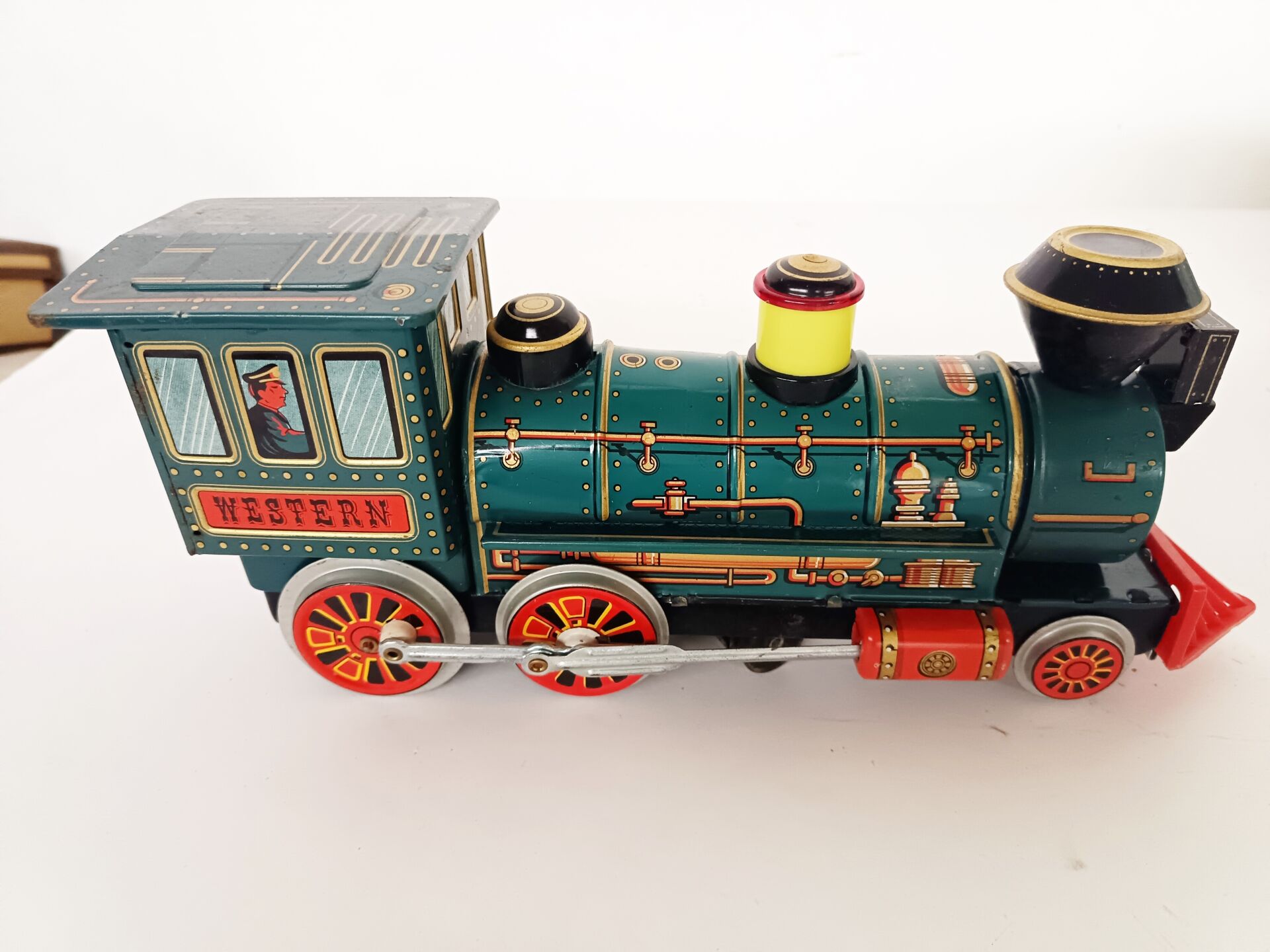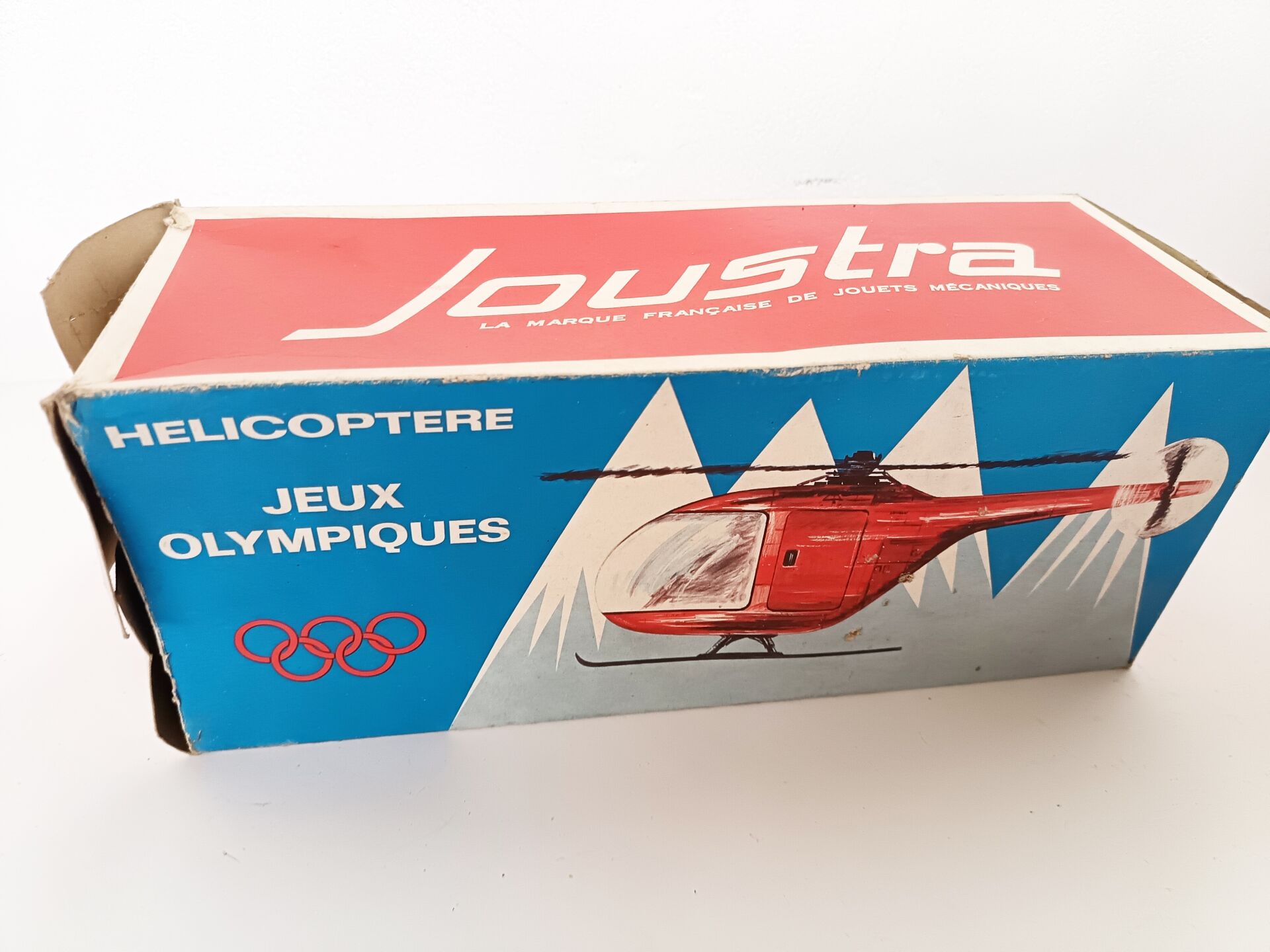 MODERN TOYS, JOUSTRA, BANDAI. Lot de 3 jouets en boite d'origine dont : - battery toys locomotive western réf : 3230 - moto de police jouet filoguidé réf : 4090 - 1 hélicoptère de secours pour les JO jouet mécanique en tôle lithographiée Réf 574, accidents aux pâles. Bel état à passable (boîtes défraîchies)
