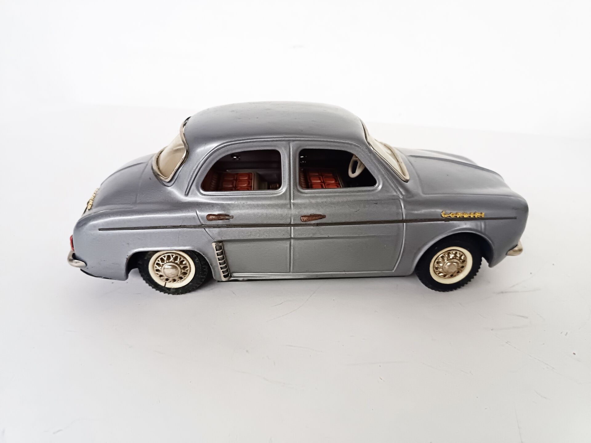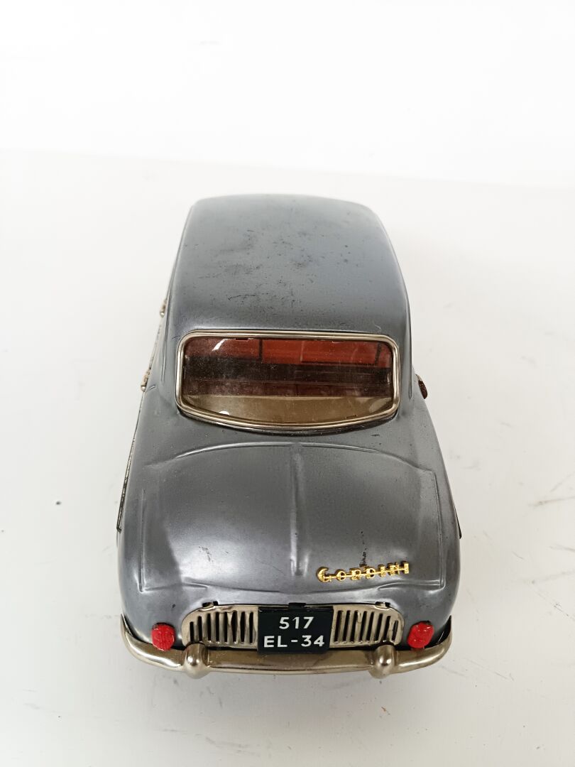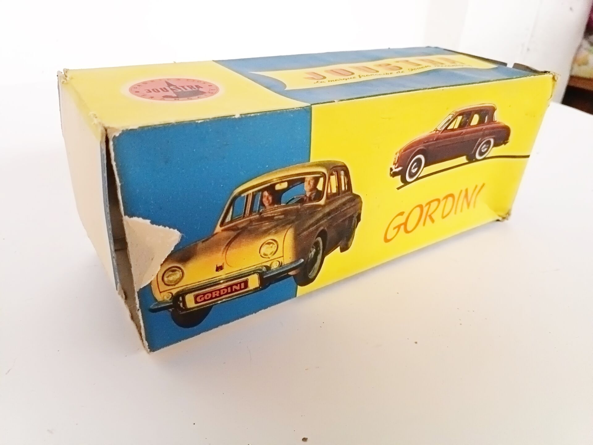 JOUSTRA. Renault Dauphine Gordini - jouet à friction en tôle peinte, L 31 cm -immatriculée 517 FL 34, Réf 2064 Boite défraîchie et 1 rabat manquant sinon bel état d'origine