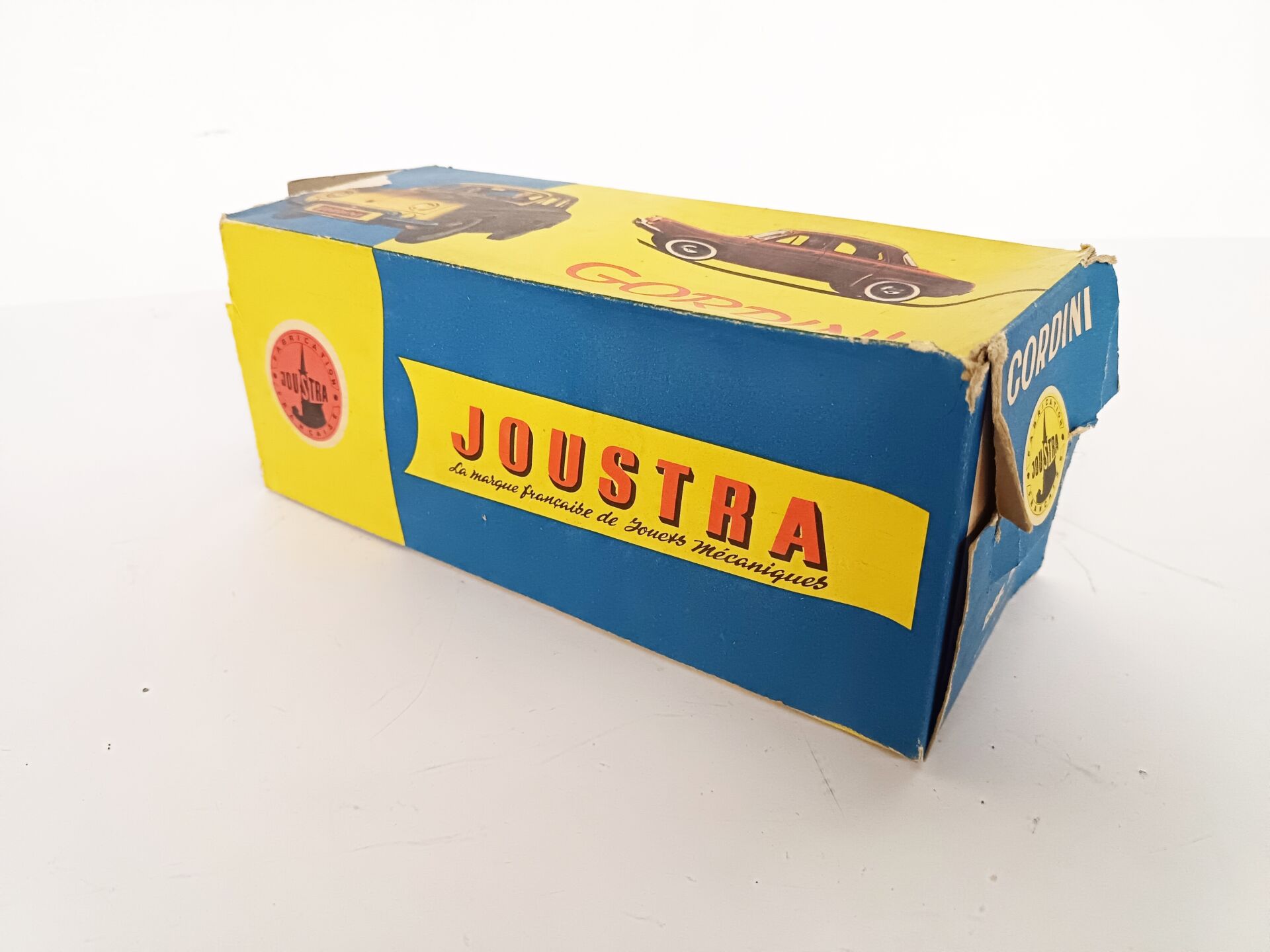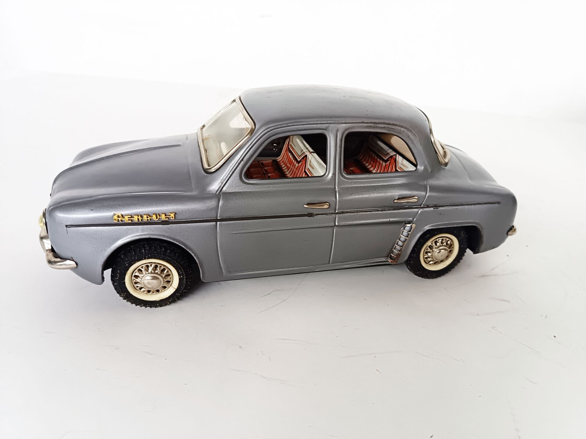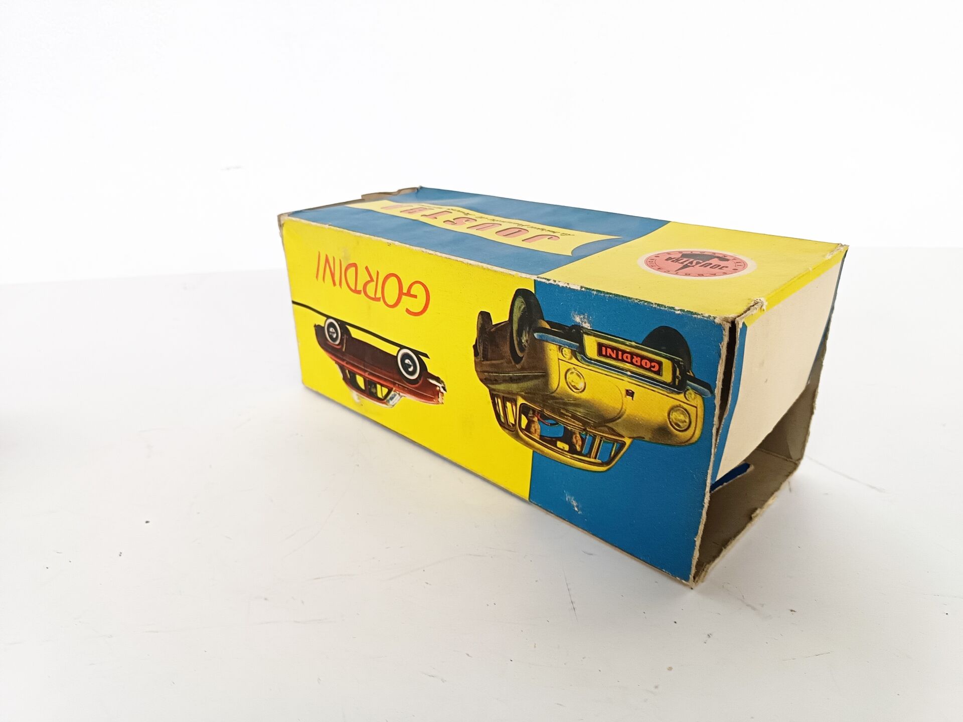 JOUSTRA. Renault Dauphine Gordini - jouet à friction en tôle peinte, L 31 cm -immatriculée 517 FL 34, Réf 2064 Boite défraîchie et 1 rabat manquant sinon bel état d'origine