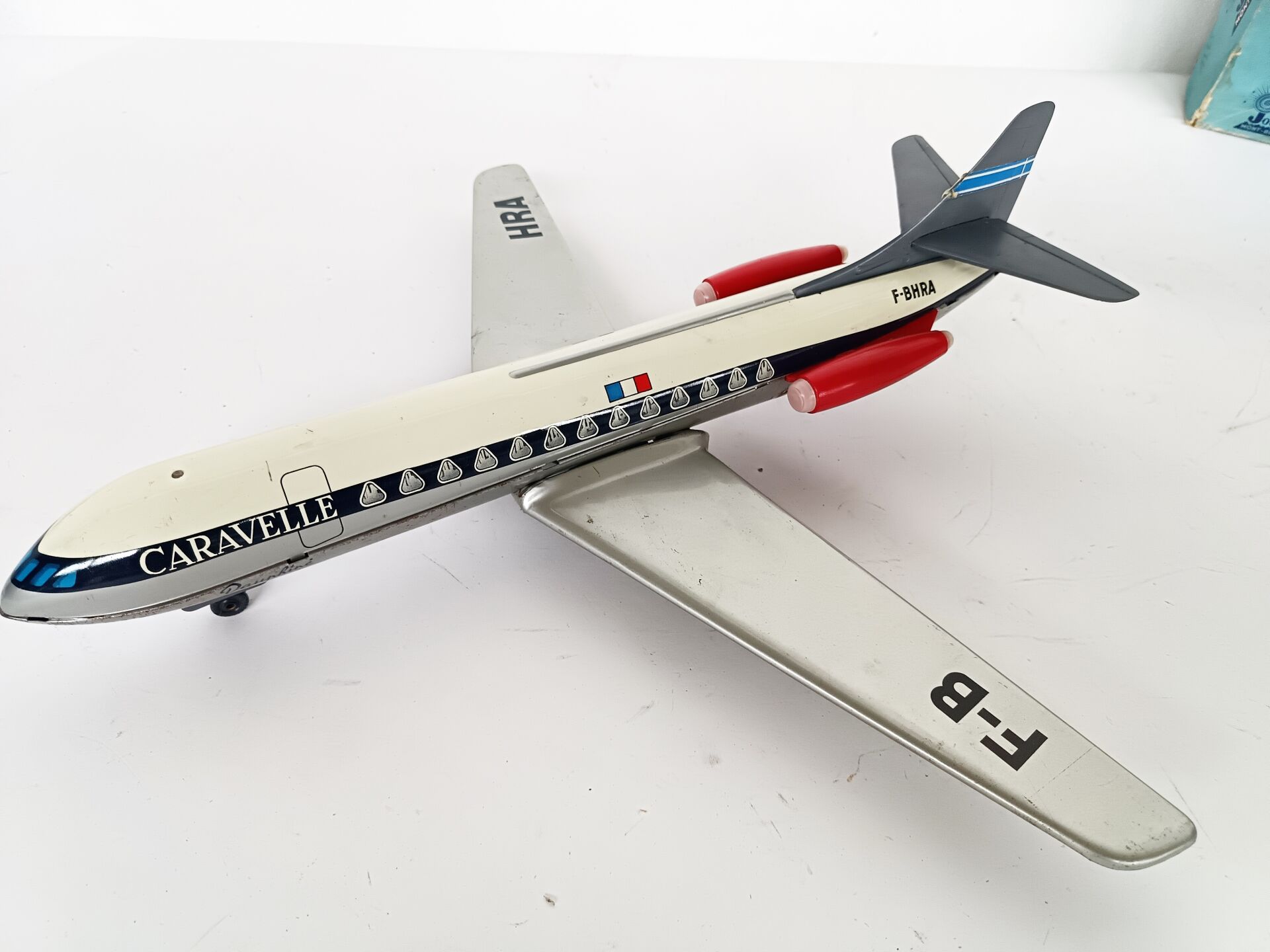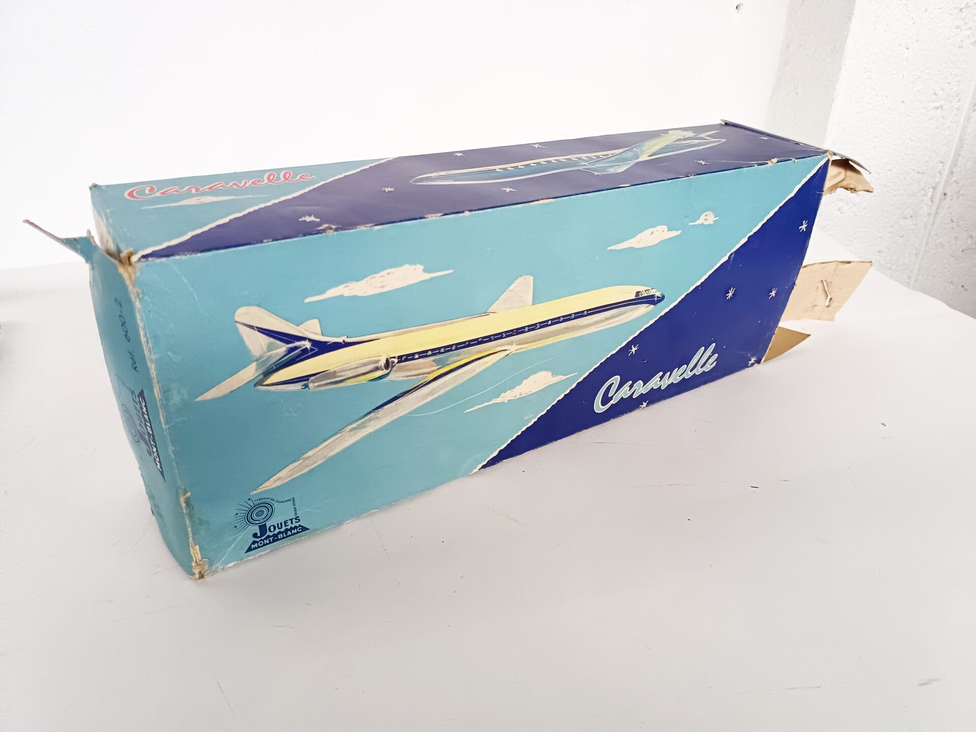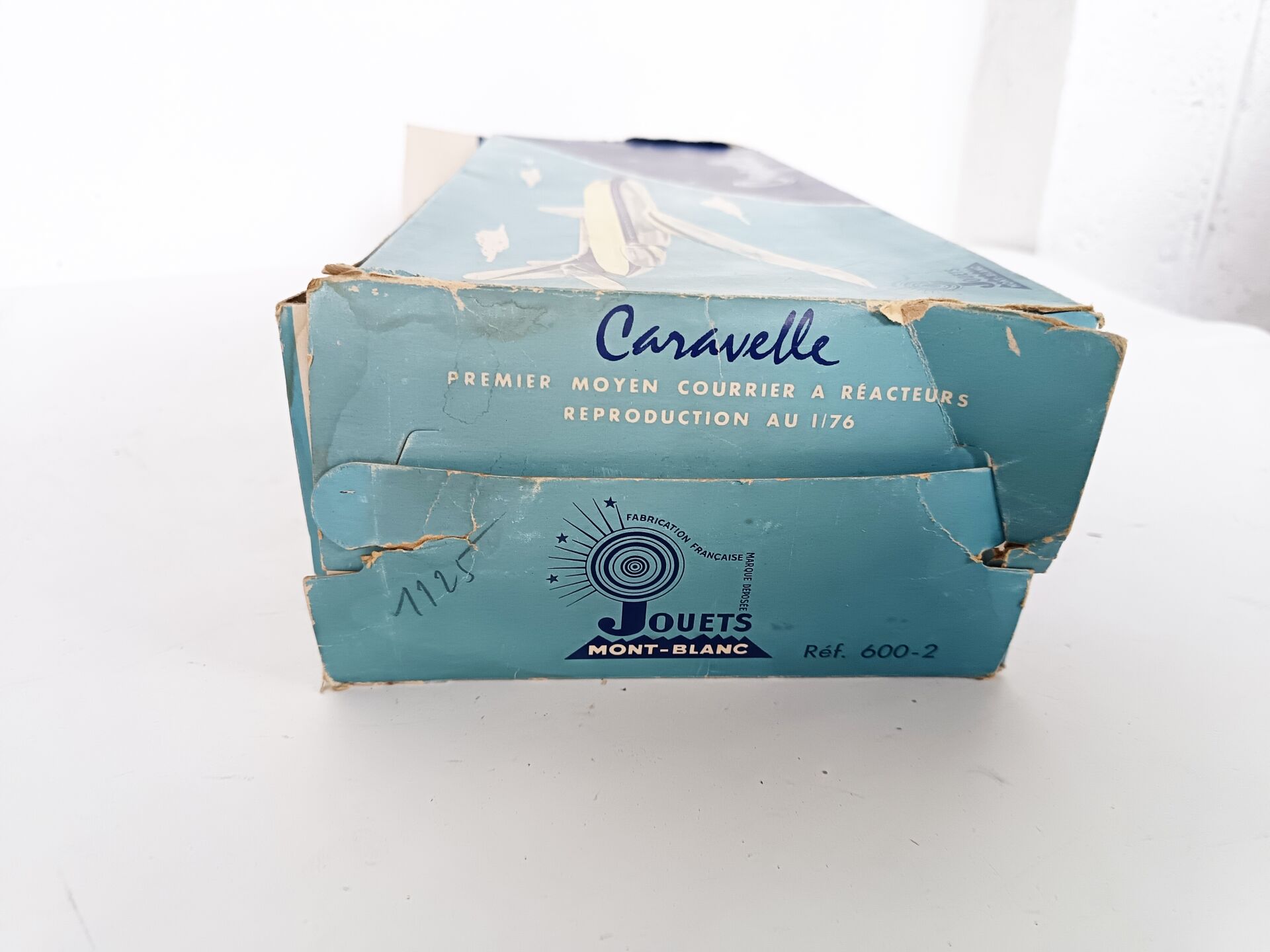 MONT BLANC. Caravelle à friction et piles, jouet en tôle lithographié en boîte d'origine (1 rabat manquant et boîte défraîchie), Immatriculation : FBHRA. Réf : 600-2 dimension 43x 45cm. A signaler : couvercle des piles à refixer sinon bel état d'origine