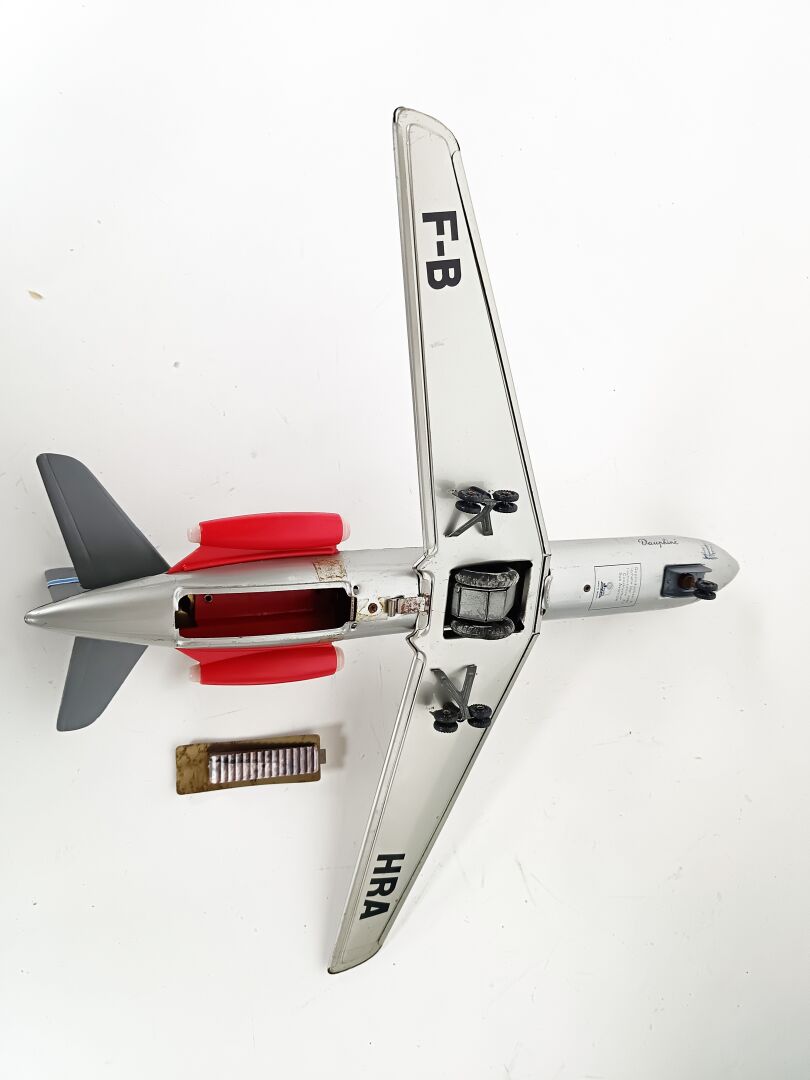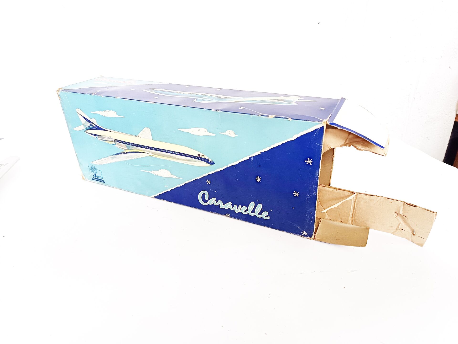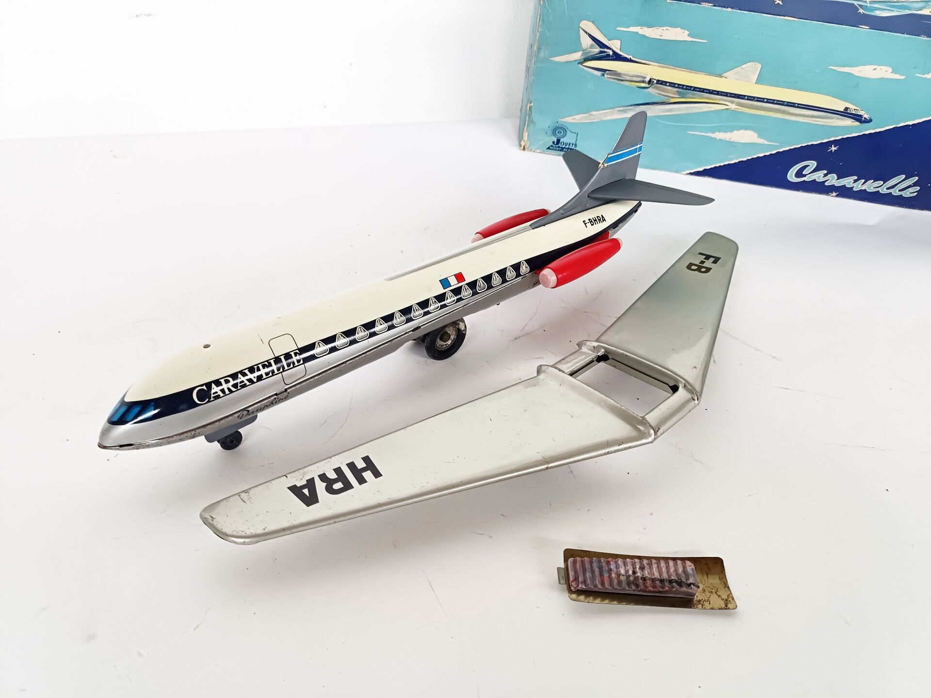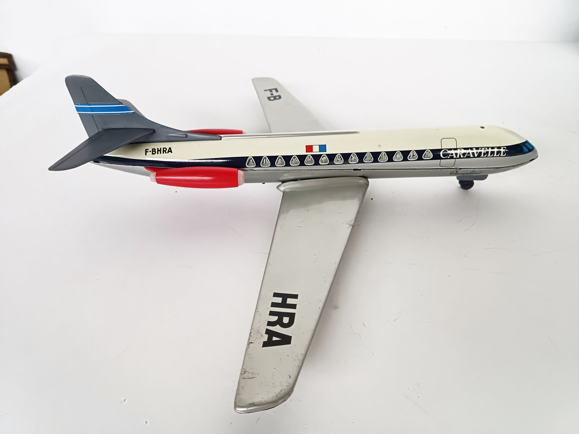 MONT BLANC. Caravelle à friction et piles, jouet en tôle lithographié en boîte d'origine (1 rabat manquant et boîte défraîchie), Immatriculation : FBHRA. Réf : 600-2 dimension 43x 45cm. A signaler : couvercle des piles à refixer sinon bel état d'origine