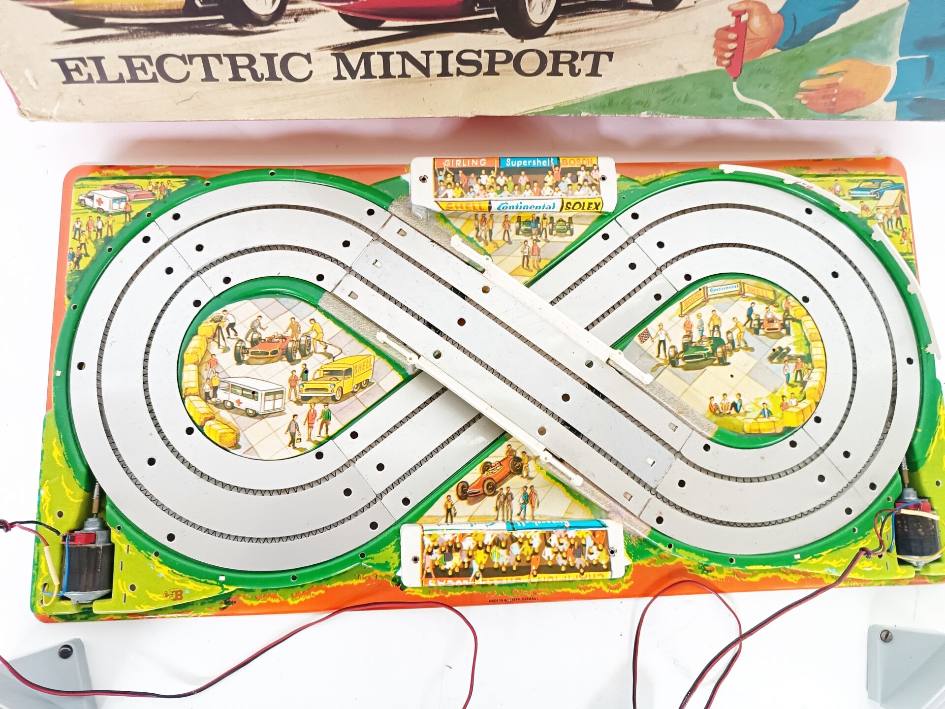 BILLER Germany, Electric Minisport. Petit circuit pour voiture de course comprenant une piste en 8, 2 joysticks. Réf 1410 A signaler : voitures manquantes et tribunes cache moteur à refixer. Boîte d'origine légèrement défraîchie. Dimensions : 46 x 23 cm. Vendu en l'état