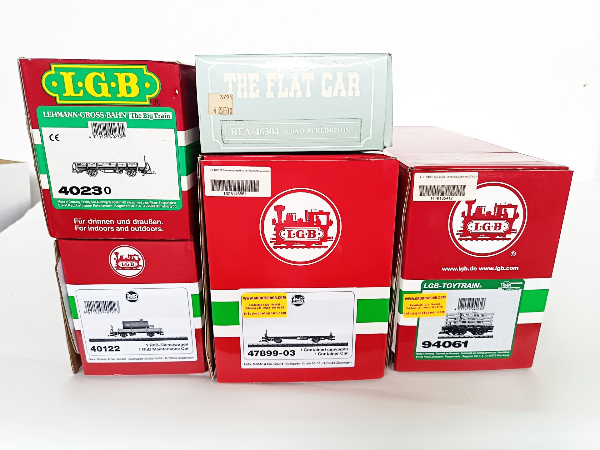 LGB - divers - écartement 1 - Lot comprenant 5 wagons de marchandises en boites d'origines dont 1 rancher charbonnier Réf 40230, 1 rancher Porte voiture Réf 40122, 1 bétaillère Réf 94061, 1 wagon plat porte container voitures Réf 47899-03 et 1 wagon plat de chez Rail Express Agency Réf 46304 Bel état en boites d'origines
