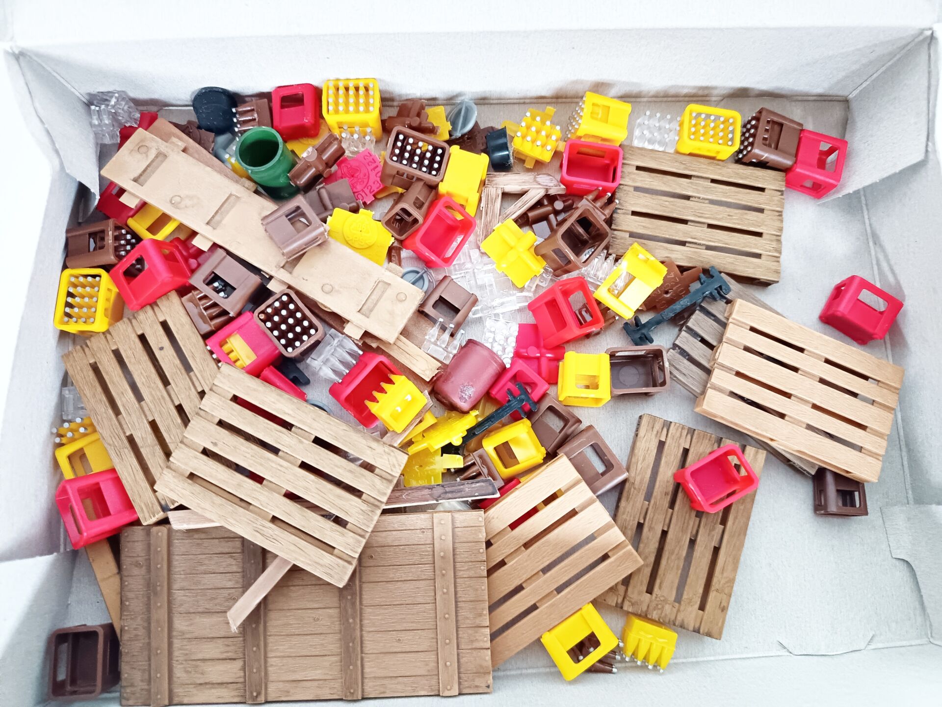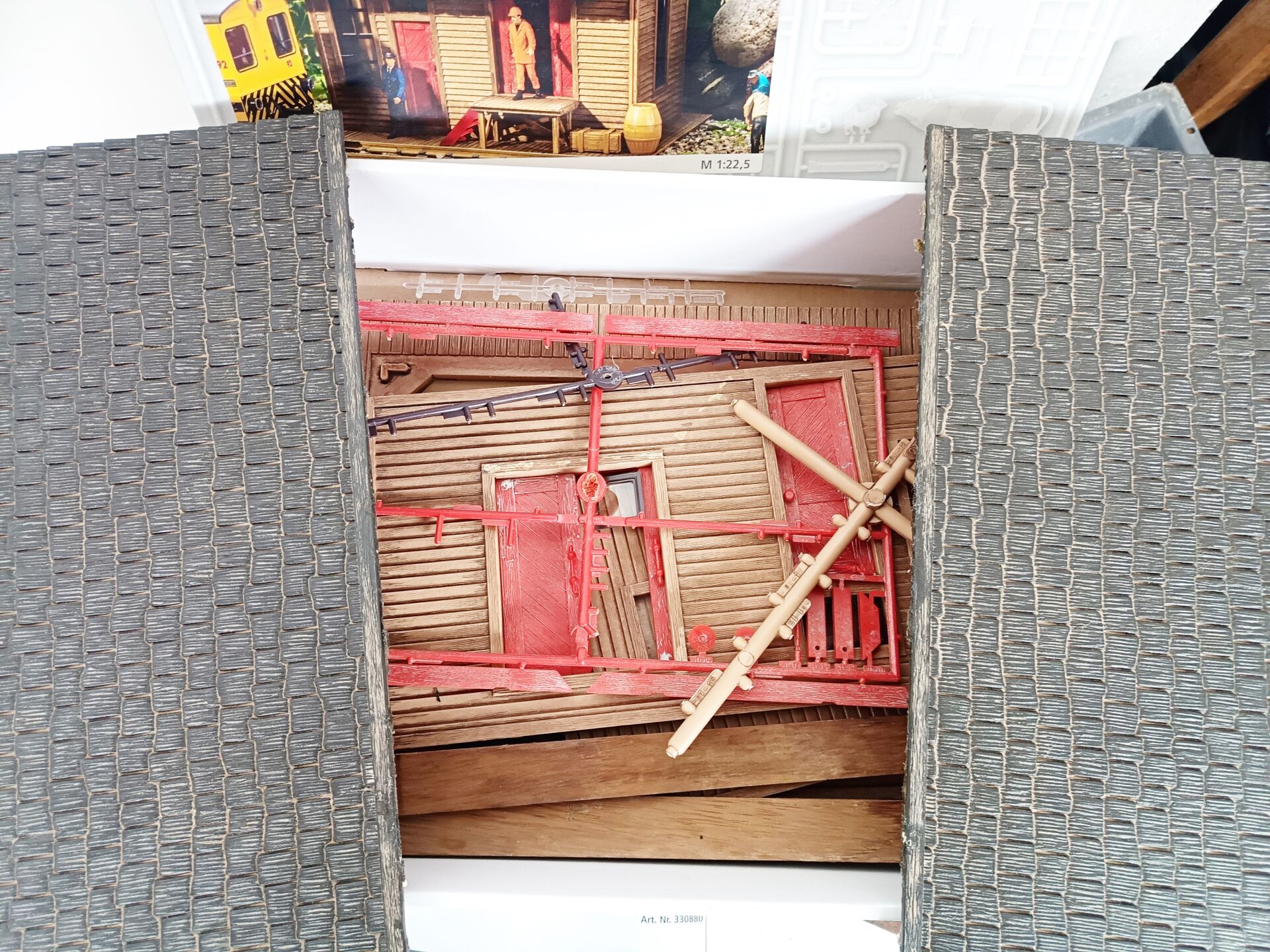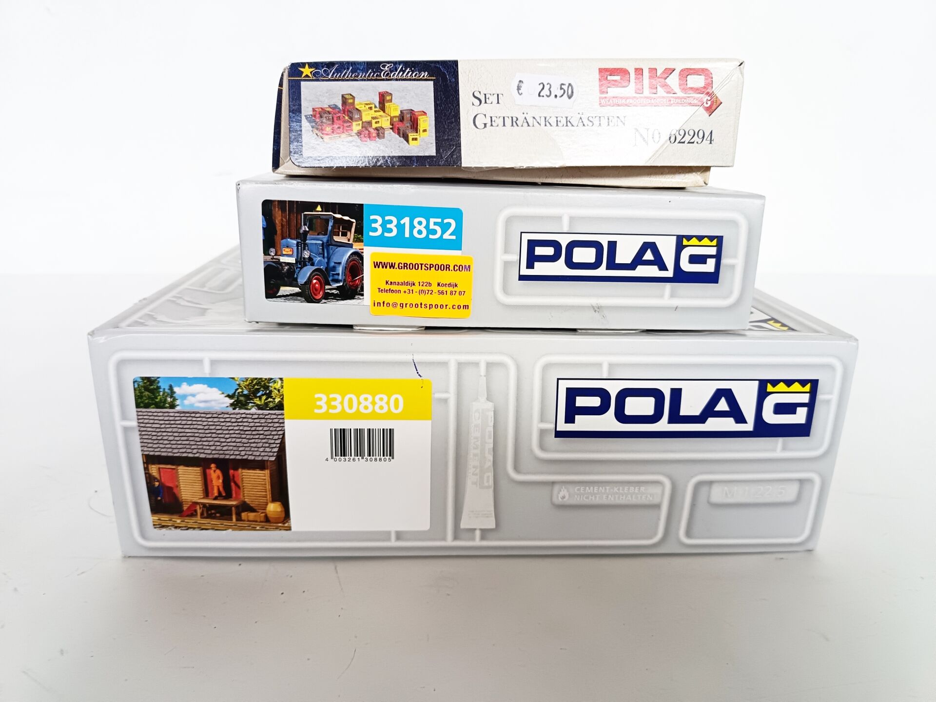 POLA G, PIKO, ,Écartement 1. Lot de 2 Maquettes à monter dont : - Le bureau / Hangar Notice (semble complet) Réf 330880, - le tracteur Réf 331852 (semble complet) et de chez Piko On y joint 1 set de casiers de boissons (incomplet). Vendu en l'état