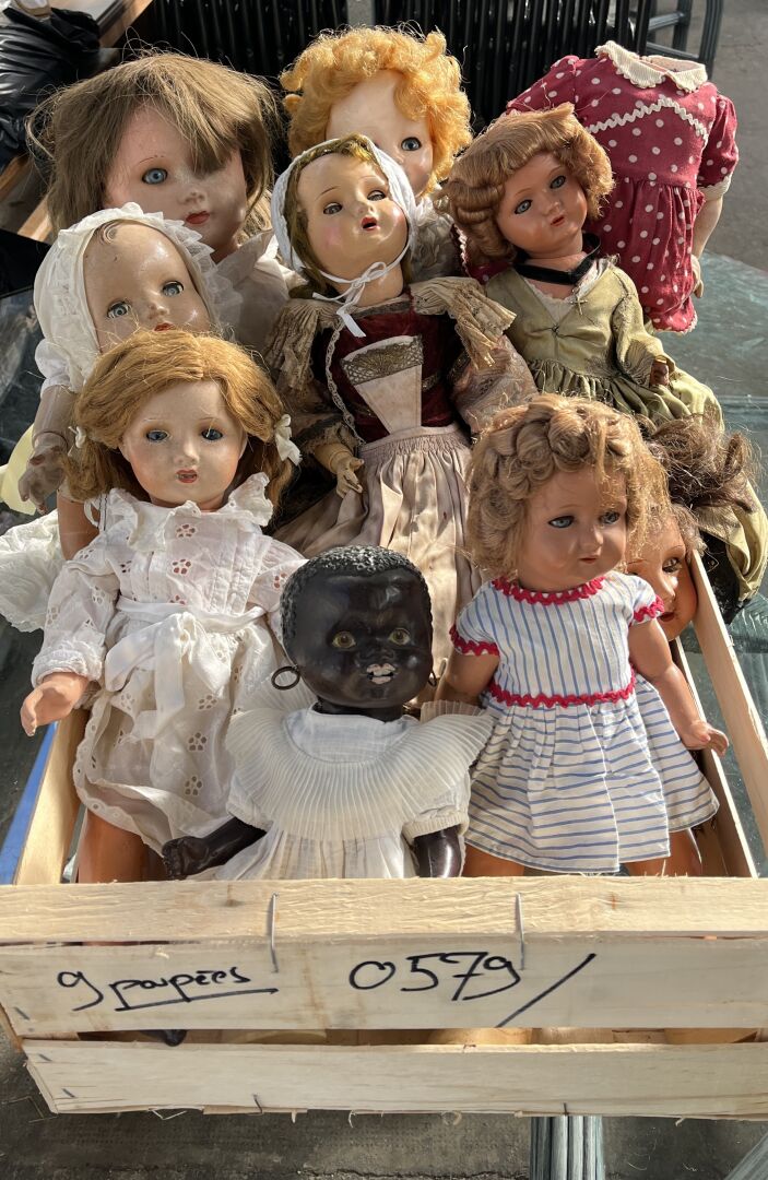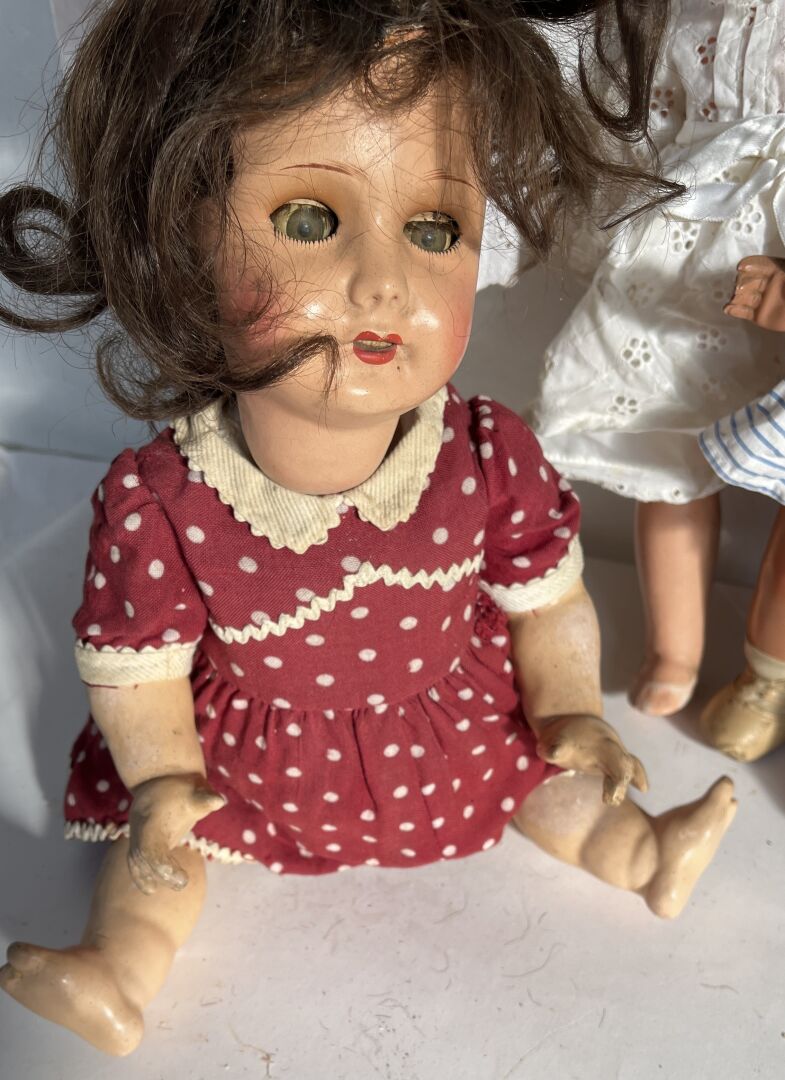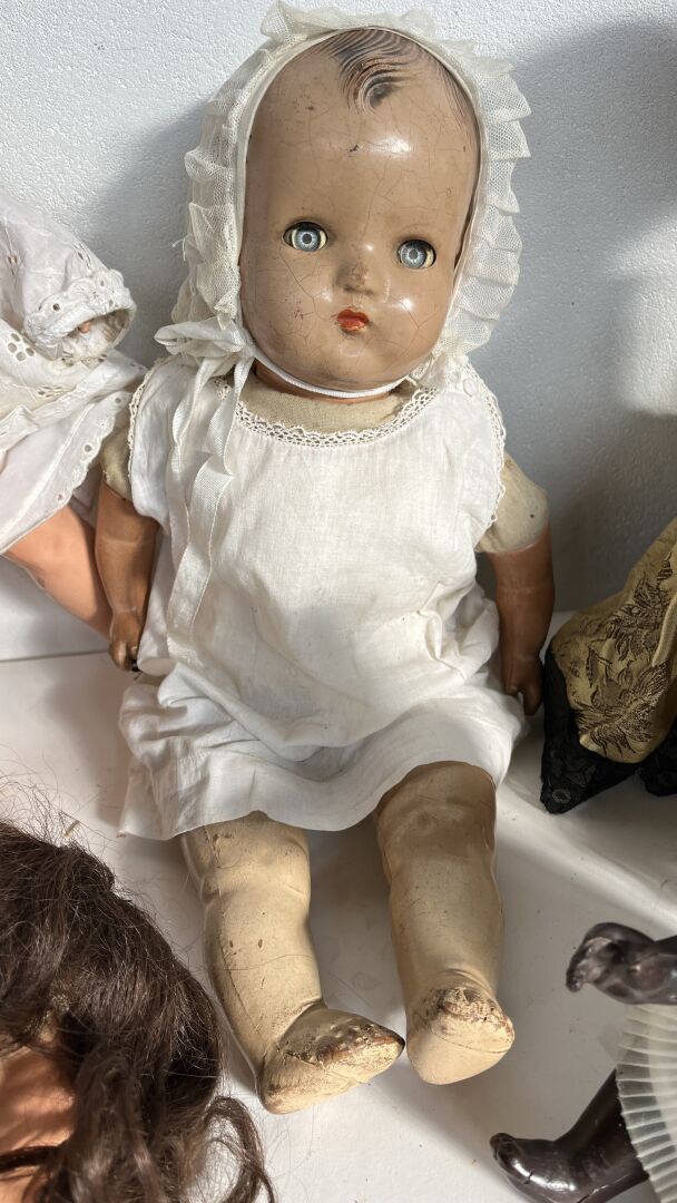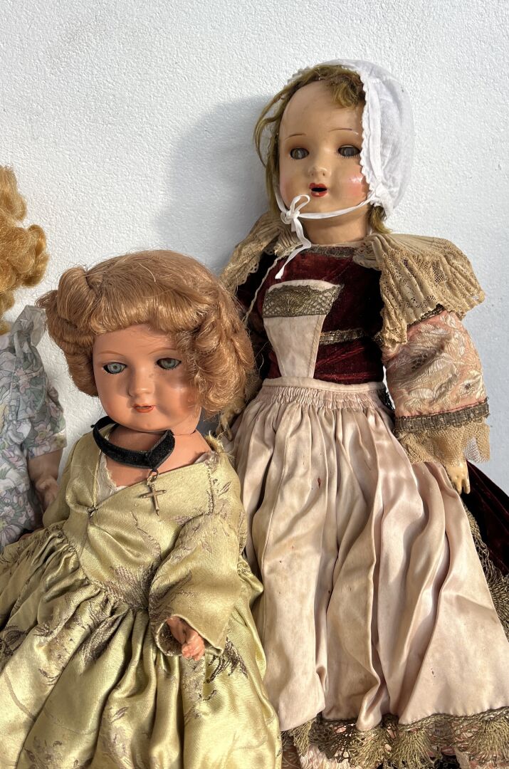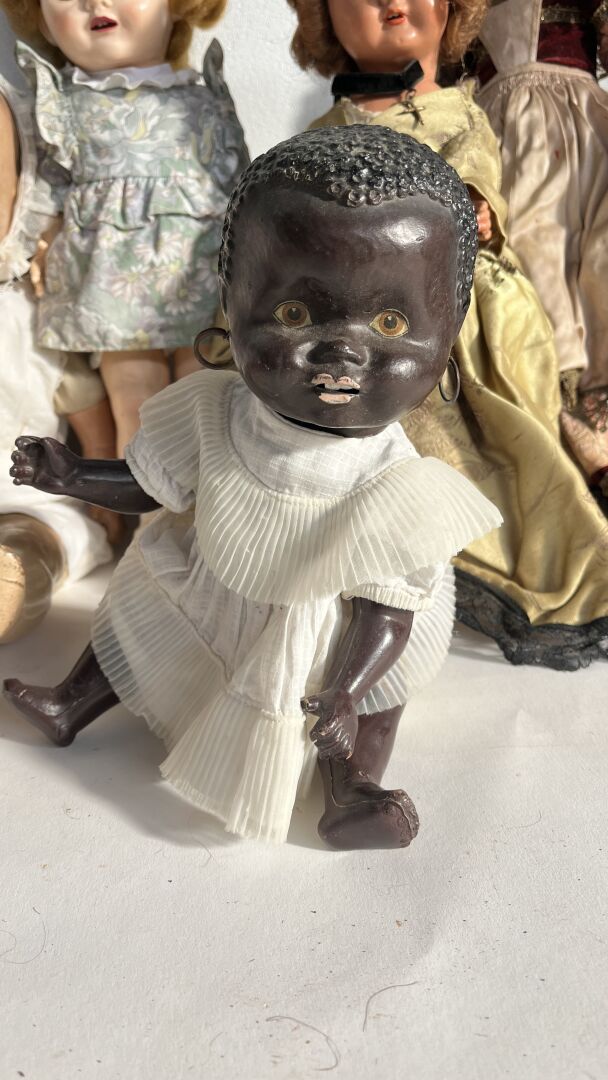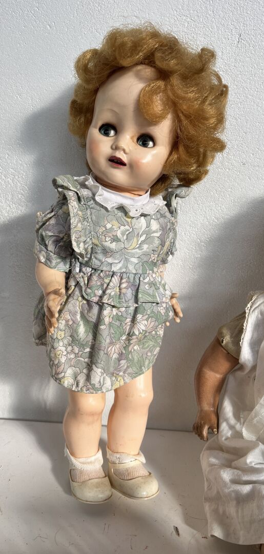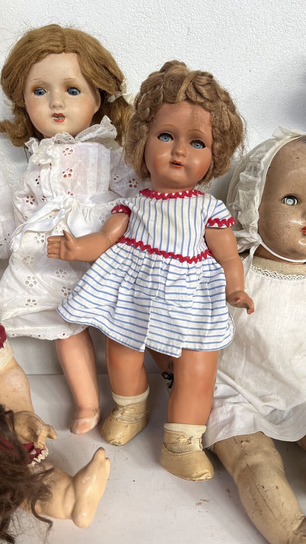 Pedigree (England), Unis France et divers. Lot de 9 poupées à tête en composition ou rhodoïd, dont une marcheuse Unis France moule 301 (H 70 cm), marcheuse avec système sonore de chez Pedigree (H 41 cm), etc… Bon état à passable. Vendu en l'état