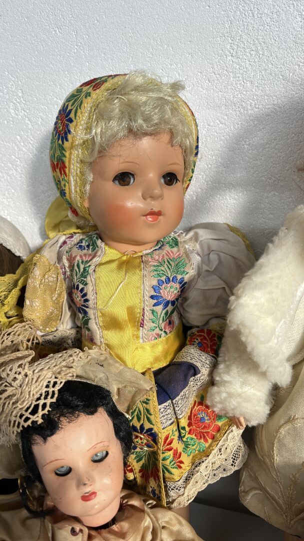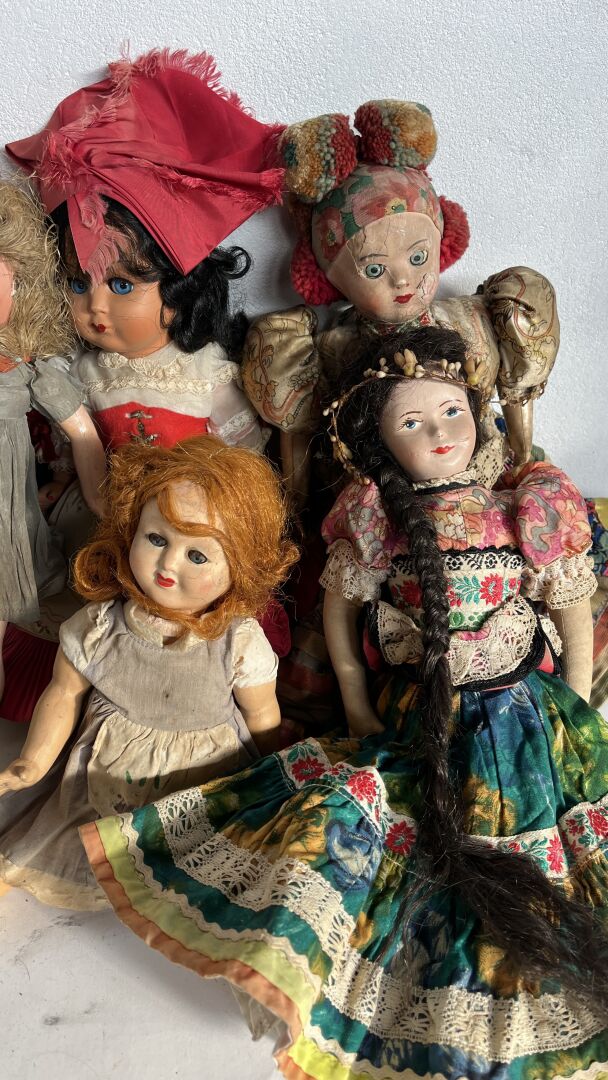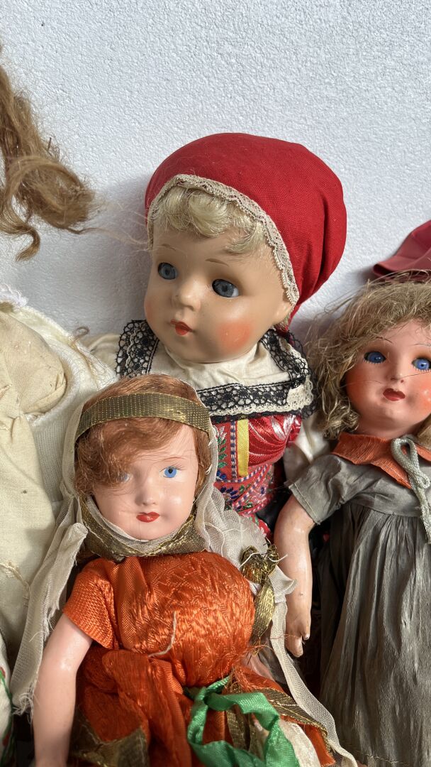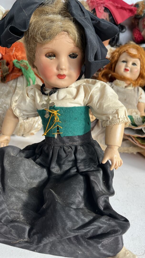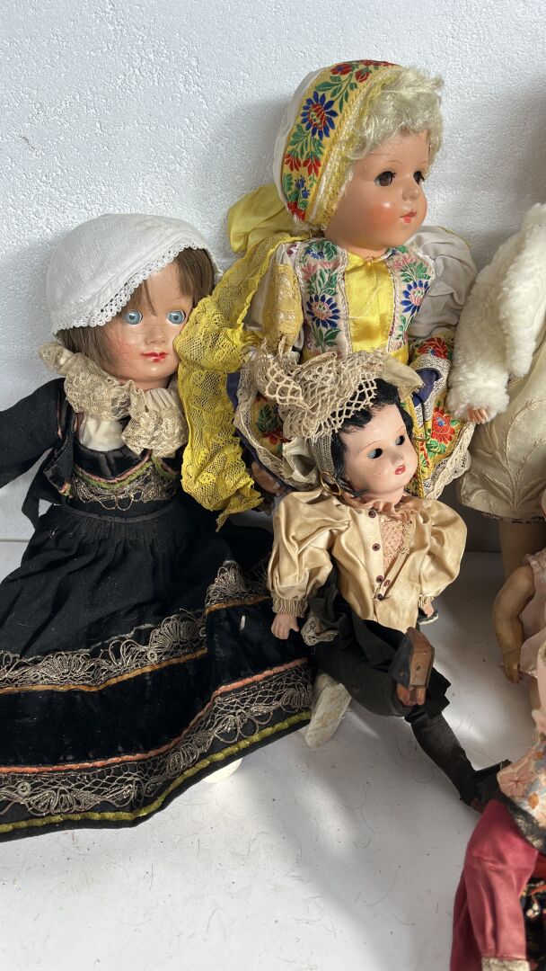 SFBJ, GéGé, etc... Lot de 14 poupées à tête en composition, corps en composition ou tissus, costume folklorique et autres. Bon état à passable. Vendu en l'état. H de 24 à 44 cm
