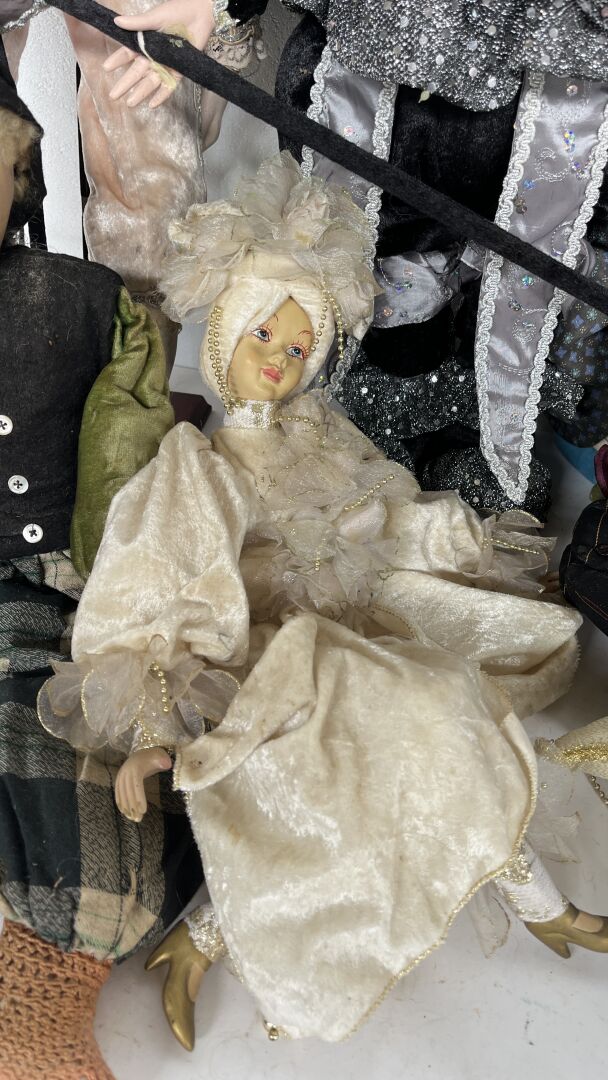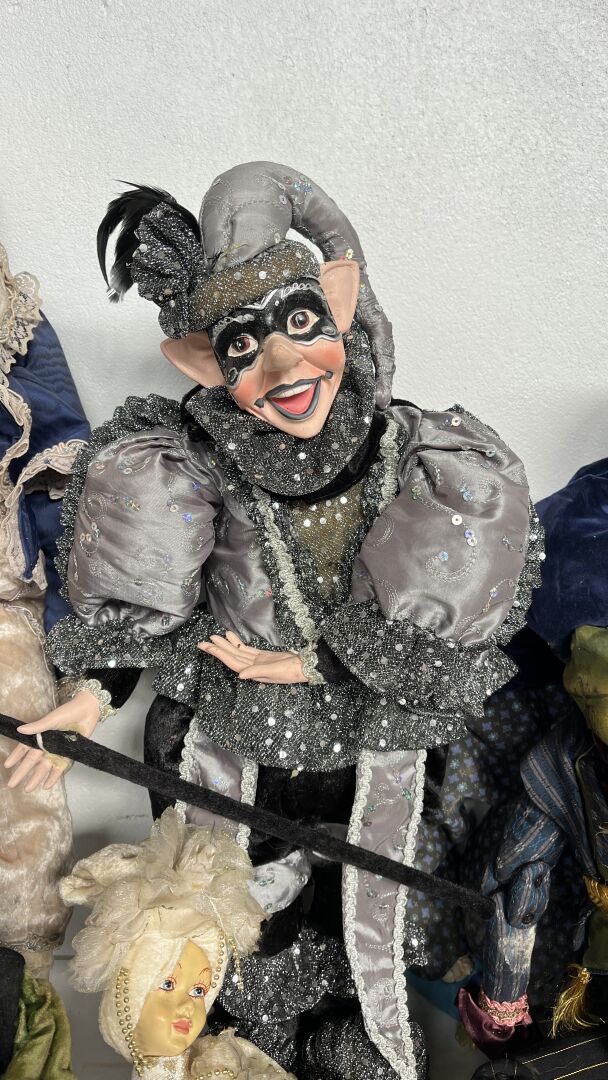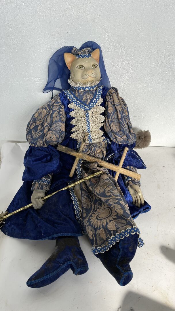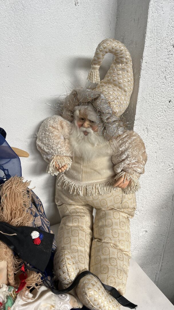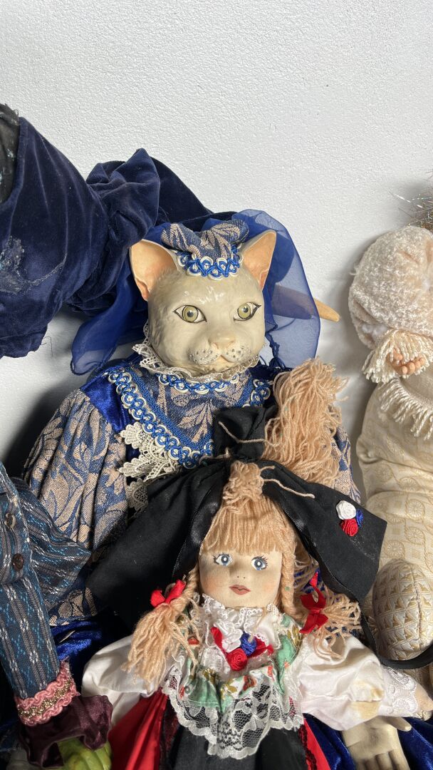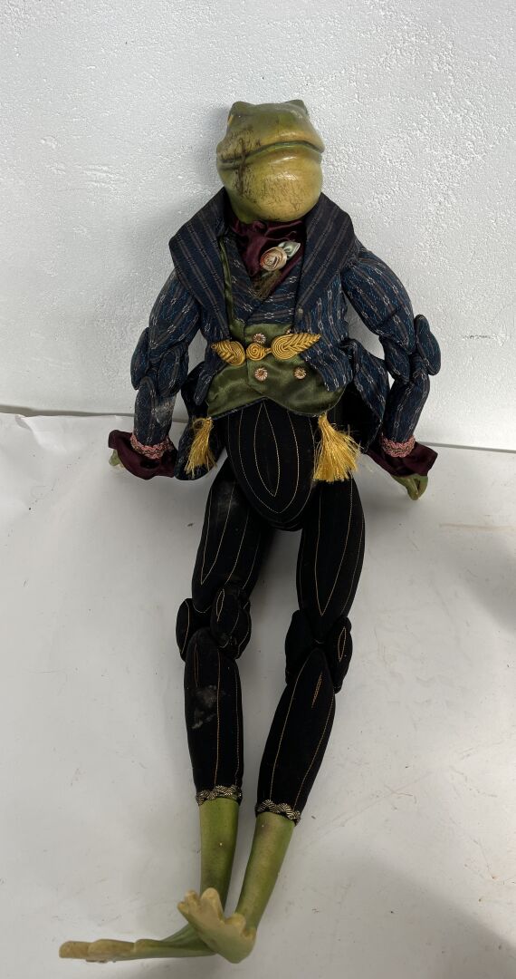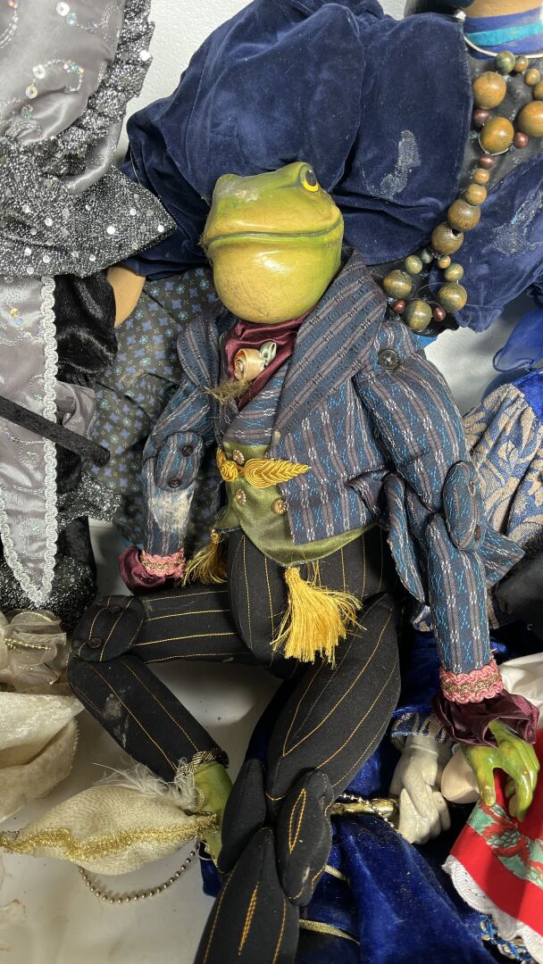 Lot de poupées moderne dont poupée zoomorphe Grenouille, marionnette Zoomorphe La Fée chatte, Automate à musique avec mouvement de la tête, Polichinelle, Père noël, poupée de chiffon…. H de 32 cm à 70 cm. Bel état