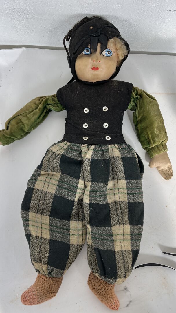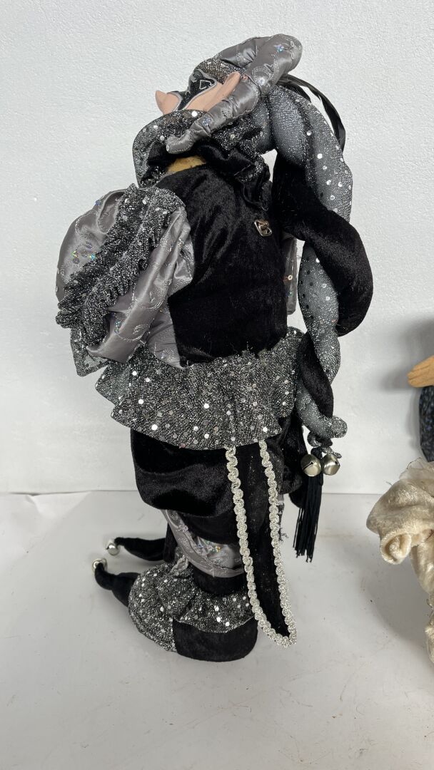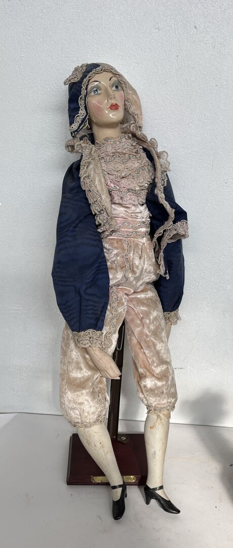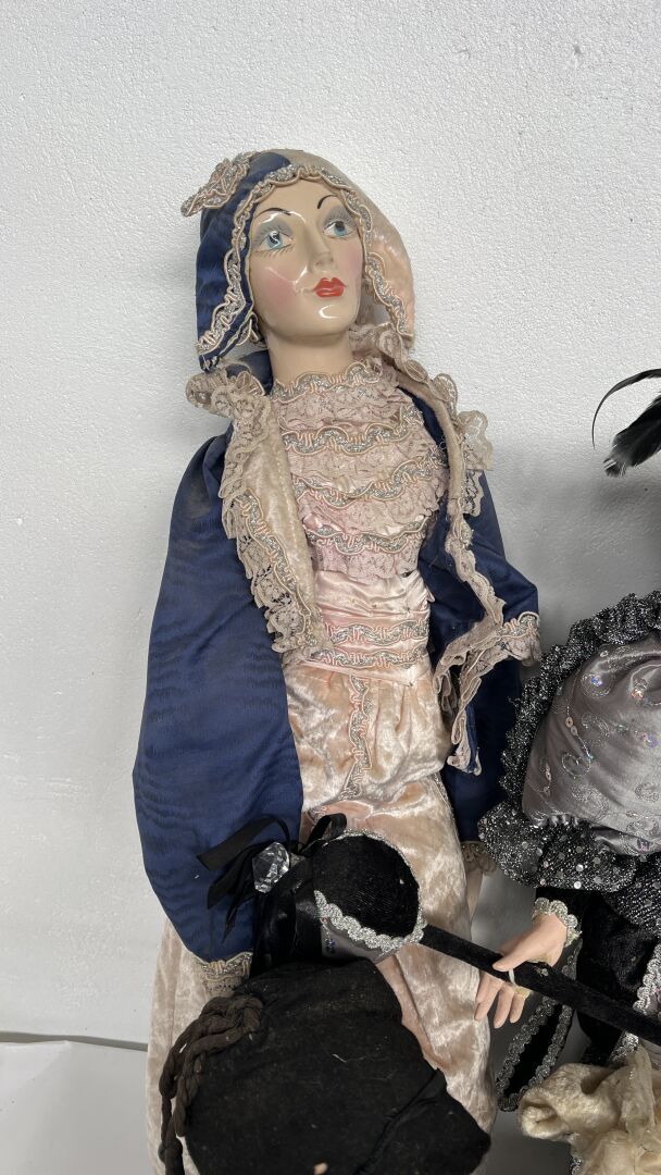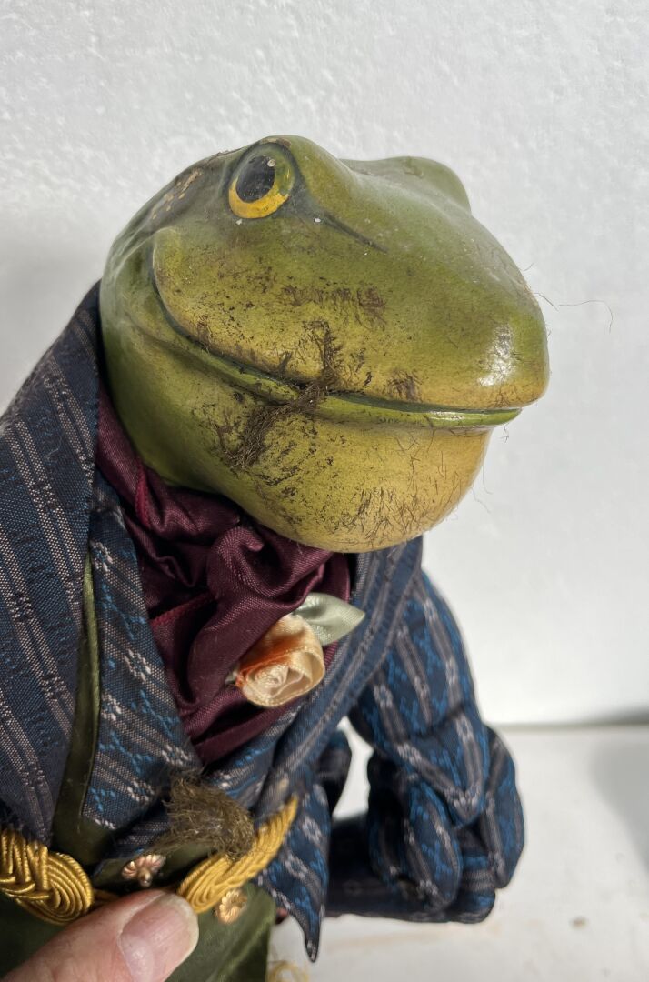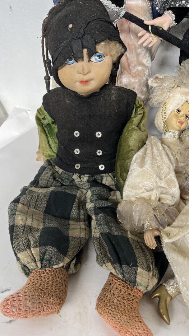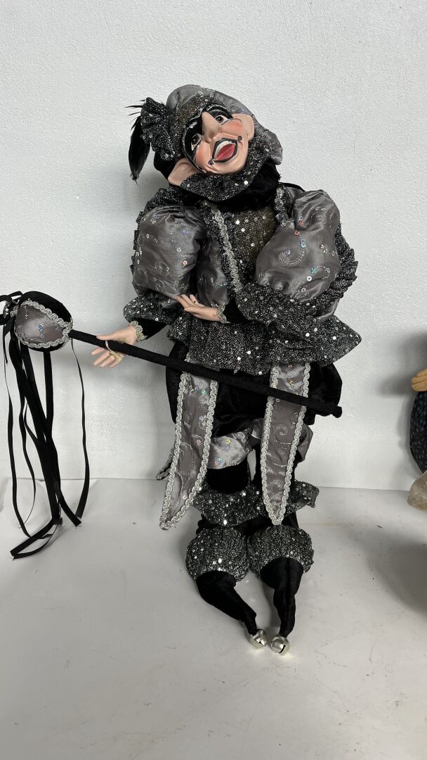 Lot de poupées moderne dont poupée zoomorphe Grenouille, marionnette Zoomorphe La Fée chatte, Automate à musique avec mouvement de la tête, Polichinelle, Père noël, poupée de chiffon…. H de 32 cm à 70 cm. Bel état