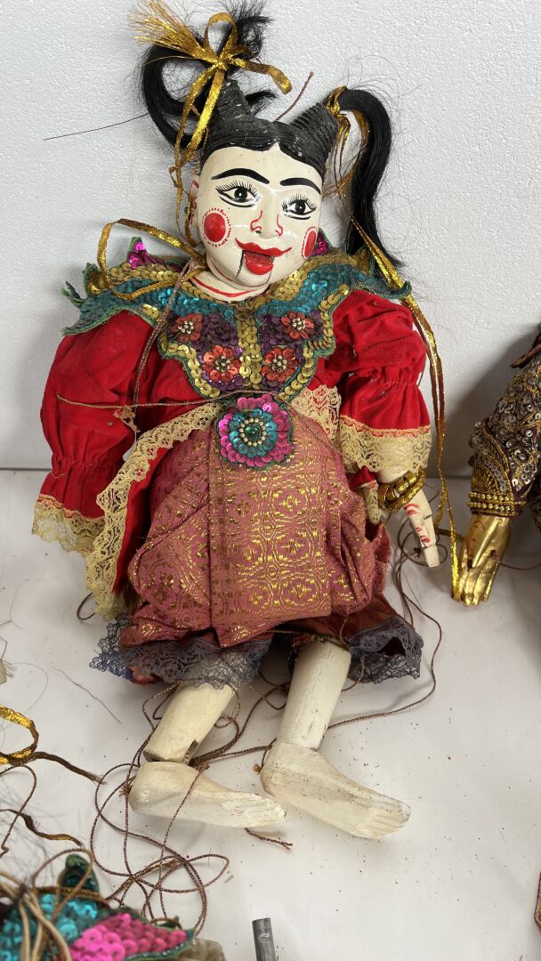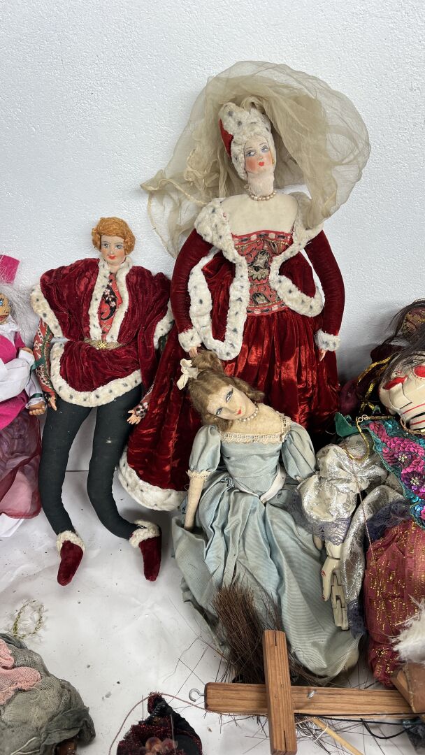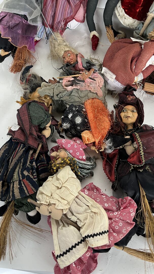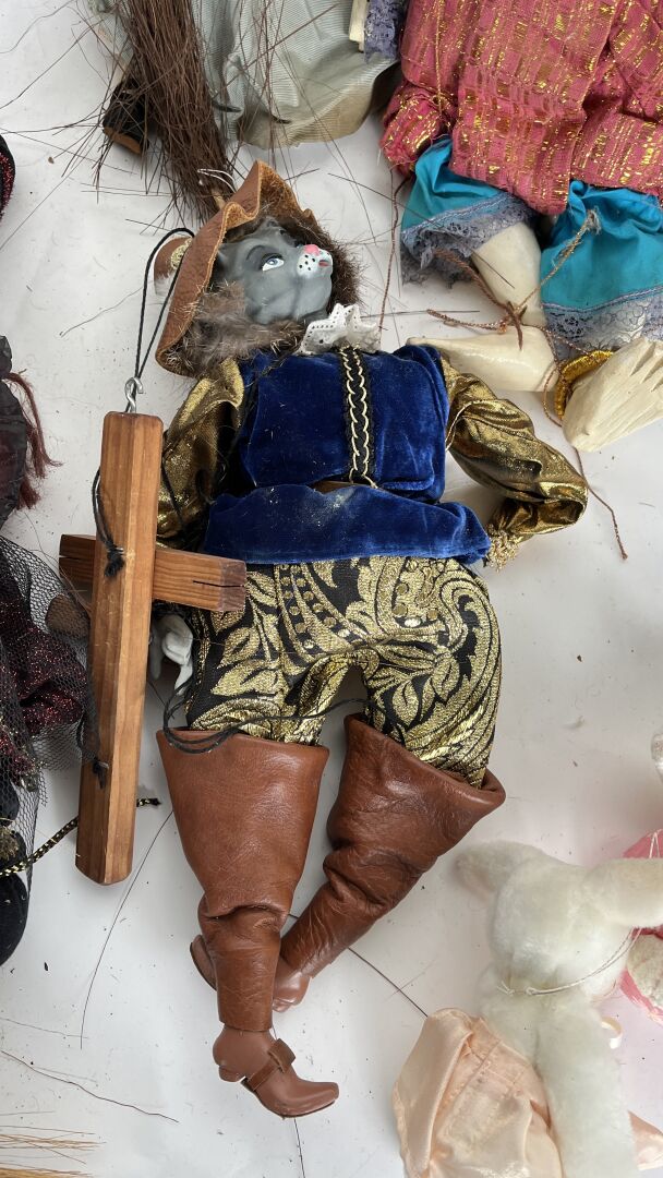 Lot de 20 poupées et marionnettes contemporaines dont 8 sorcières pour Halloween, poupées en tissus peint, marionnettes à fil, Le chat botté, 3 x Birmanes, Etc.. Vendu en l'état