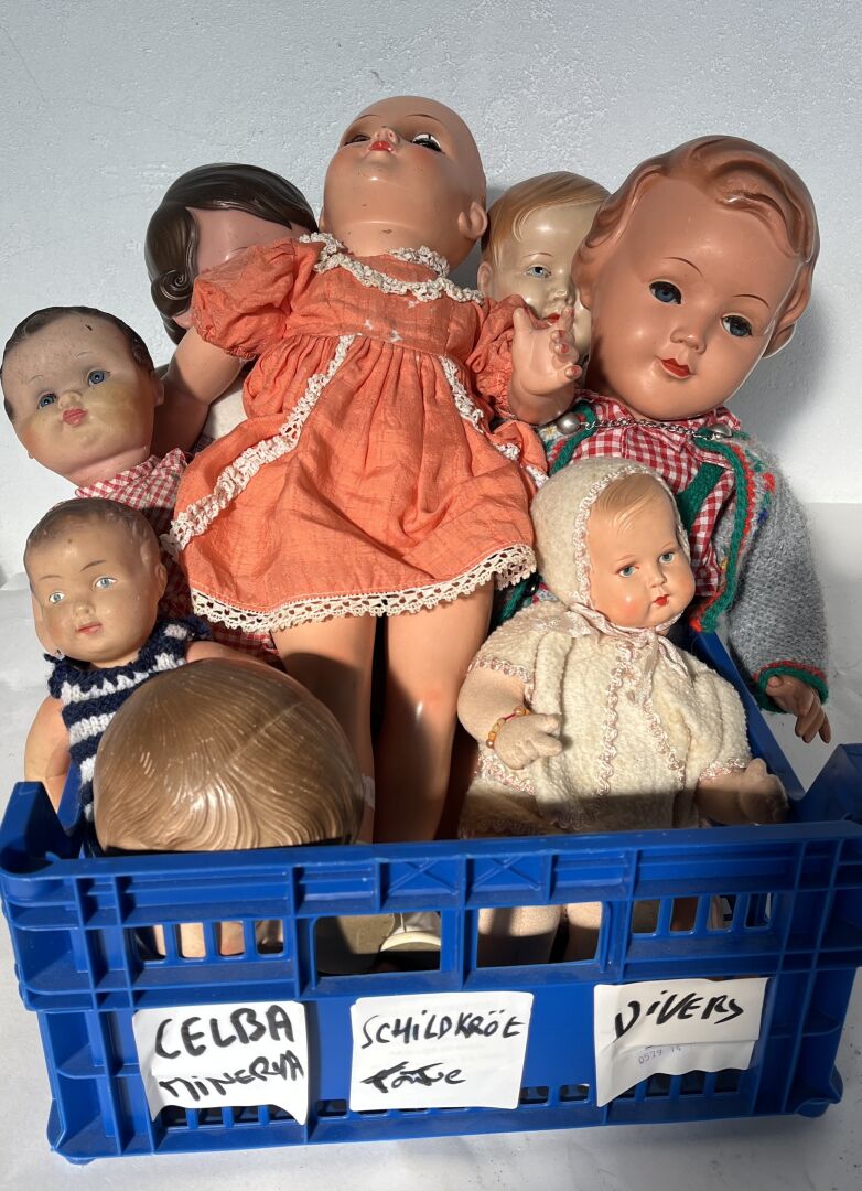 SCHILDKRÖT, Celba Minerva, et divers. Lot de 7 poupées, poupons en celluloïd. Accidents et manques (1 jambe) - H de 24 à 47 cm Vendu en l'état