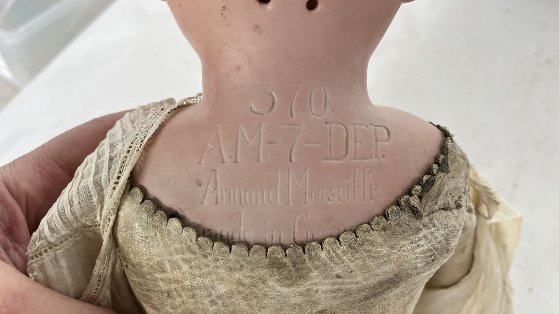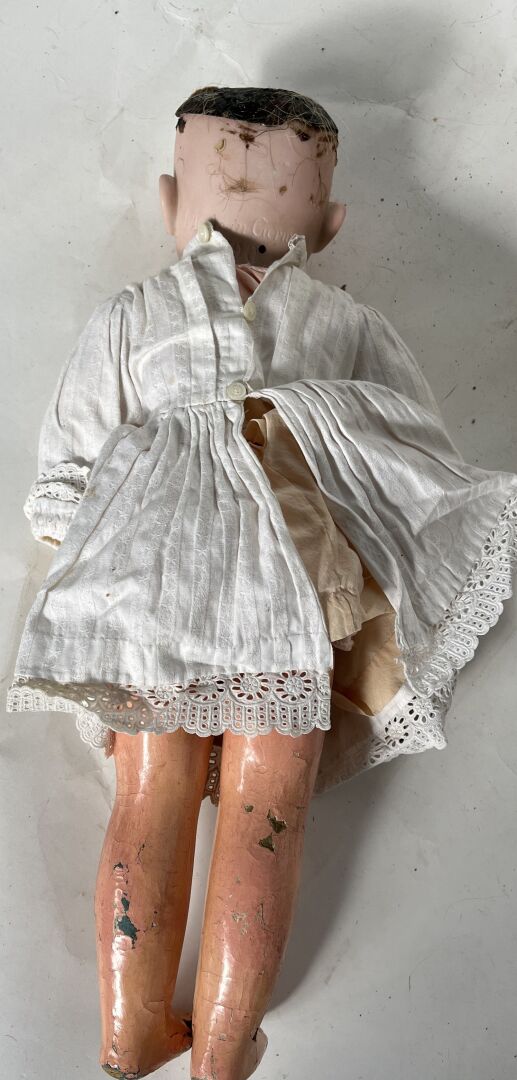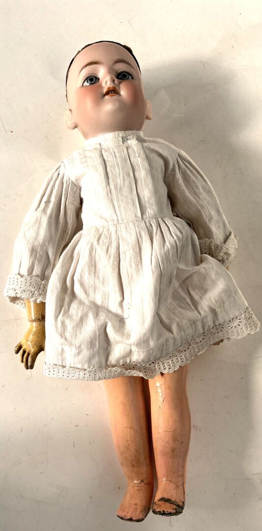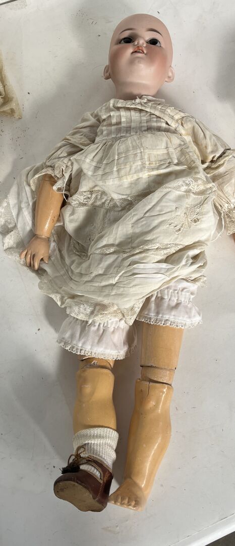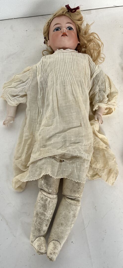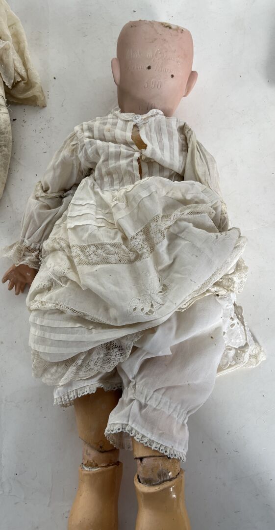 Armand Marseille Germany. Lot de trois poupées dont - deux moules 390 taille 5,5 (H48 cm) : une avec corps non d'origine composé de plusieurs éléments différents et une de taille 10 (H 70 cm) et une tête cou fixe moule 370 taille 7. - une corps type mannequin en cuir, avant bras en biscuit (pouce droit cassé, avant bras gauche cassé et recollé, articulation des jambes par rivet (H64 cm). L'ensemble est vendu en l'état