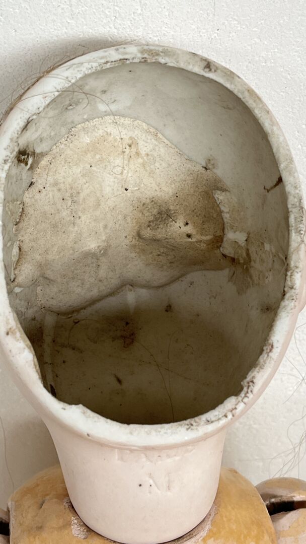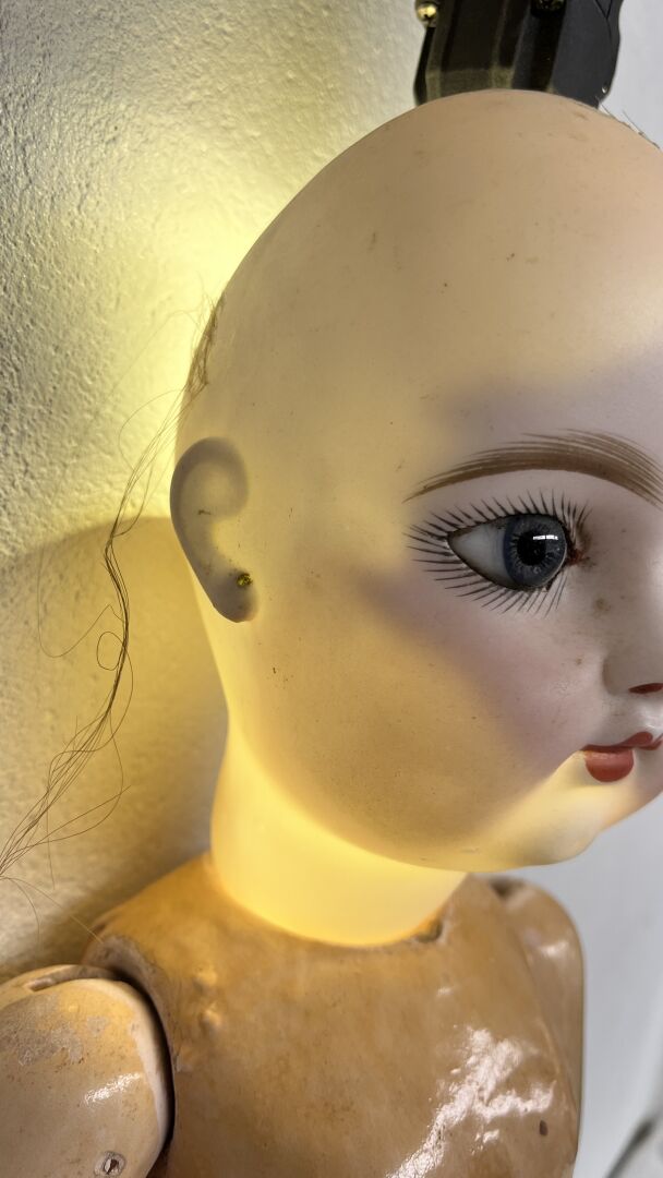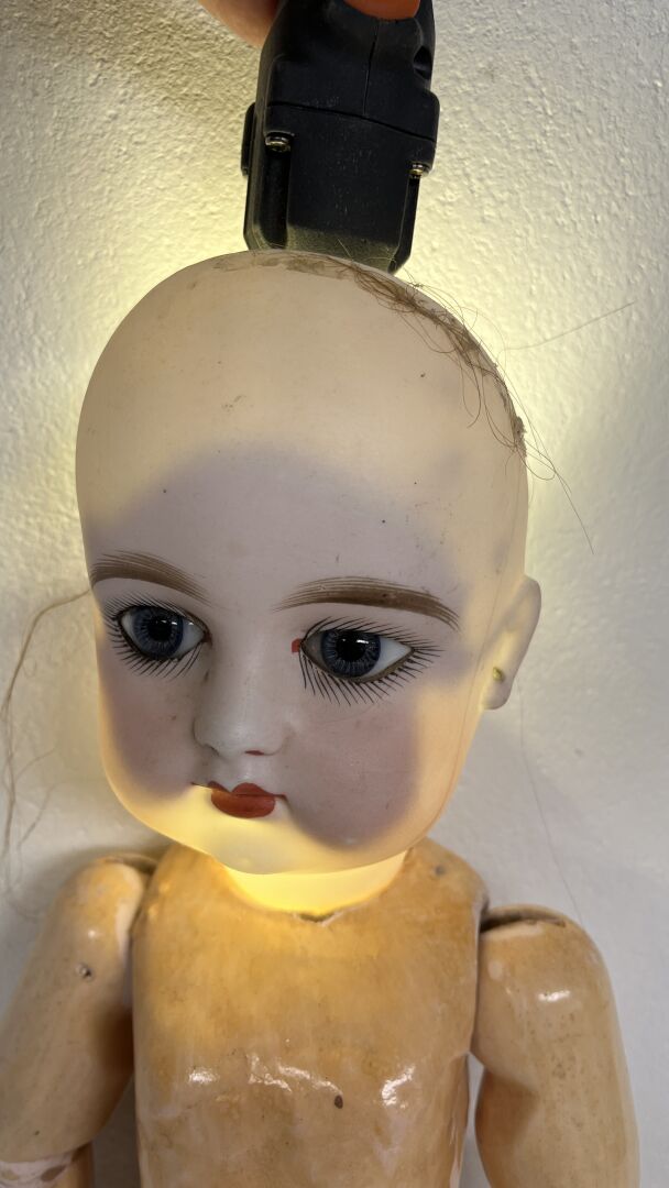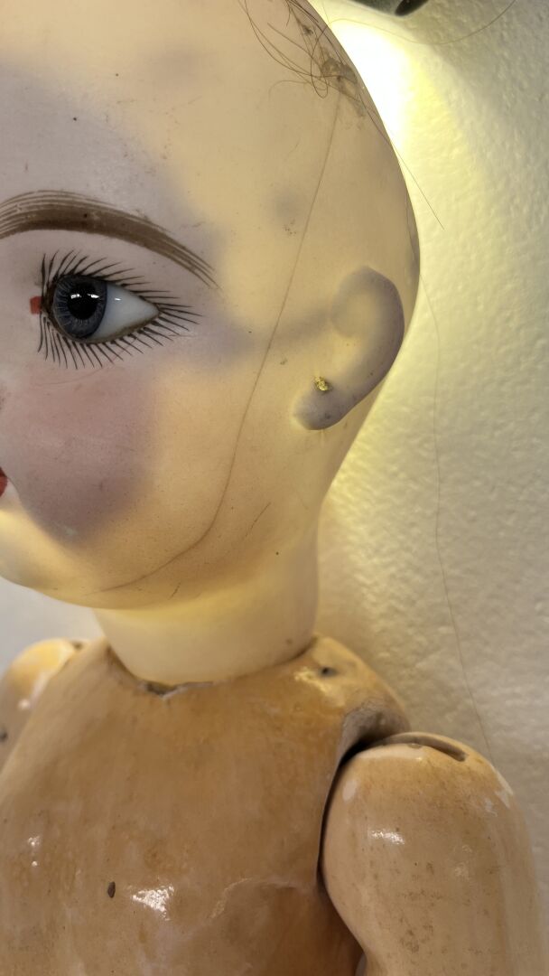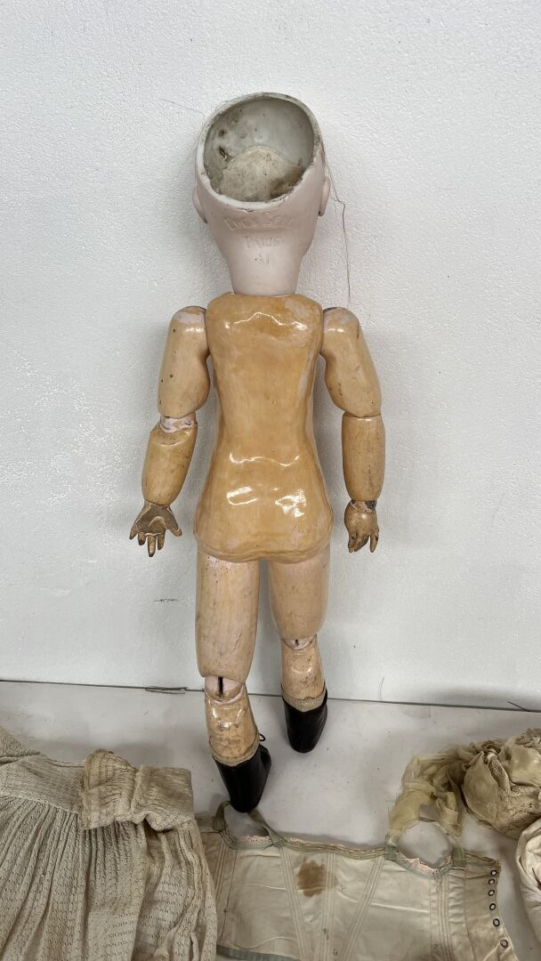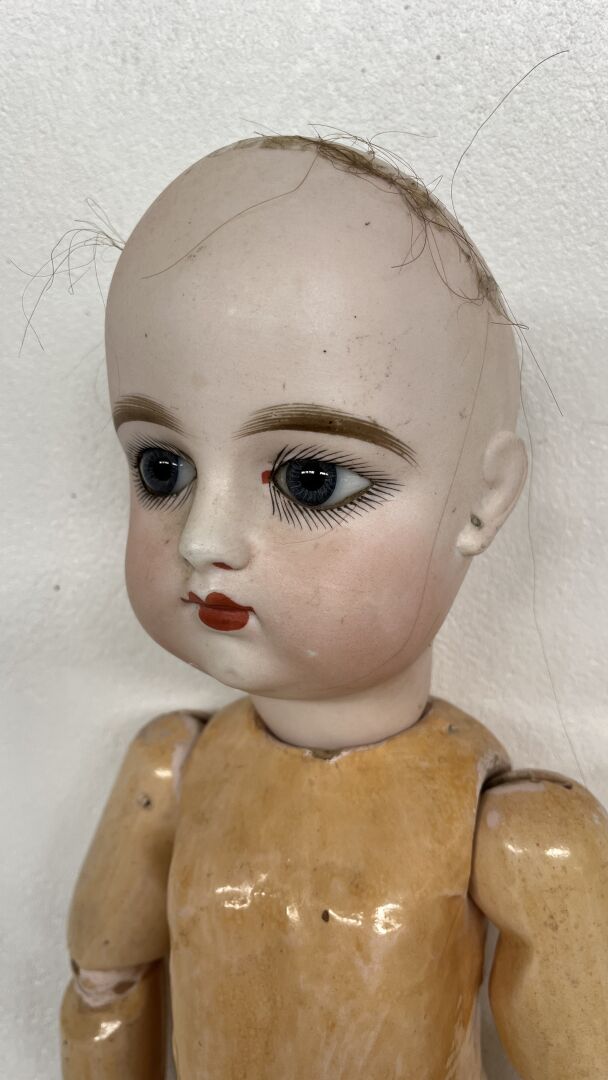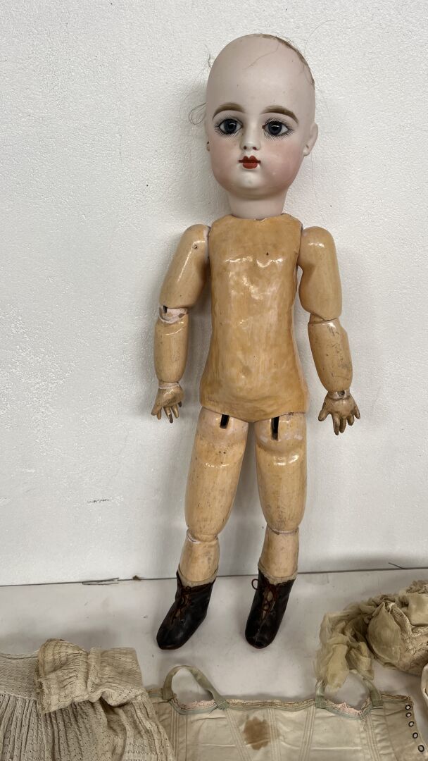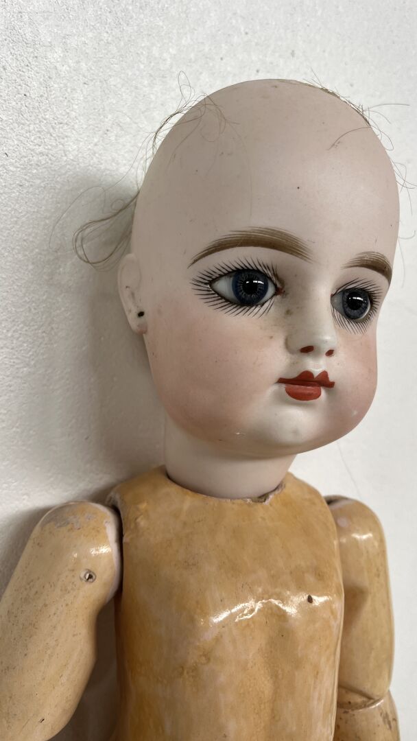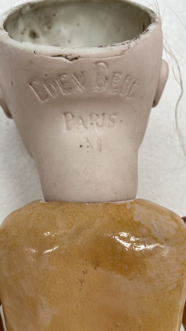 Eden bébé France, XIXème. Poupée à tête en biscuit coulée, bouche fermée, yeux bleus fixes, marqués en creux « Eden bébé Paris M ». Tête fixée sur un corps en bois et composition (d'origine?). Accident au doigt de la main gauche à poignet souple. Vêtements et chaussures anciens. H : 62 cm A Signaler - La tête présente un fêle du côté gauche partant de la tempe jusqu'au menton. Vendu en l'état