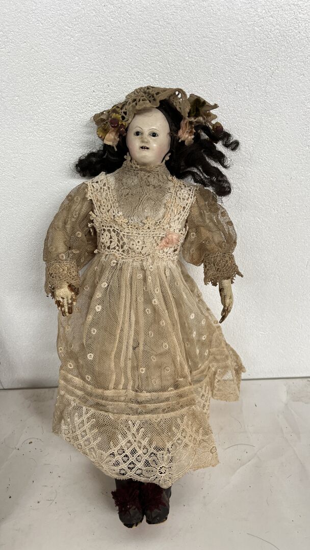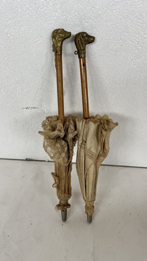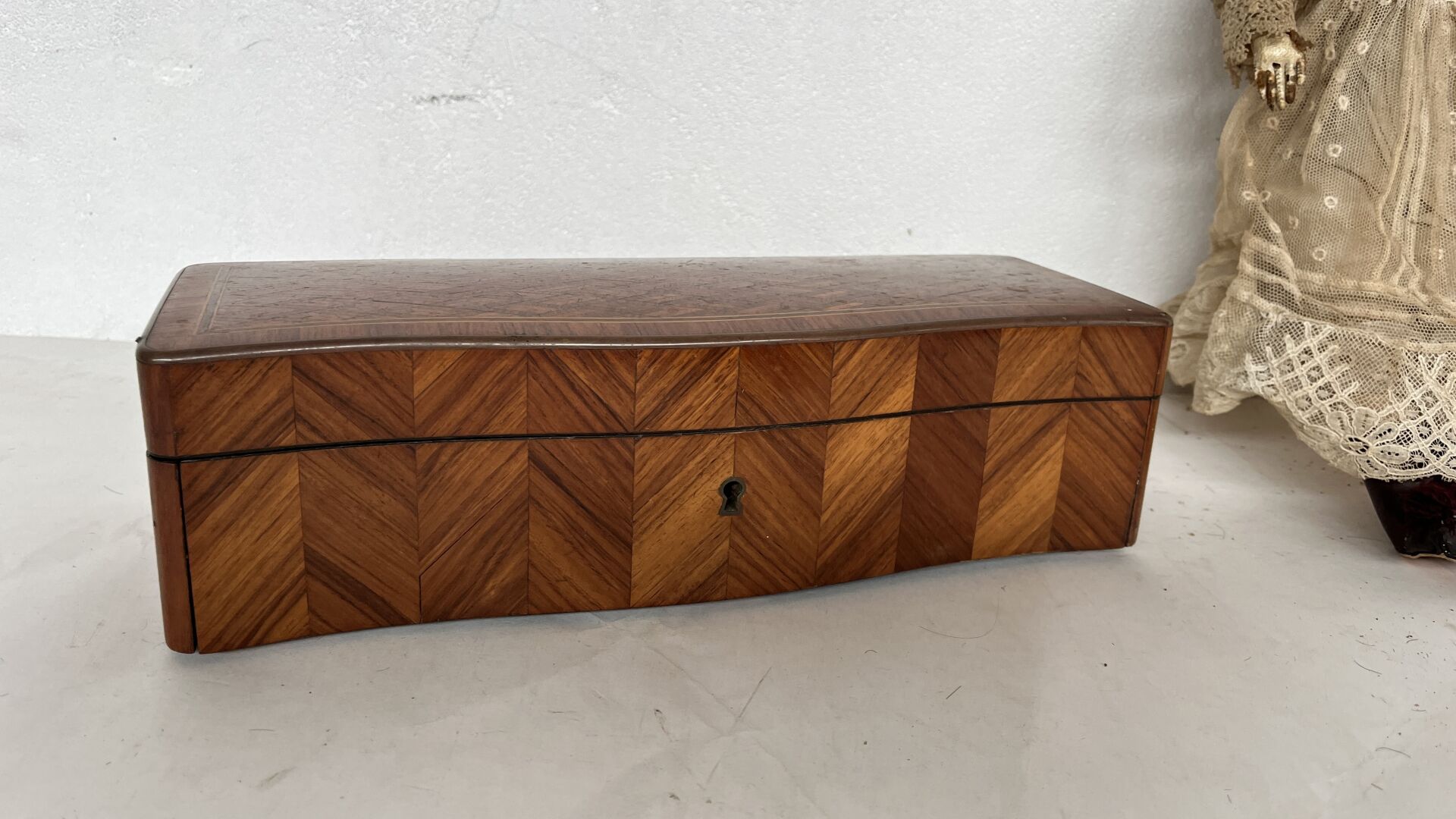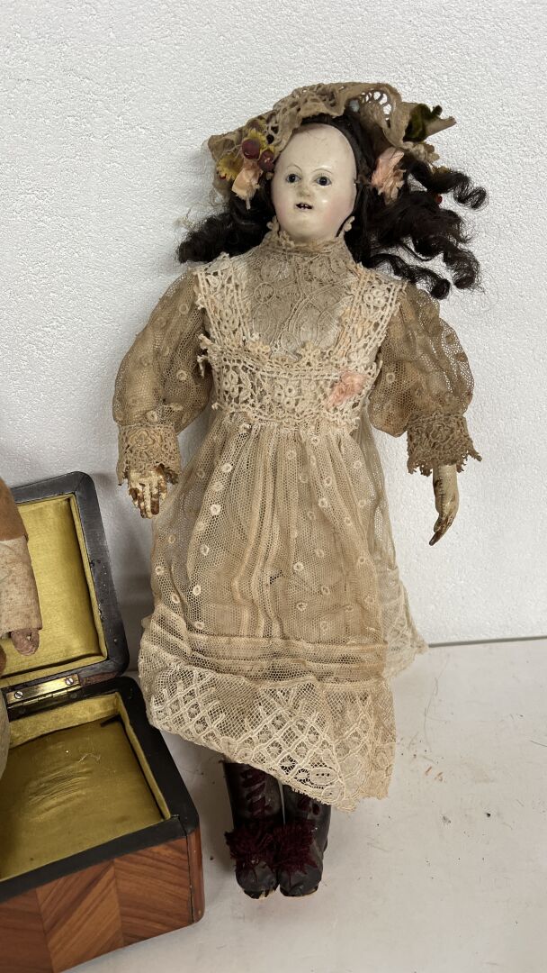 Lot comprenant : - une poupée en composition laquée de type Pauline, bouche ouverte, yeux marrons en verre fixe, corps en cuir type mannequin avec doigts détachés (accident), vêtements et bottines anciennes H32 cm. - une petite poupée tête en bois laquée corps en tissu H23 cm, - deux ombrelles avec tête de chien H26 cm - un coffret en marqueterie de bois de rose avec boîte à musique. Dimensions 29 x10 x8 cm. Ensemble vendu en l'état