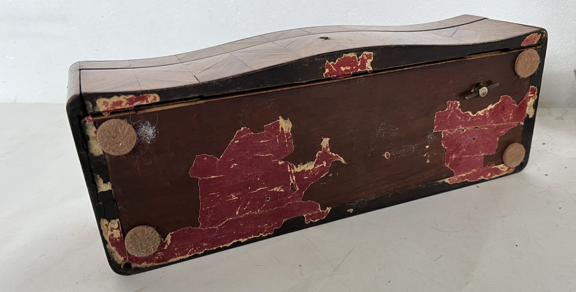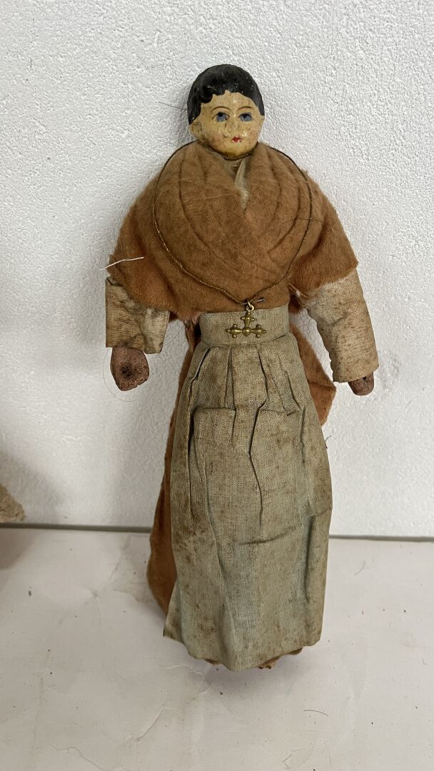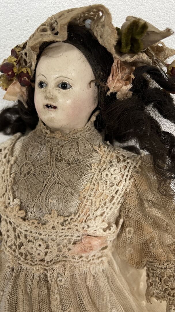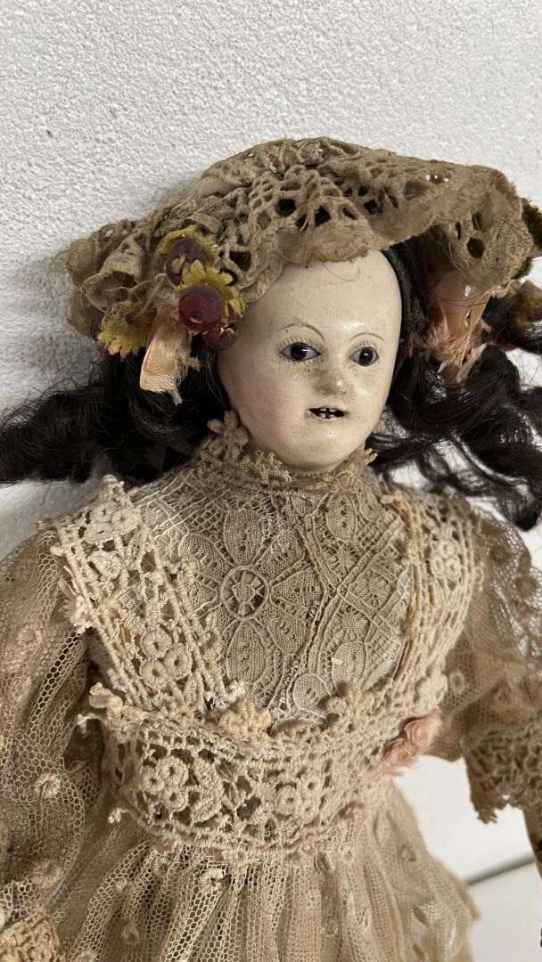 Lot comprenant : - une poupée en composition laquée de type Pauline, bouche ouverte, yeux marrons en verre fixe, corps en cuir type mannequin avec doigts détachés (accident), vêtements et bottines anciennes H32 cm. - une petite poupée tête en bois laquée corps en tissu H23 cm, - deux ombrelles avec tête de chien H26 cm - un coffret en marqueterie de bois de rose avec boîte à musique. Dimensions 29 x10 x8 cm. Ensemble vendu en l'état