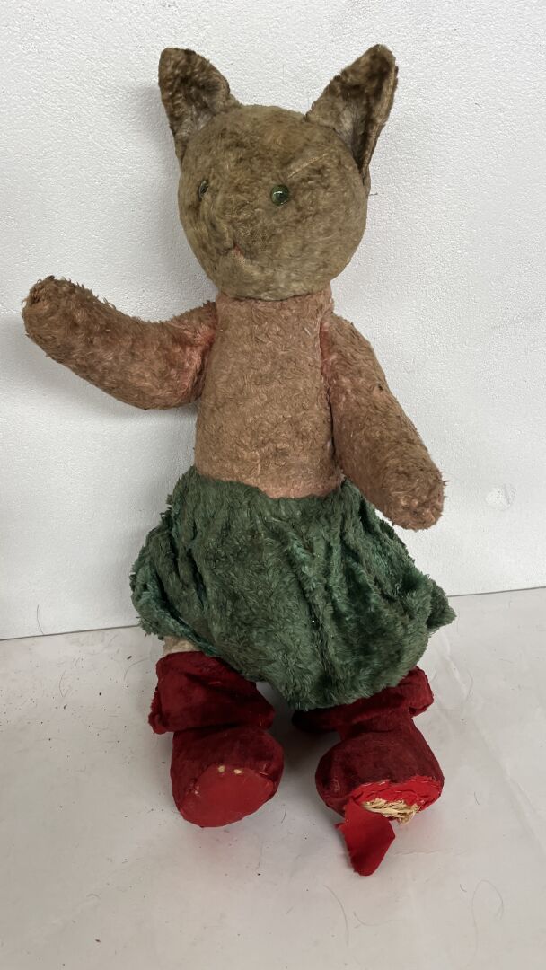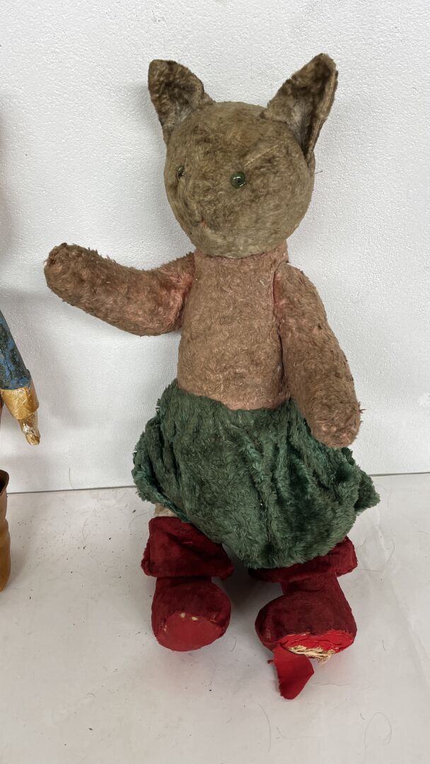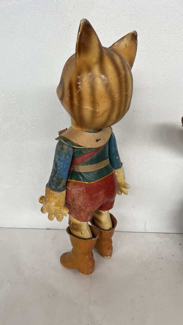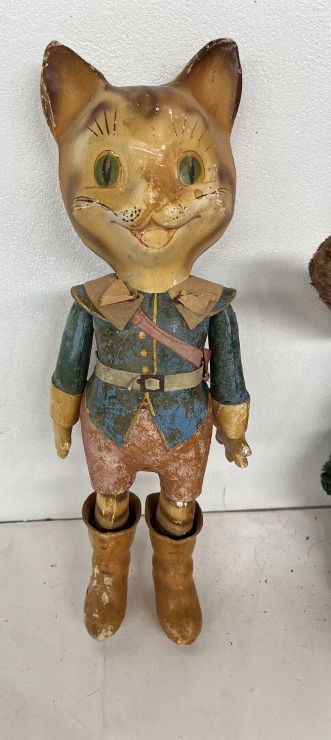 Le chat botté, les jouets César et divers. Lot comprenant un chat en carton bouilli H : 43 cm. Peinture présentant des usures, semelle droite restaurée sinon complet. On y joint un chat botté en peluche avec sa culotte verte et ses bottes en velours rouge, yeux en verre. H : 53 cm. Vendu en l'état