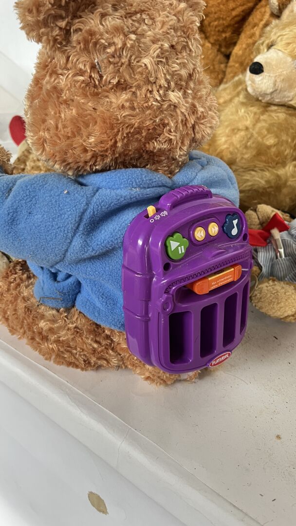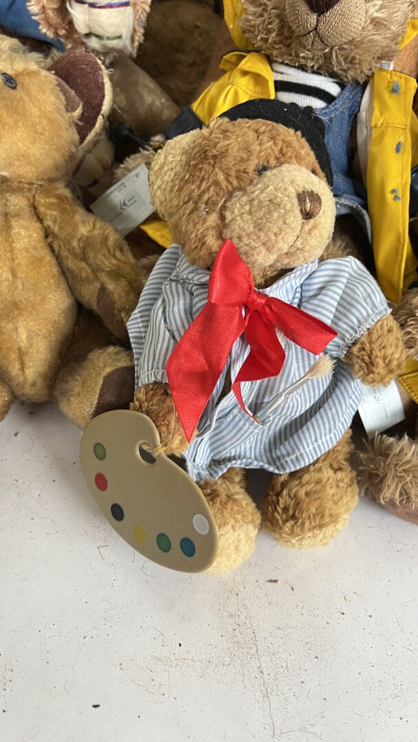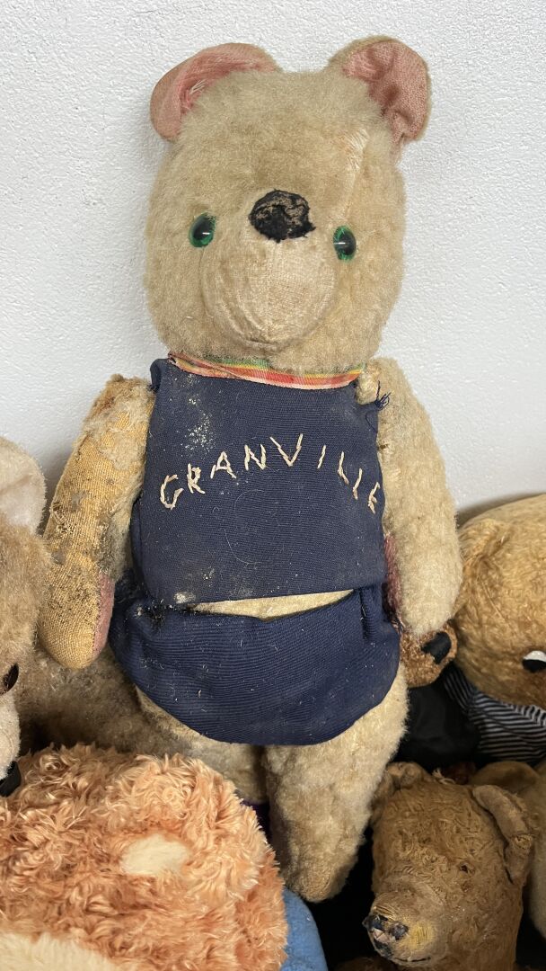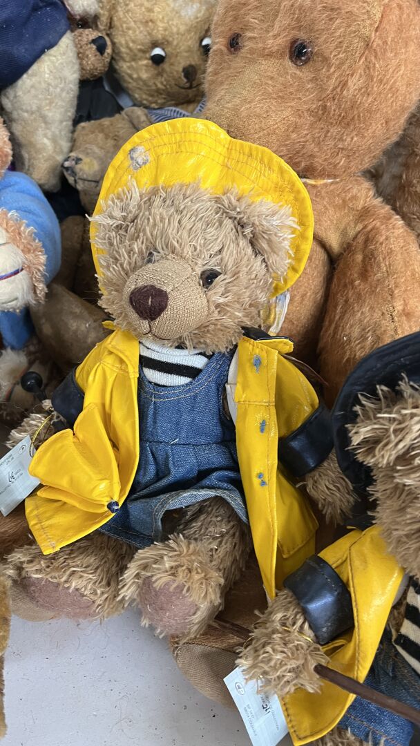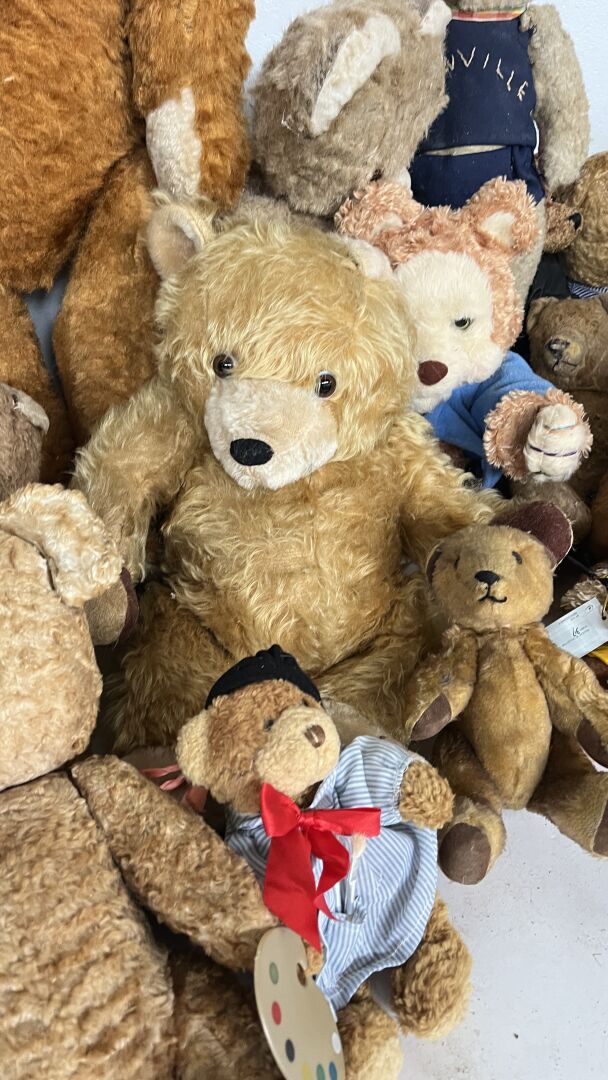 Teddy bear. Lot de 19 ours en peluches de tailles, matériaux, époques et état divers dont l'ours pécheur, l'ours peintre, l'ours Granville, et un ours playschool, avec système vocal etc. Hauteur entre 20 à 80 cm. Vendu en l'état.