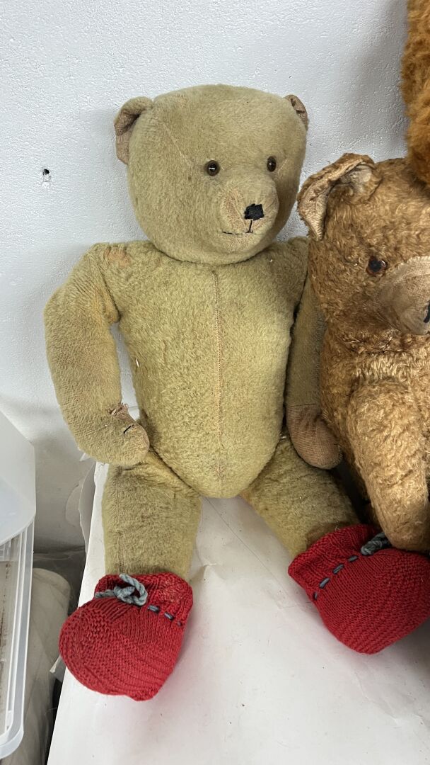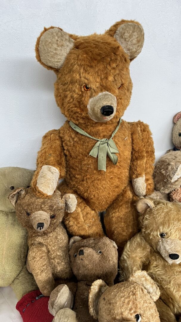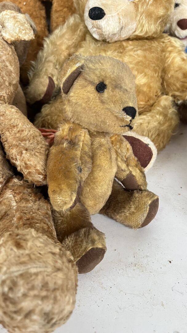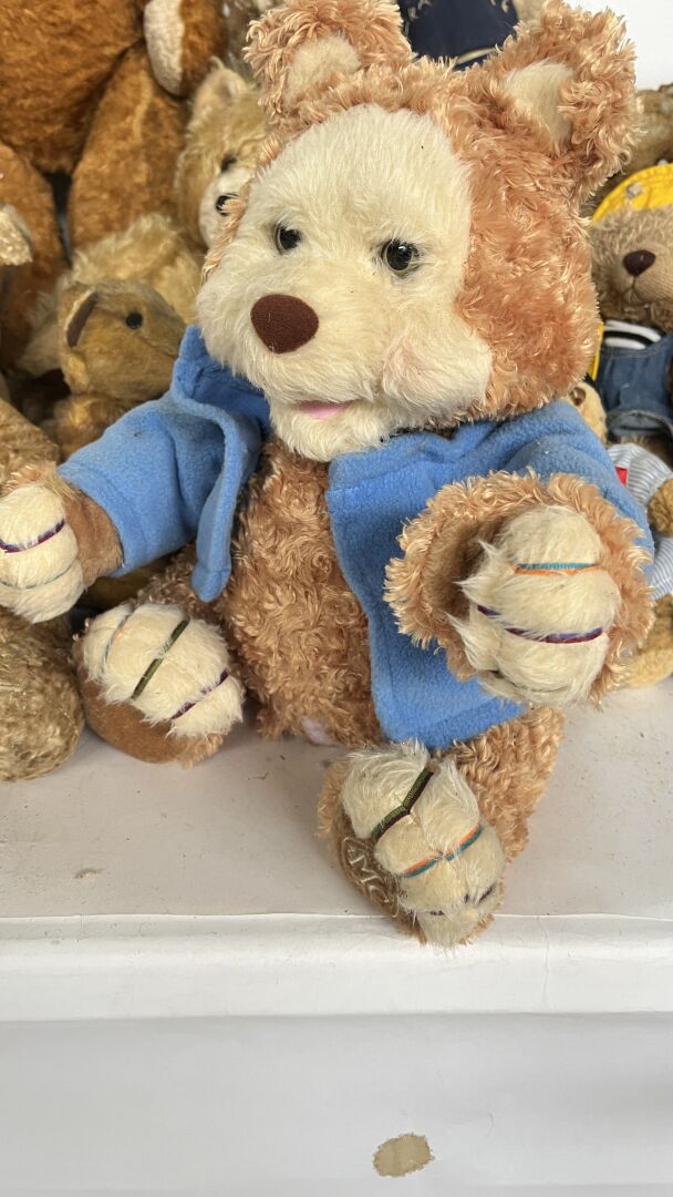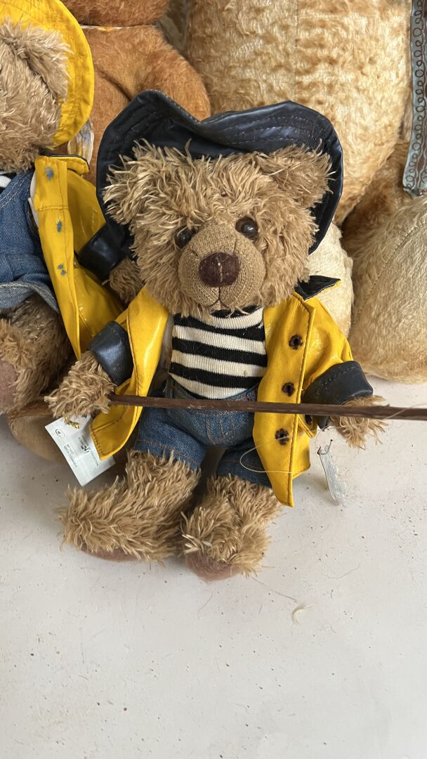 Teddy bear. Lot de 19 ours en peluches de tailles, matériaux, époques et état divers dont l'ours pécheur, l'ours peintre, l'ours Granville, et un ours playschool, avec système vocal etc. Hauteur entre 20 à 80 cm. Vendu en l'état.