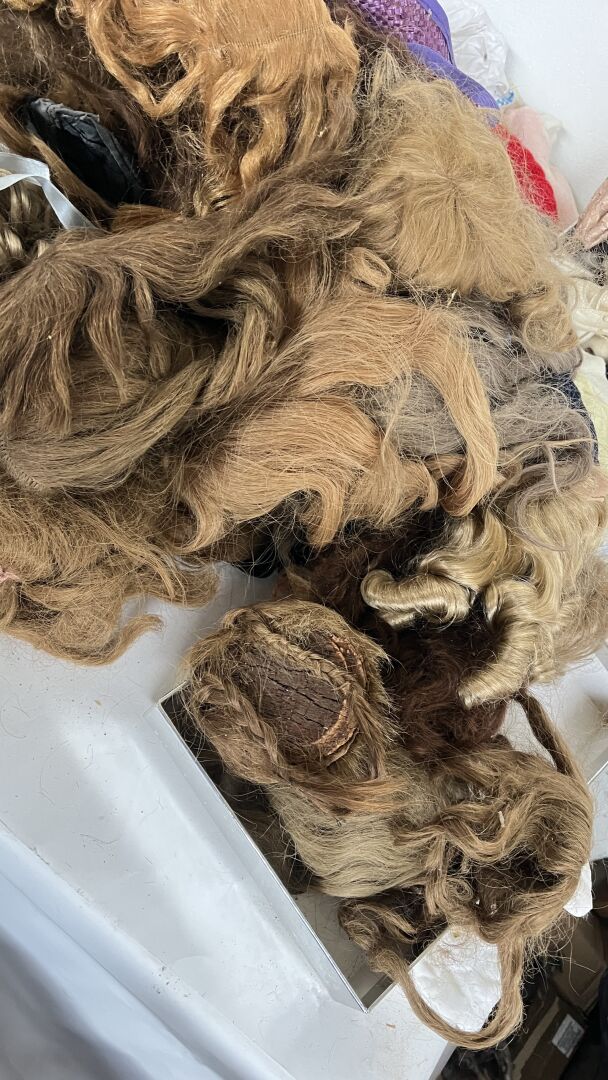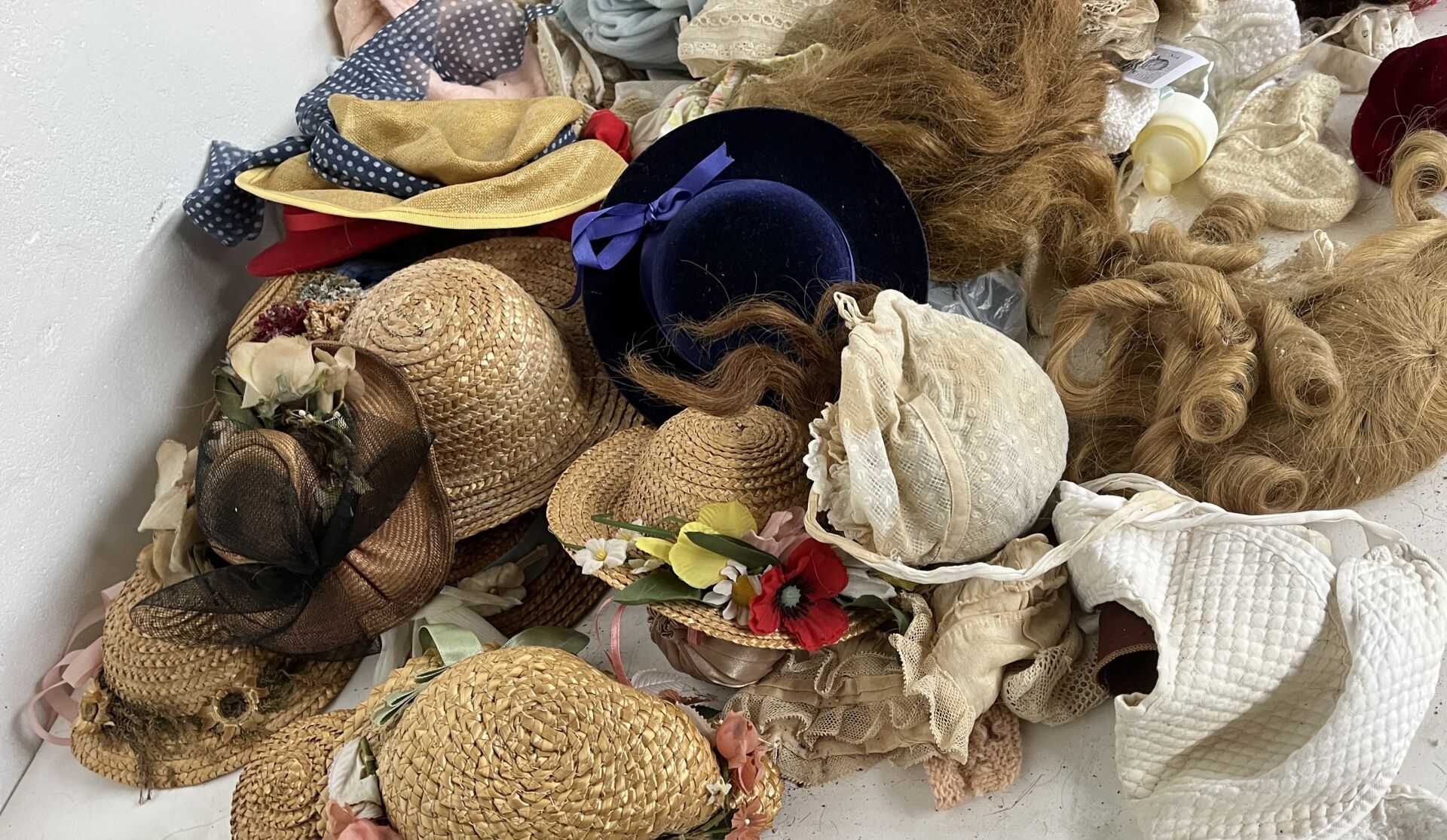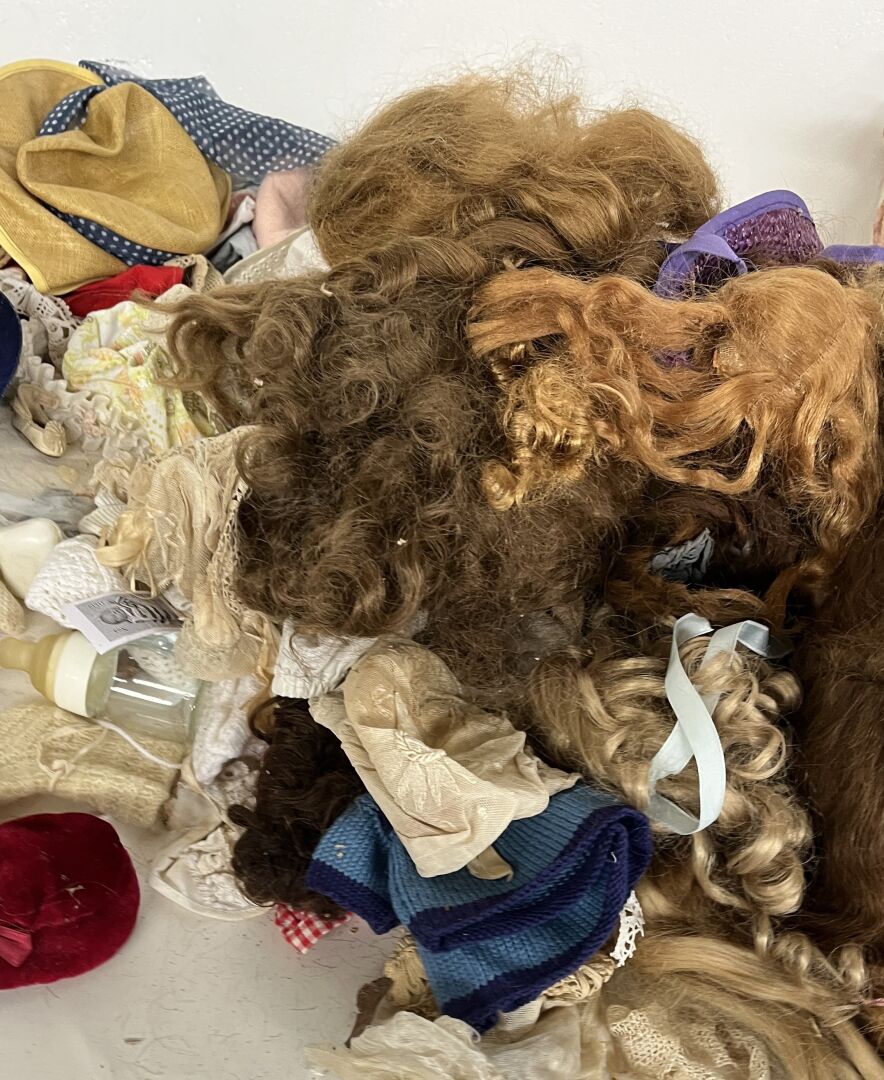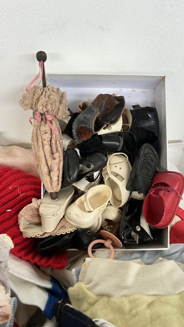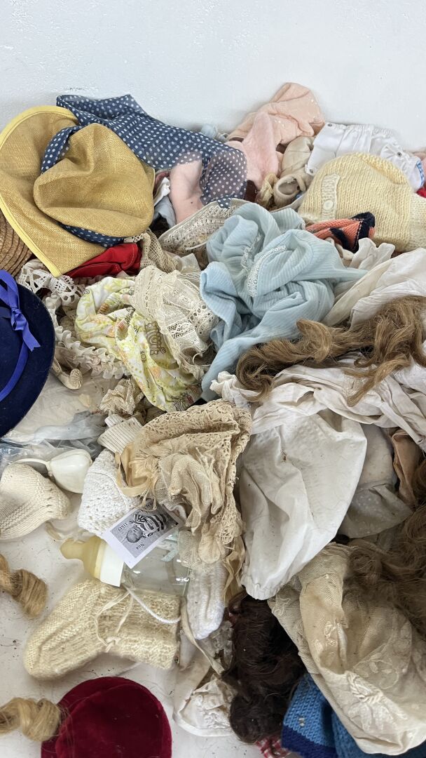 Lot comprenant de nombreux vêtements de poupées de toutes tailles et toutes époques, ainsi que des accessoires (chapeaux, perruques, chaussures…)