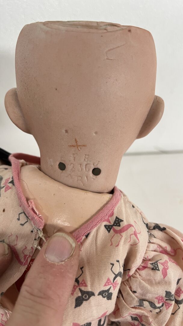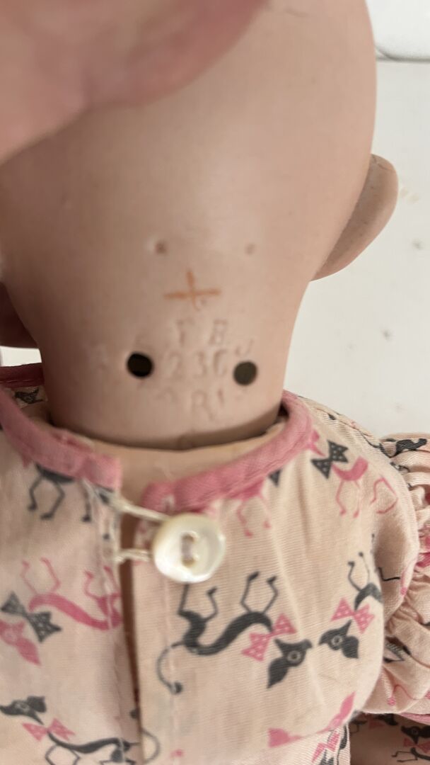 SFBJ. bébé caractère moule 236 taille 6, tête en biscuit coulé marquée en creux SFBJ Paris 236 - 6. corps de poupon portant la marque à la cocarde. H 36 cm Petit éclat de peinture au gros orteil sinon bon état