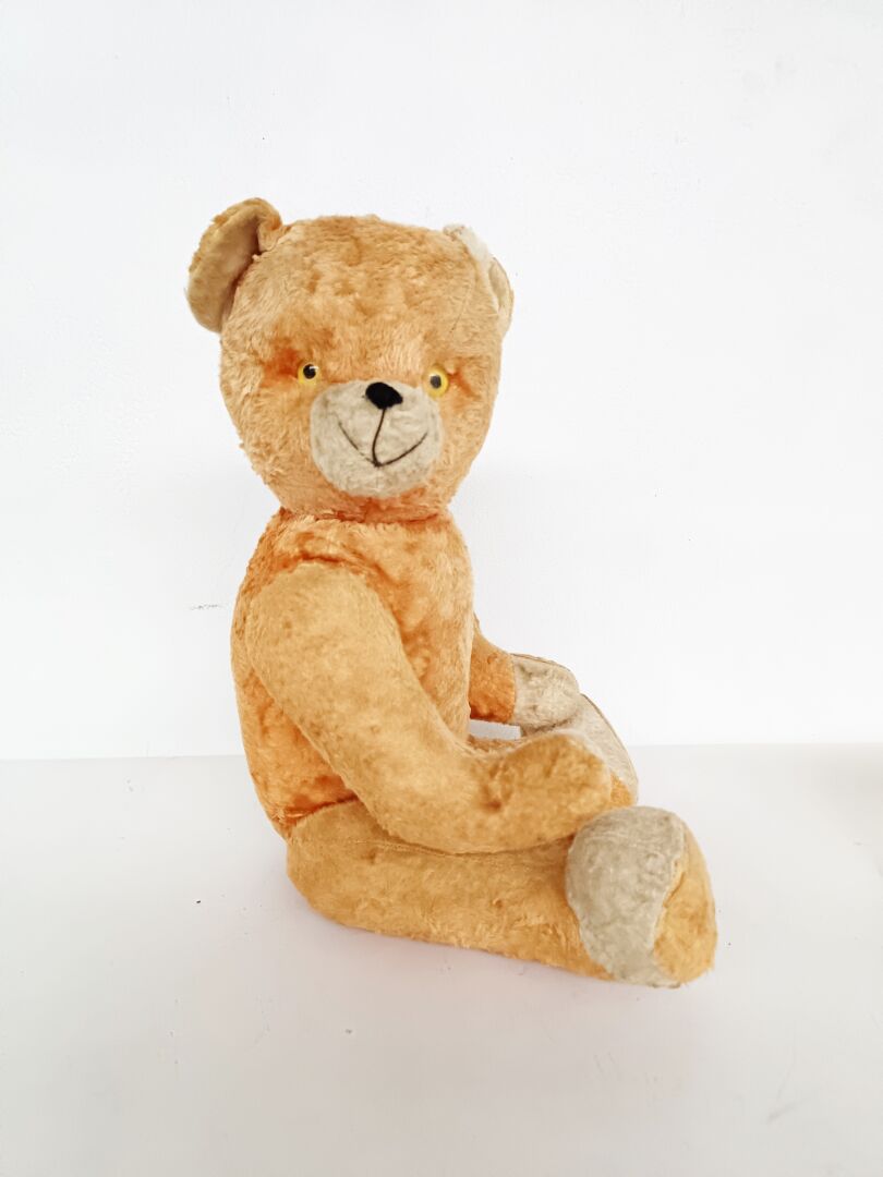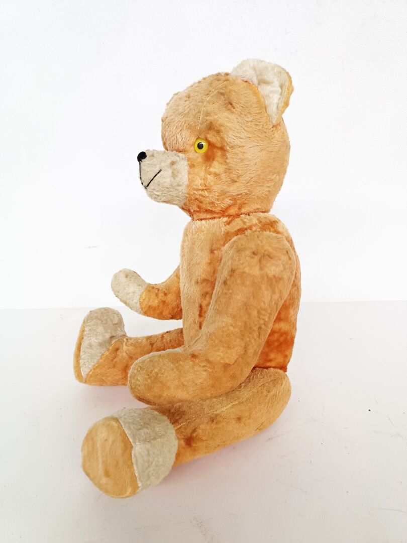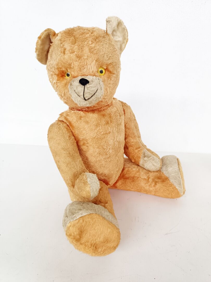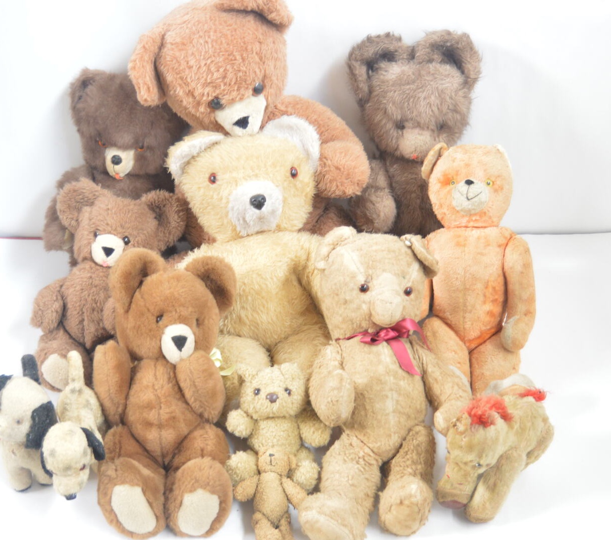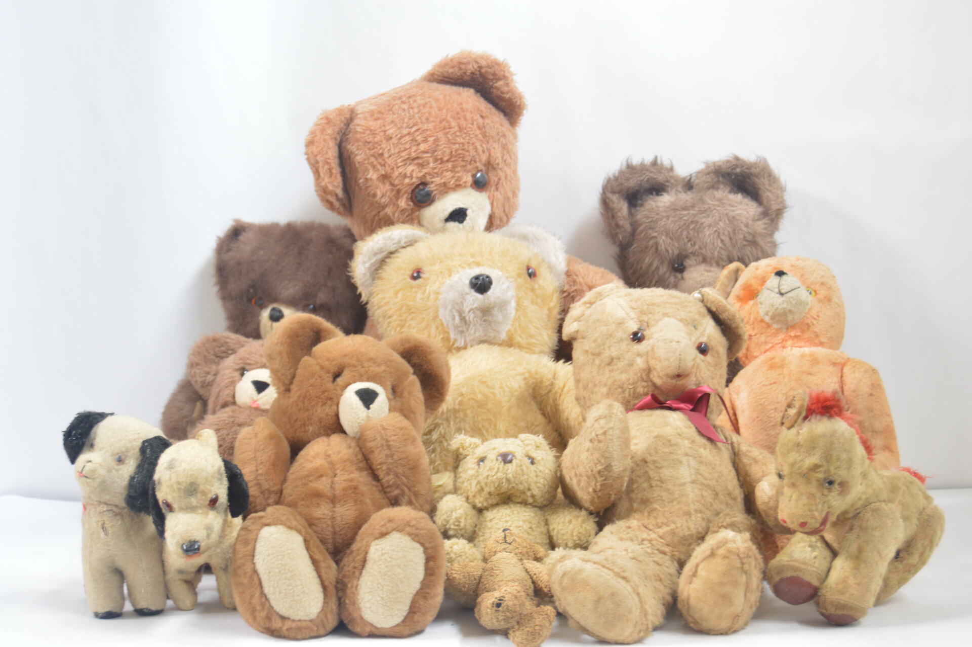 Lot de 16 peluches toutes époques dont 13 Teddy bear , 2 chiens et 1 petit cheval dont 1 Teddy bear de chez Pintel bicolore abricot / gris, bouche brodée en V inversé, oreilles écartées, long bras incurvés (pas de griffes ni de bosse) système de grognement cassé H 50 cm L'ensemble est vendu en l'état