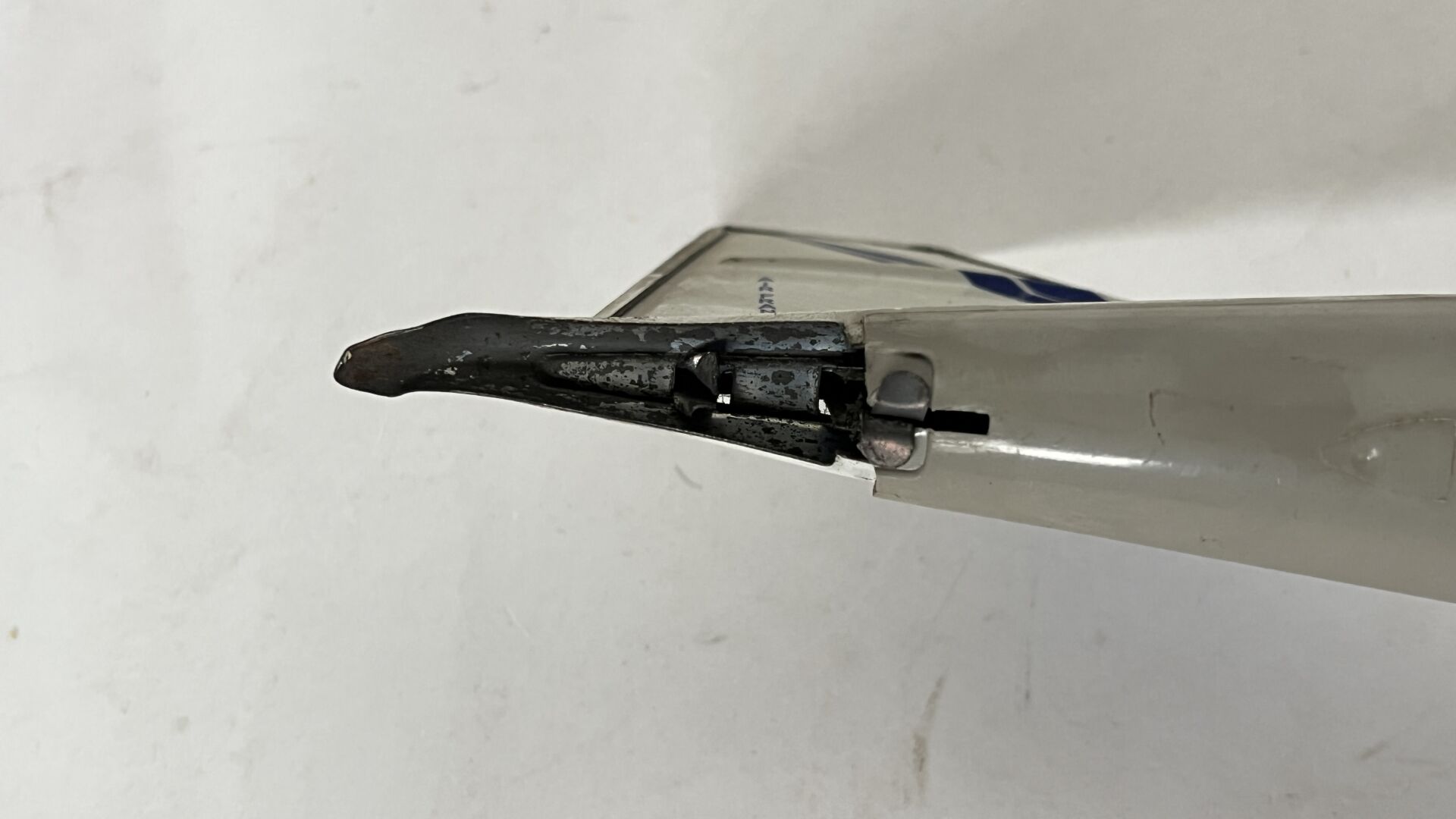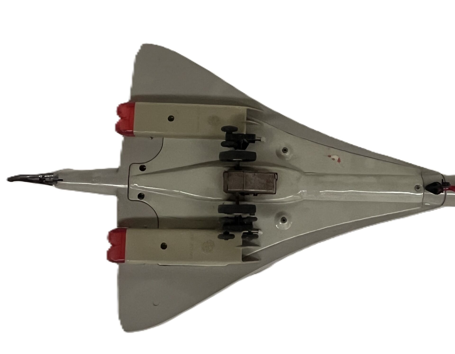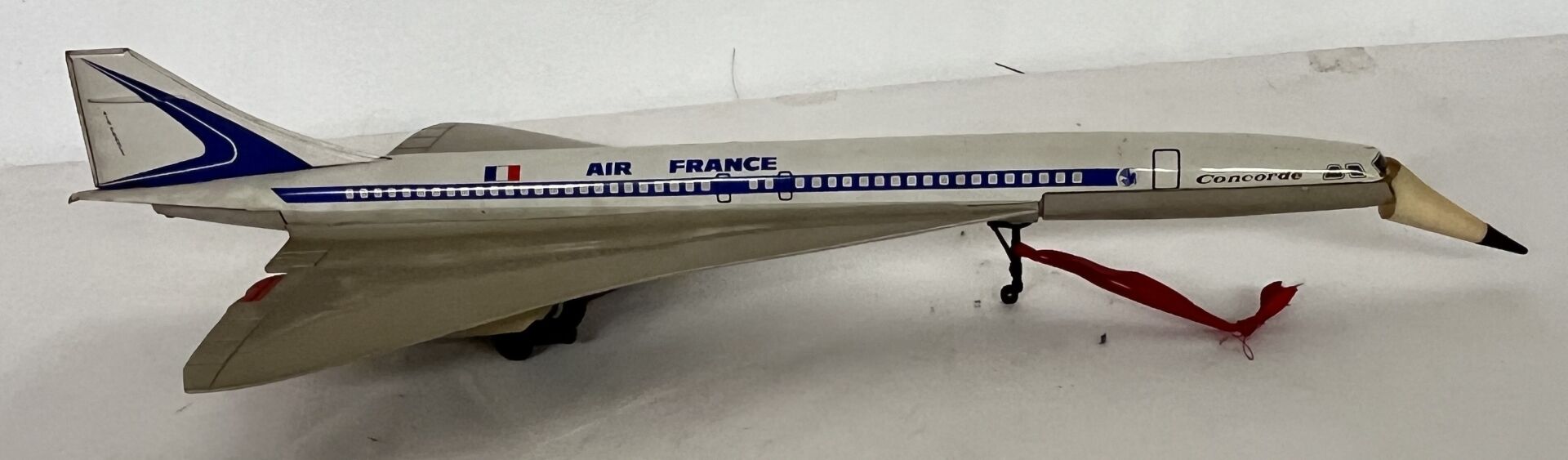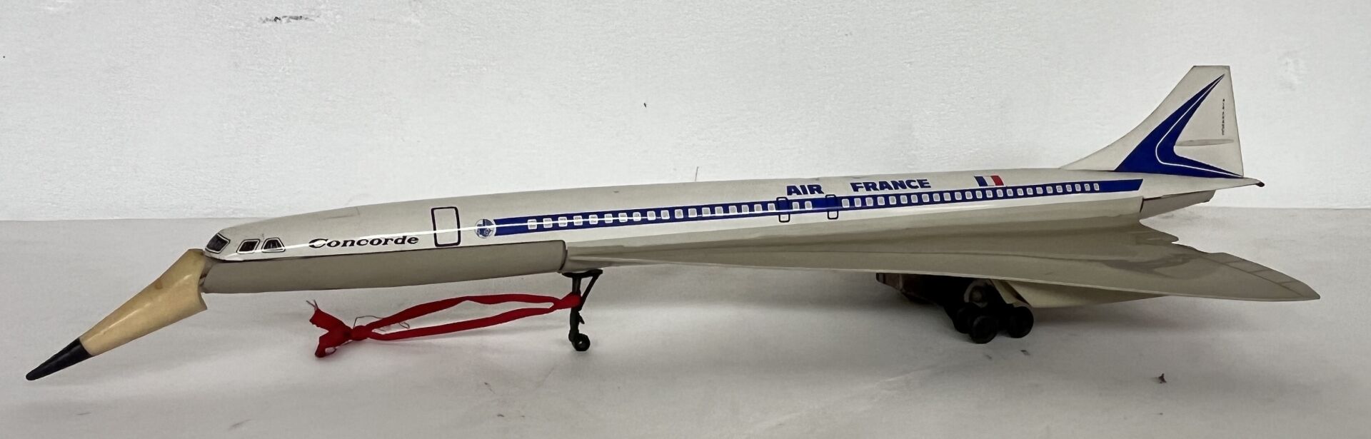 JOUSTRA. Concorde Air France, jouet à friction en tôle lithographié et plastique. L 58 cm. A signaler : Manque un bout de l'empennage arrière. Vendu en l'état