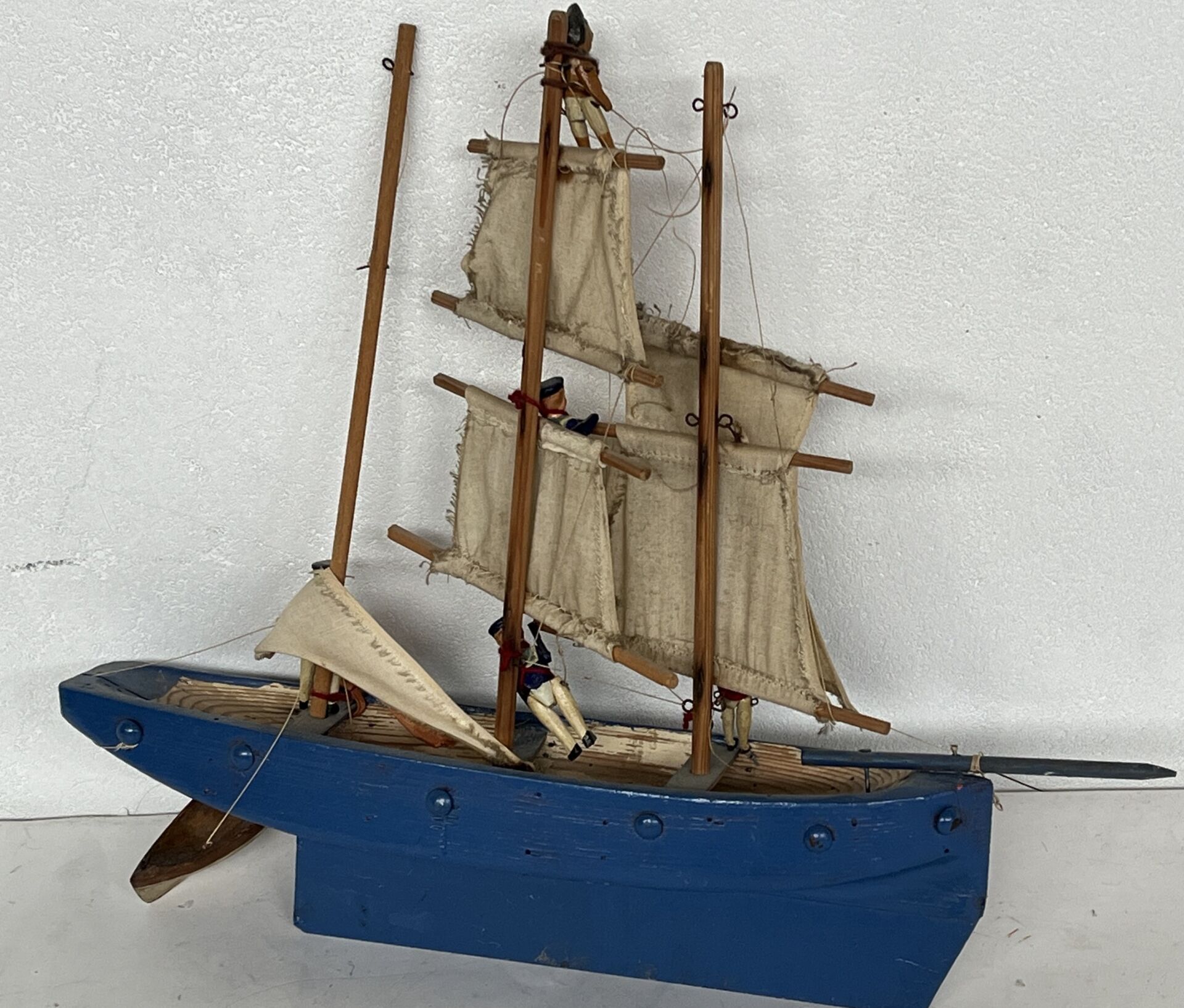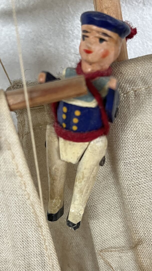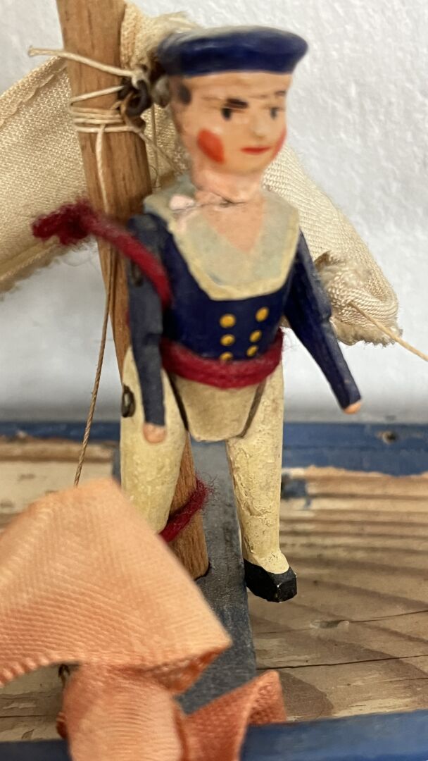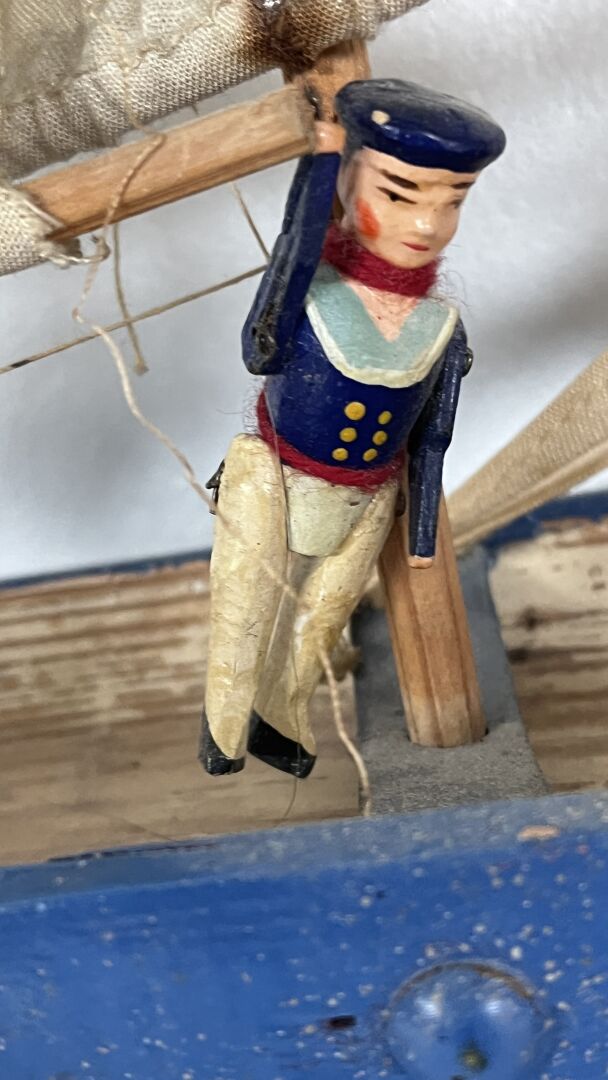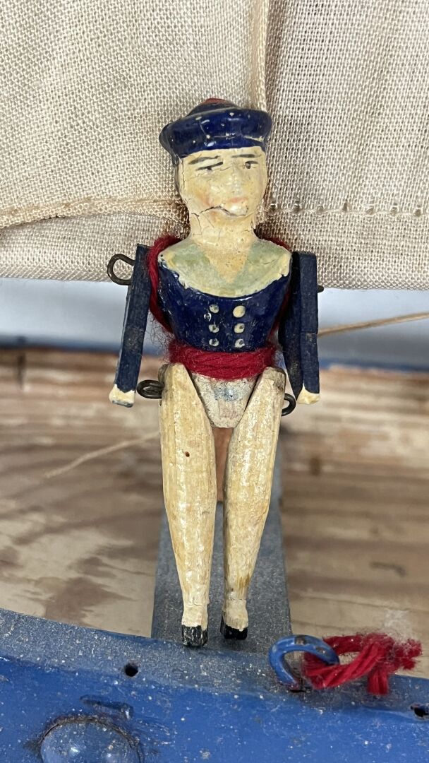 Petit bateau de fabrication artisanale en bois, représentant un 3 mâts. La quille est en métal. Il comporte l'originalité d'avoir 4 petits marins en bois articulés de la maison Radiguet - Longueur -bateau 42 cm, Hauteur marins 60 mm. Vendu en l'état