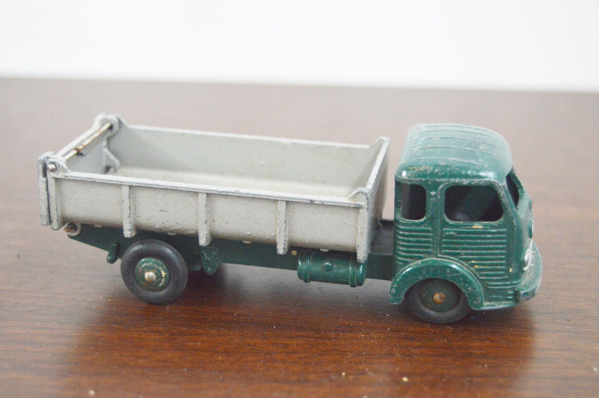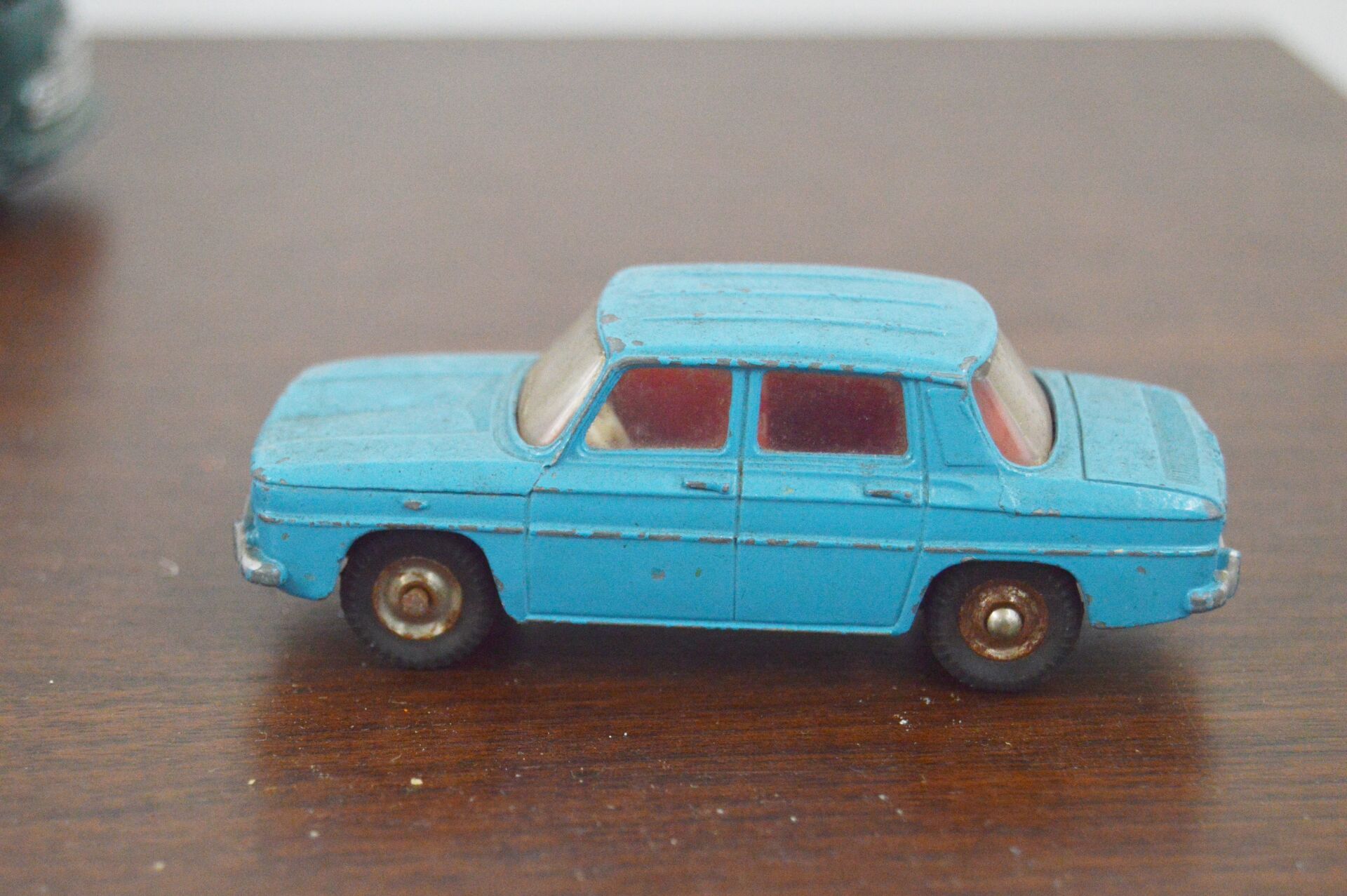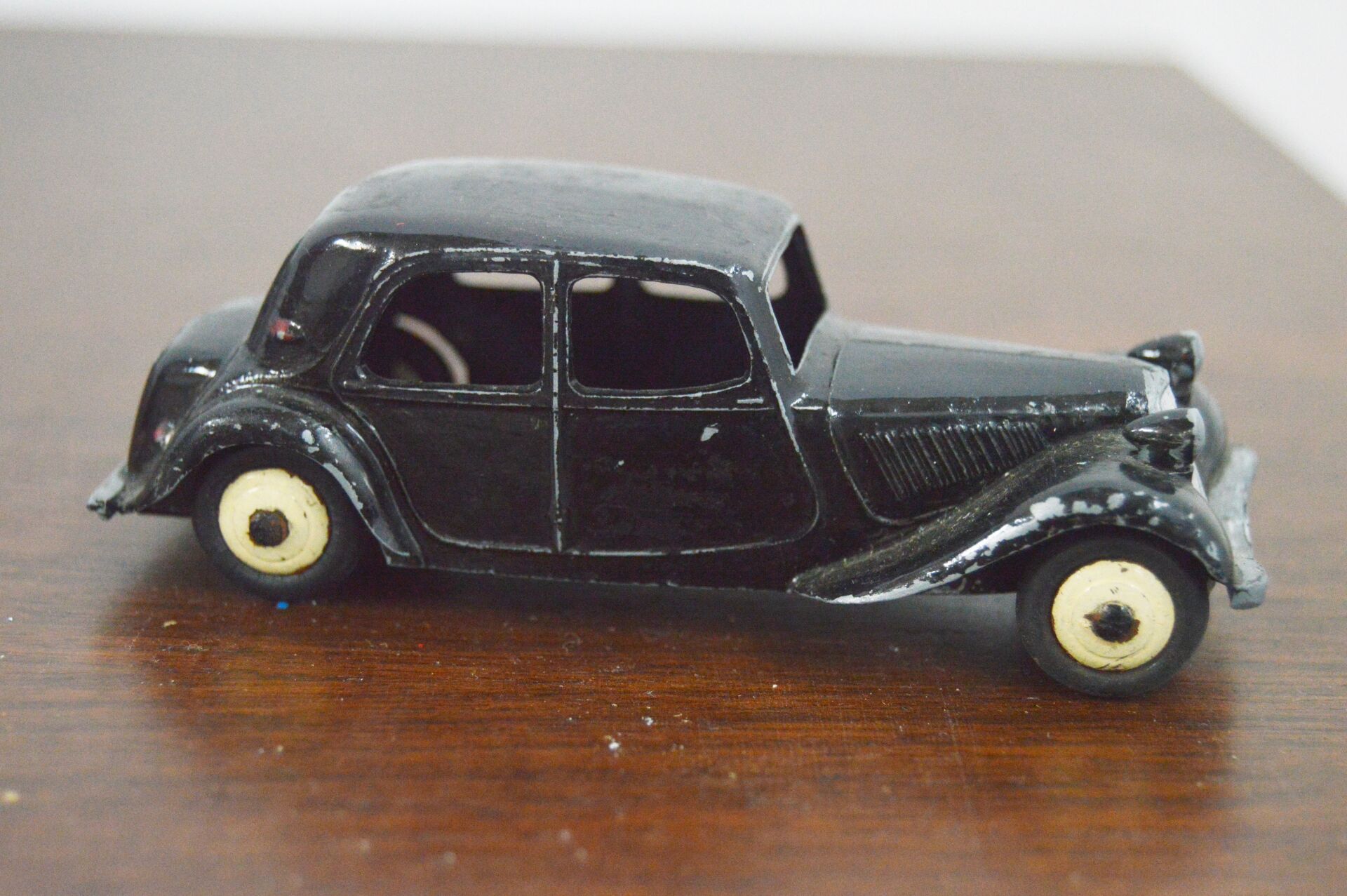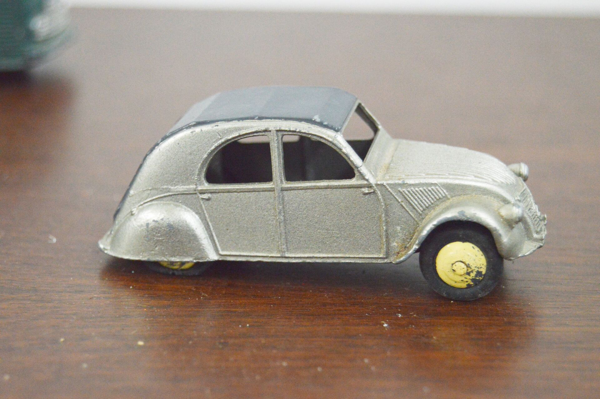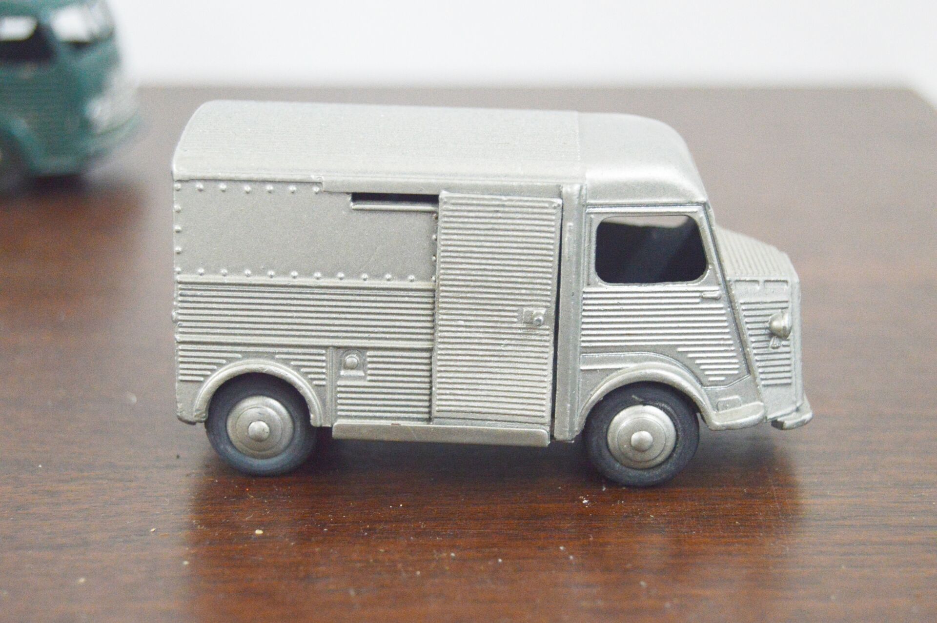 1/43ème Dinky Toys France, Lot de 5 véhicules dont Citroën 2cv, Traction et HY, 1 Renault 8 et 1 camion Simca cargo benne striée. État passable