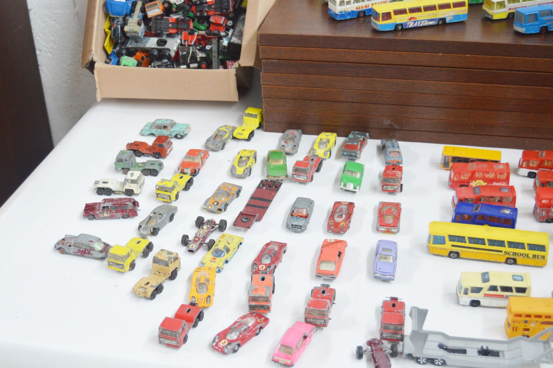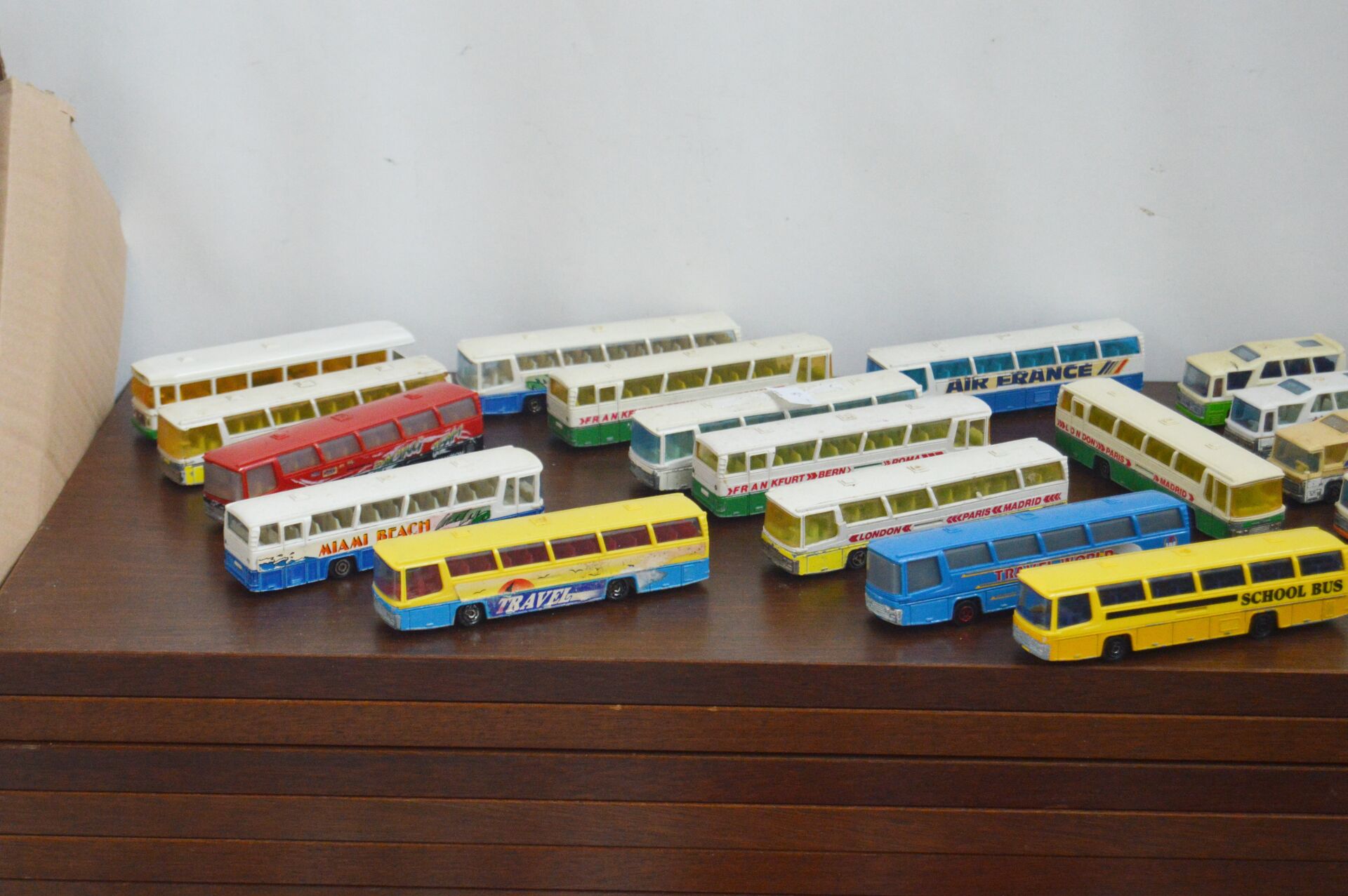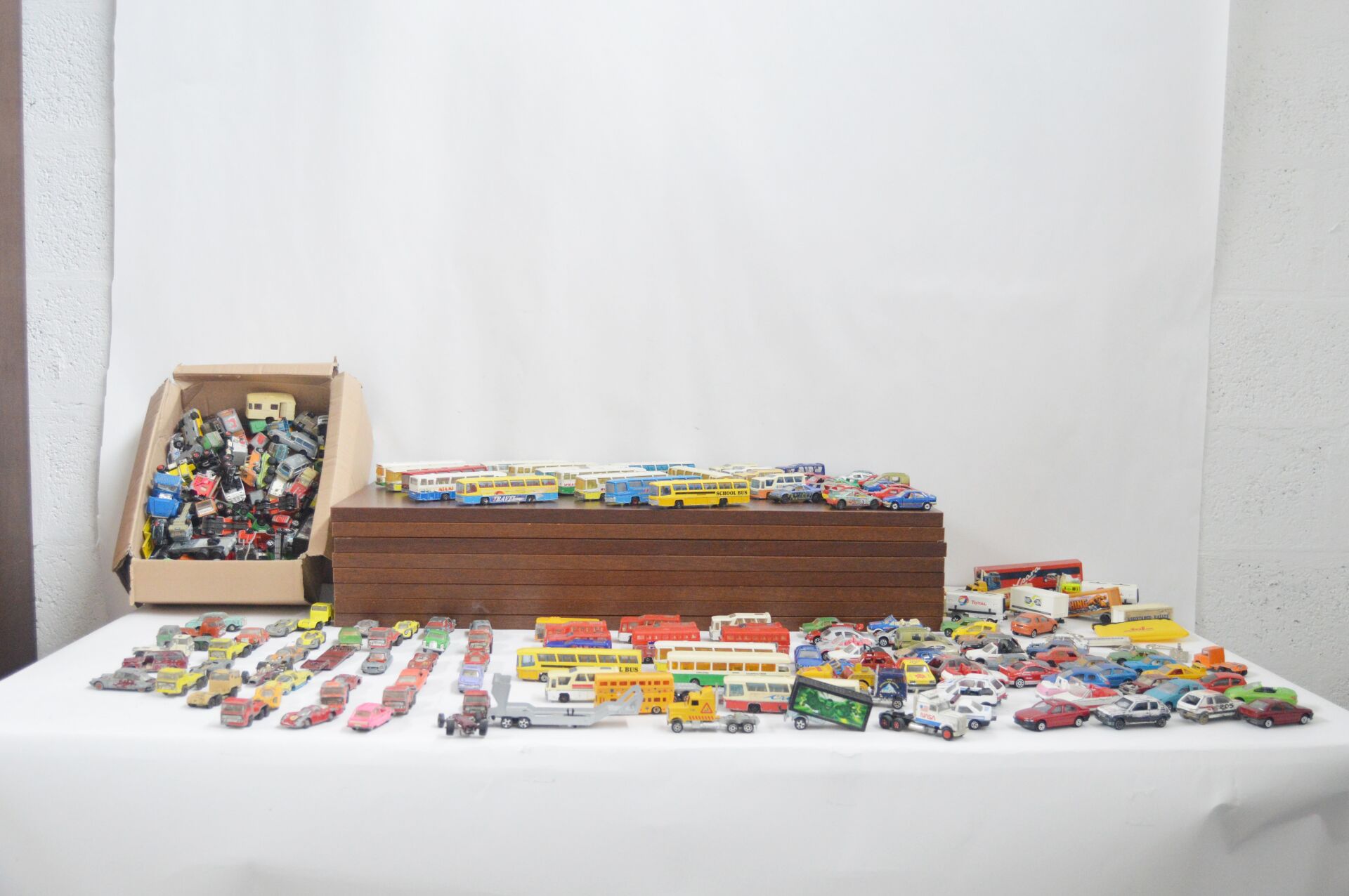 1/87ème, MAJORETTE, toutes époques dont une trentaine des années 60. Lot de + 100 véhicules tous types (tourisme, autocar, etc...). Mauvais état à épaves