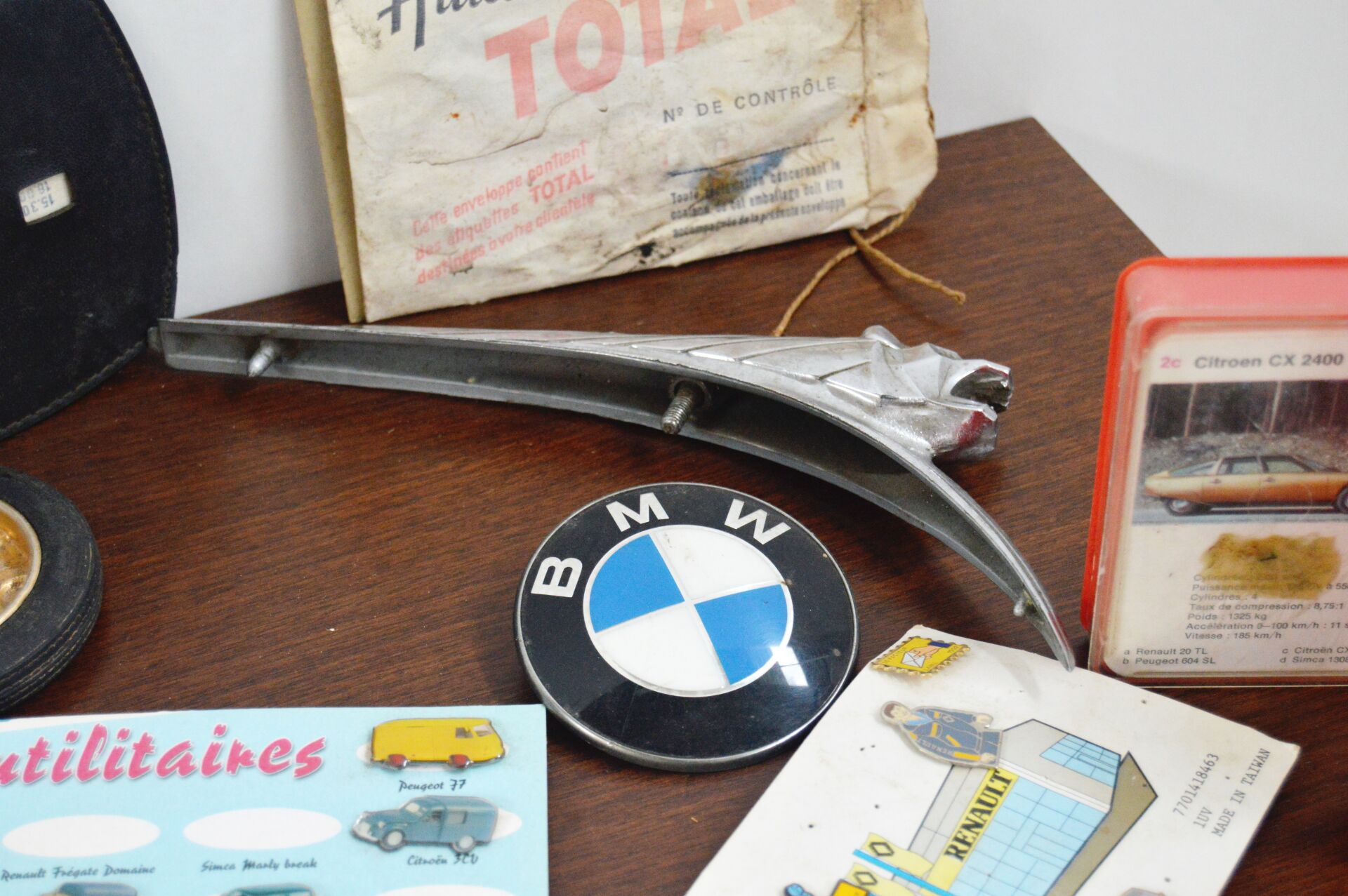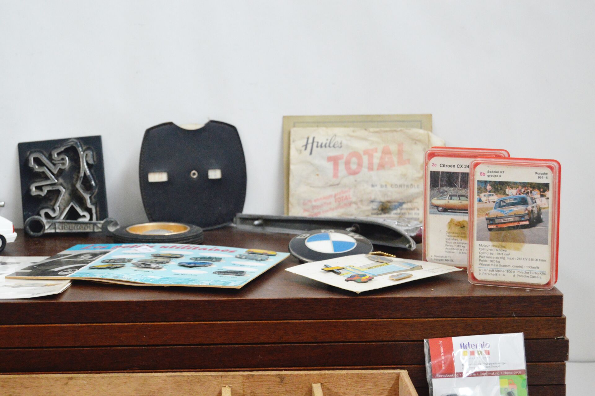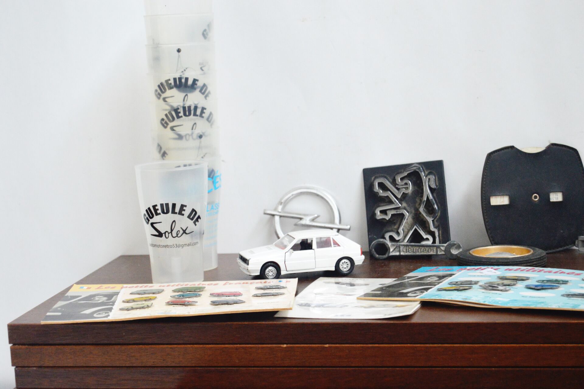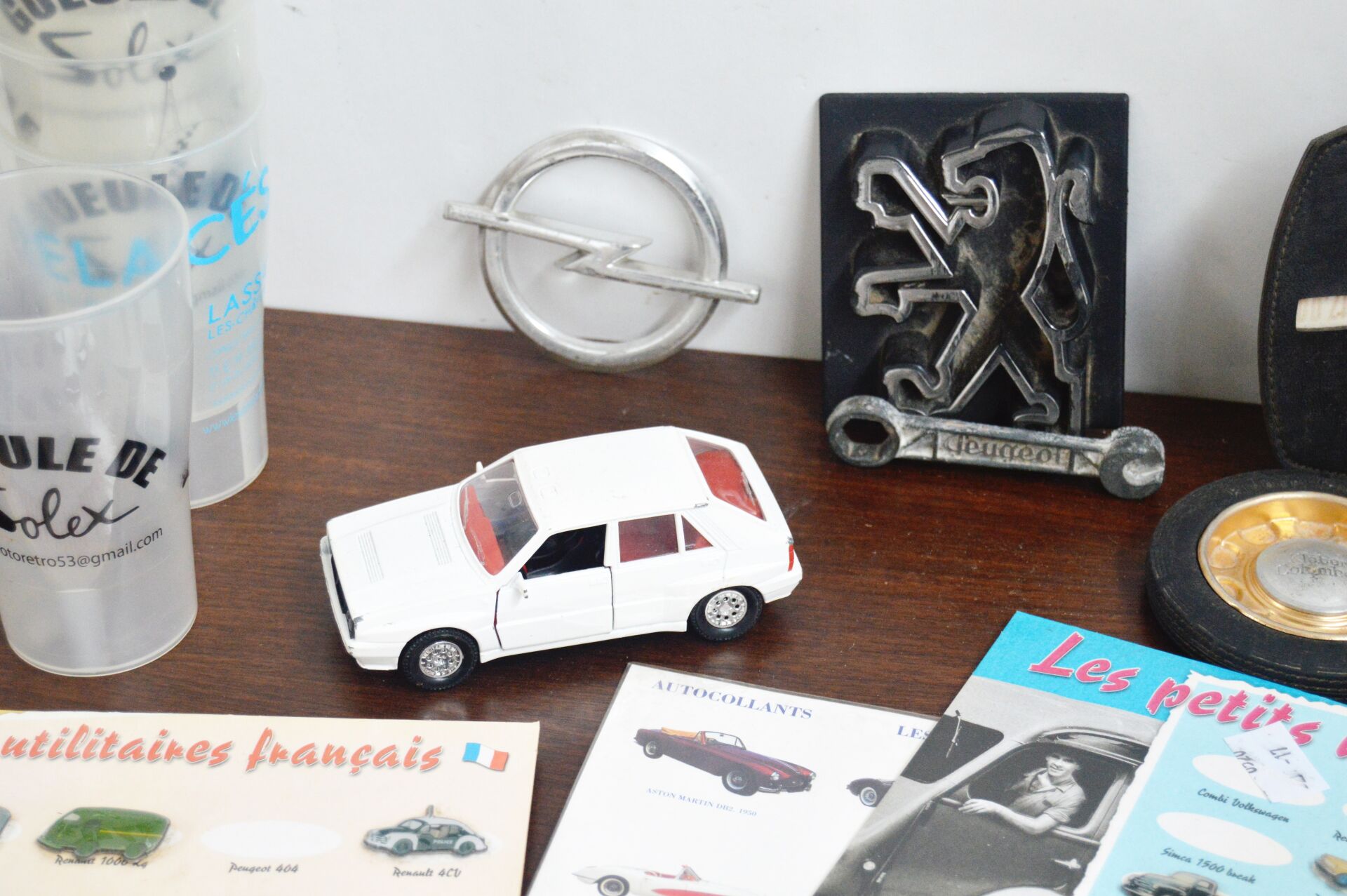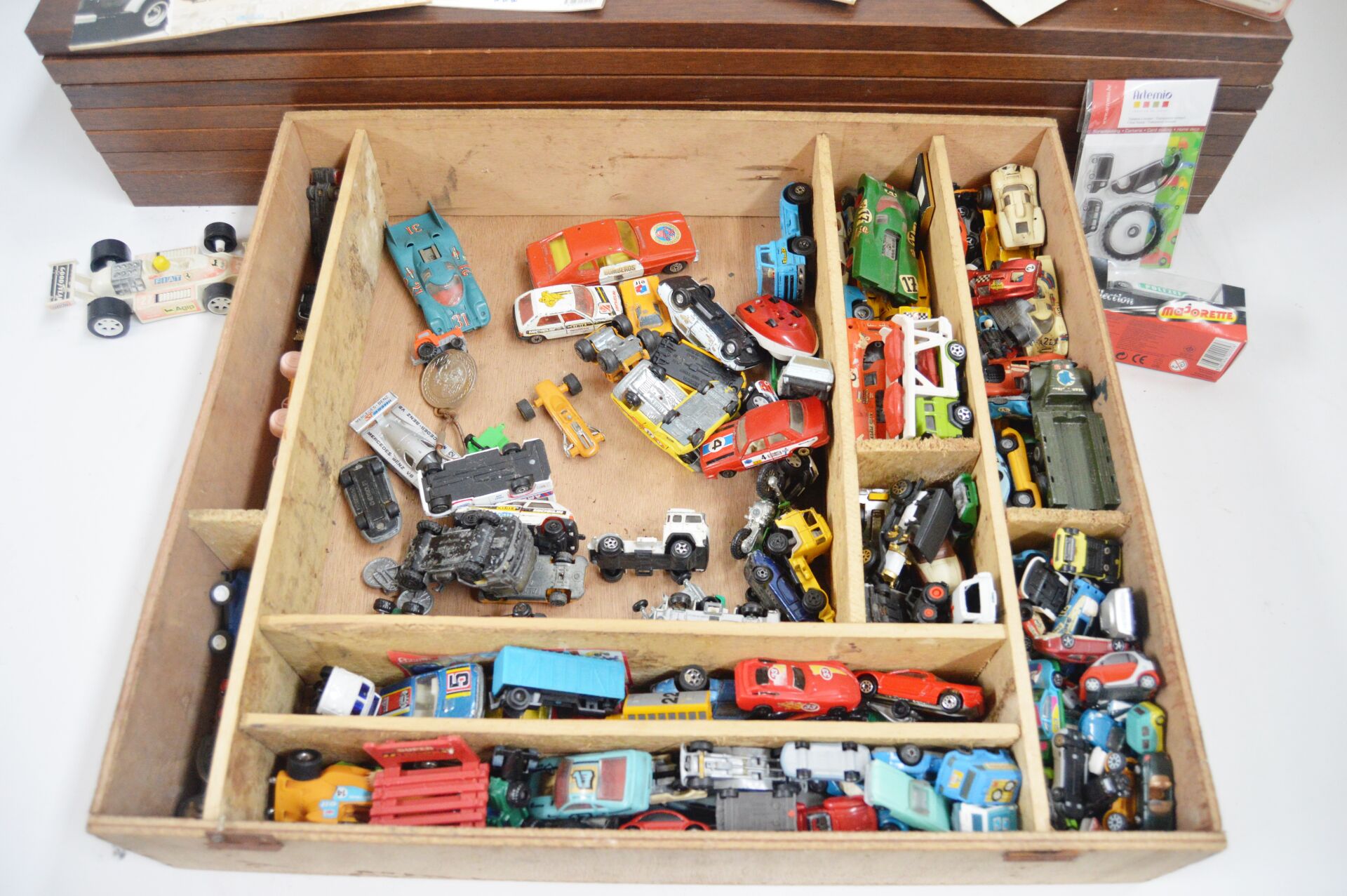 1/87ème, 1/43ème, micro car etc.Majorette, Racing Super Champions, etc. Dans un coffret en bois : nombreux véhicules de tous types et de toutes échelles, 2 jeux cartes sur le thème automobiles, lot de gobelets publicitaires, pins, sigle Peugeot, etc.…. Vendu en l'état