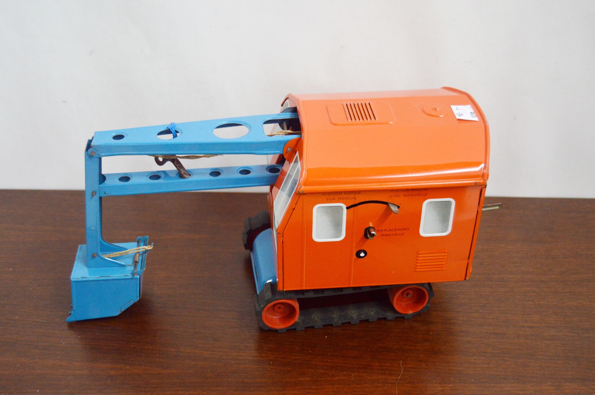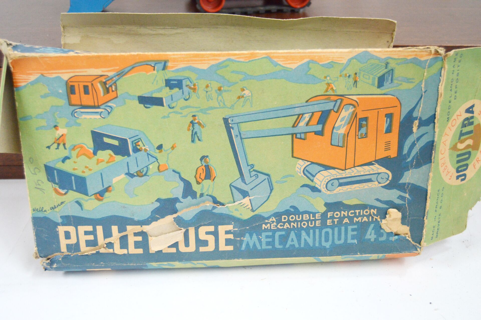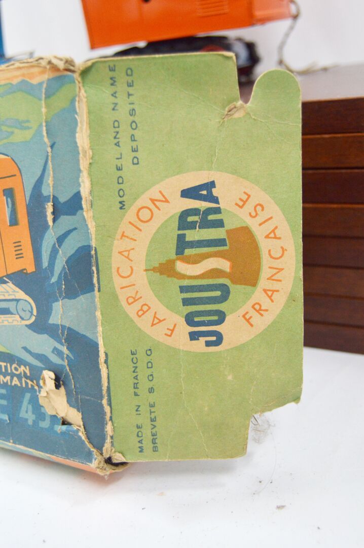 JOUSTRA. Pelleteuse mécanique en tôle à chenilles très bel état et accompagnée de sa boite d'origine (mauvais état) Dimensions L 32 cm
