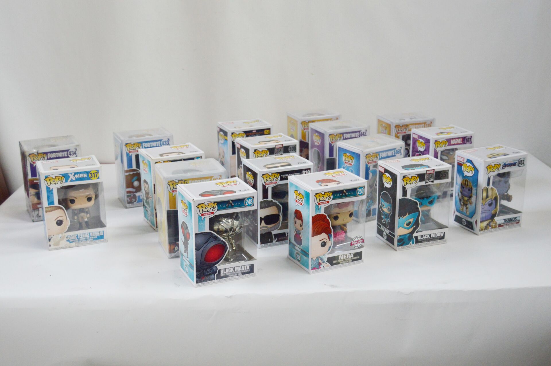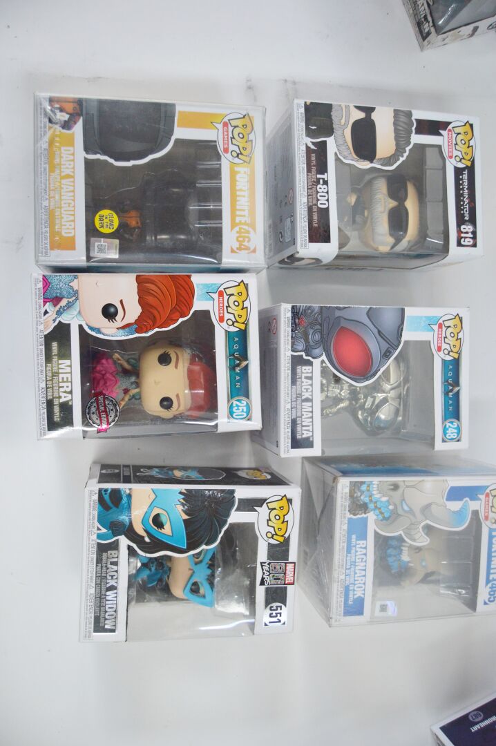 POP. Lot de figurines dont : Fortnite 434, Fortnite 433, Fortnite 442, Fortnite 465, Spiderman 621, Fortnite 464, Fortnite 463, Fortnite 515, Marvel 500, Marvel 551, Marvel 687, Xmen 317, Aquaman 245, Aquaman 248, Aquaman 250 et Avengers 453. Très bon état à neuf.