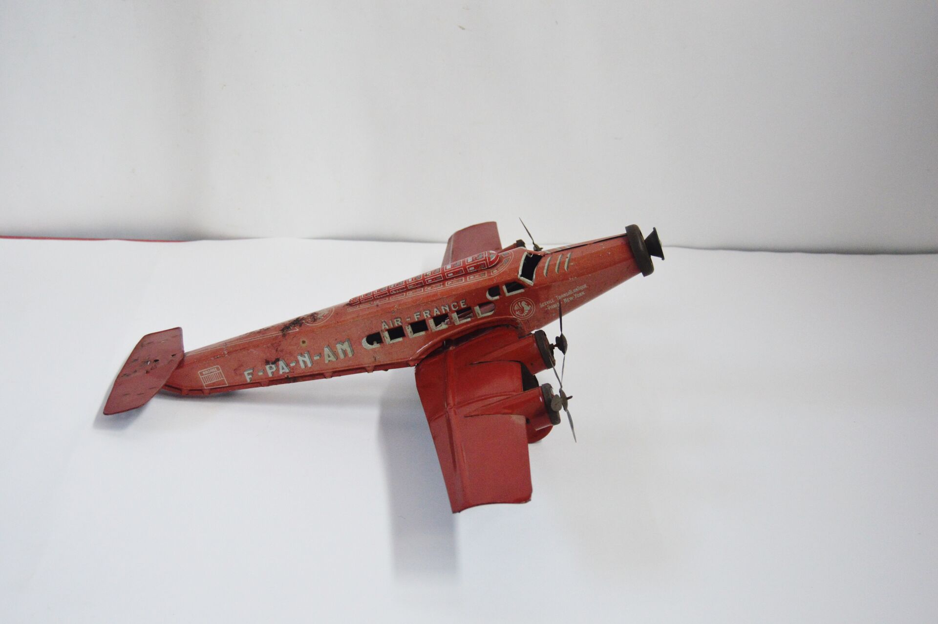 Joustra. Avion en tôle lithographiée mécanique à 4 hélices marquée "F-PA-N-AM Air France" A signaler : Dérive manquante, non testé vendu en l'état