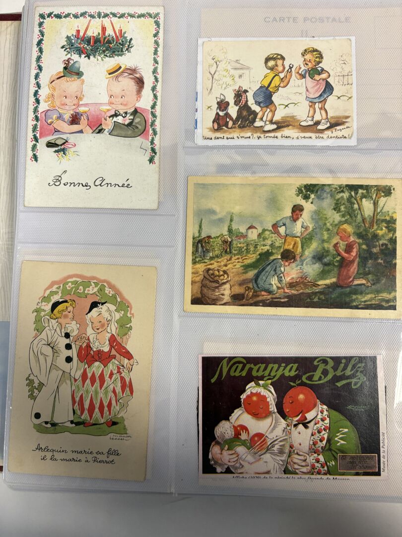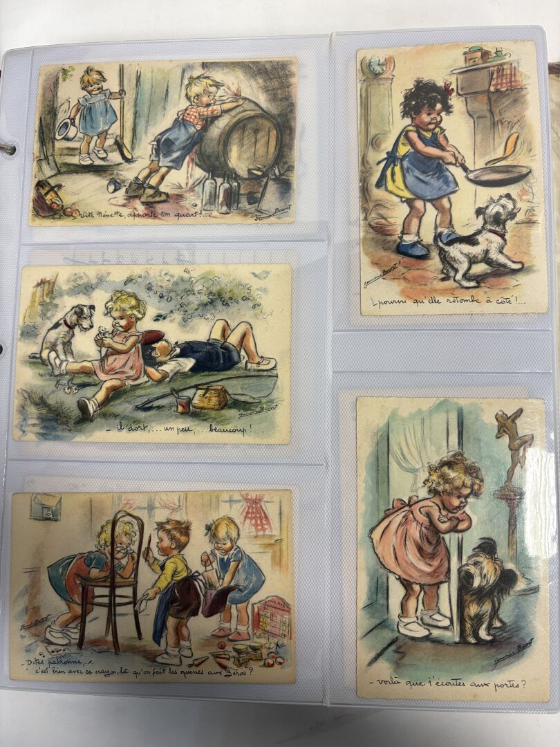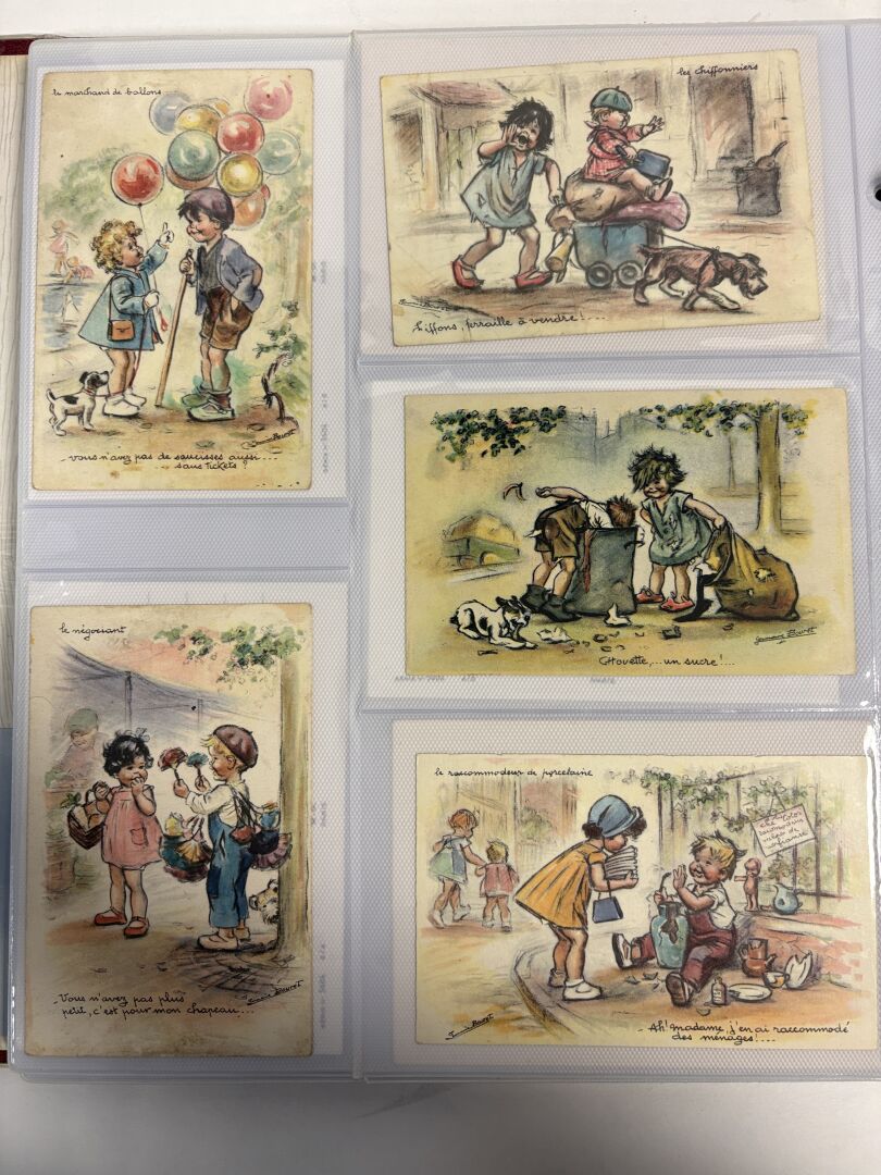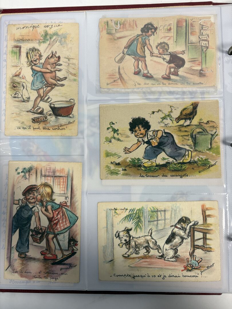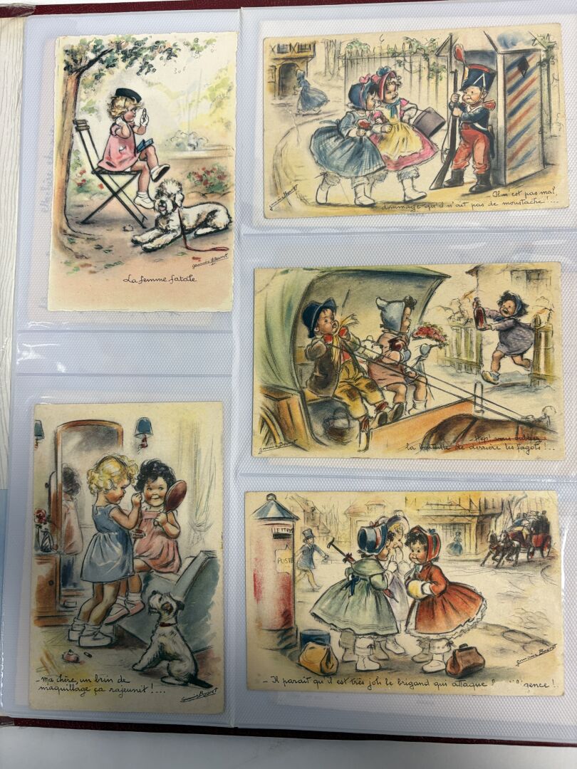 Album grenat de plus de 400 cartes d'illustrateurs dont Germaine BOURET, POULBOT, MAUZAN ...