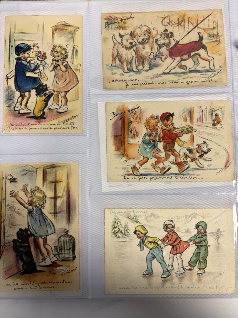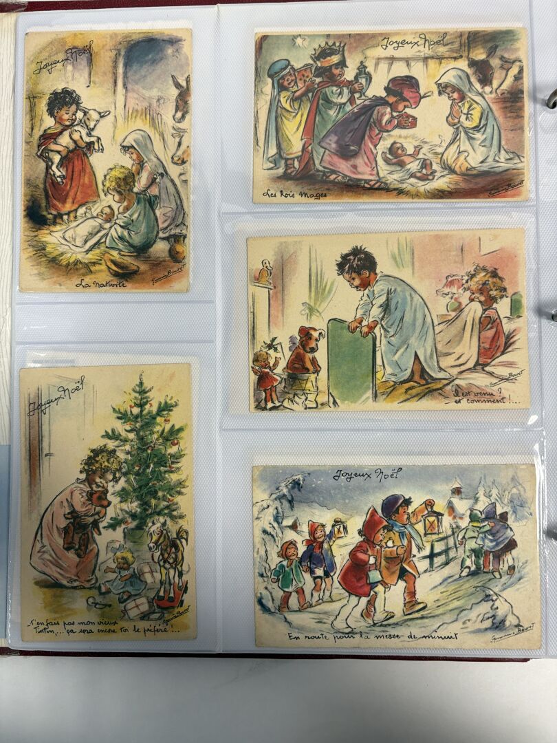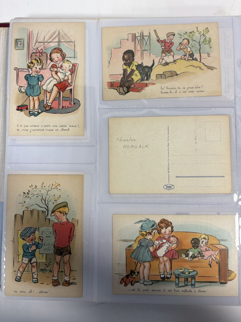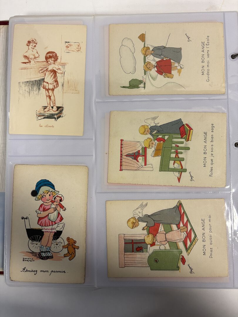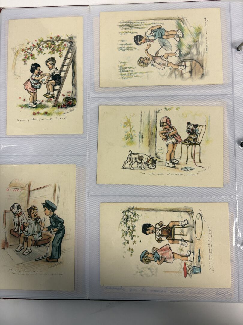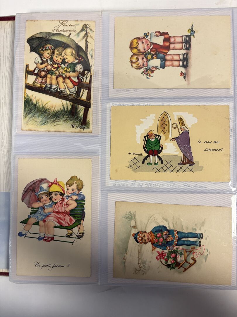 Album grenat de plus de 400 cartes d'illustrateurs dont Germaine BOURET, POULBOT, MAUZAN ...