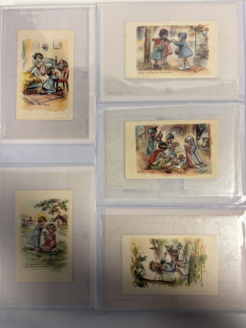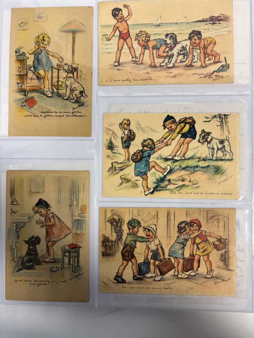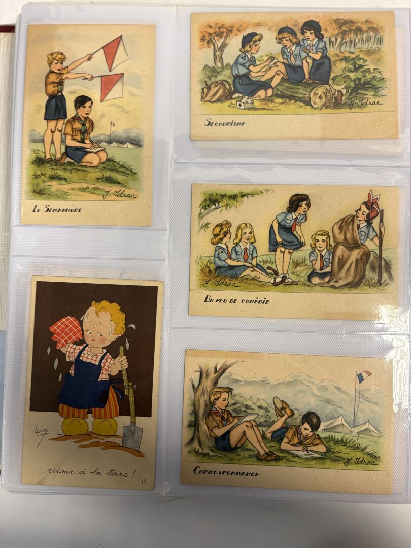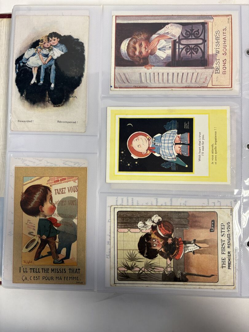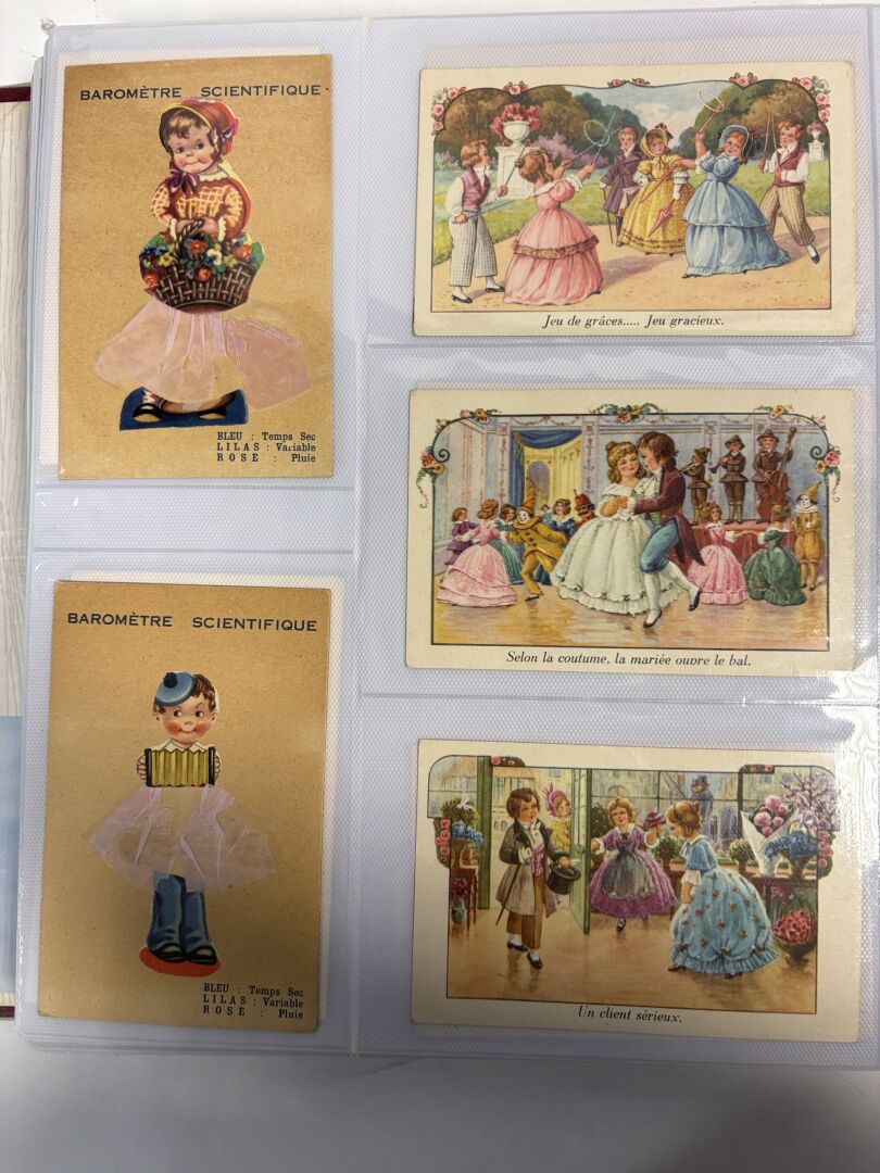 Album grenat de plus de 400 cartes d'illustrateurs dont Germaine BOURET, POULBOT, MAUZAN ...