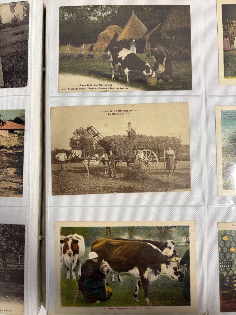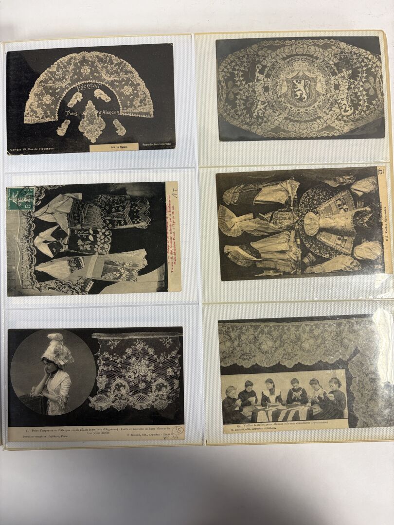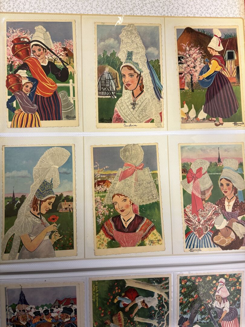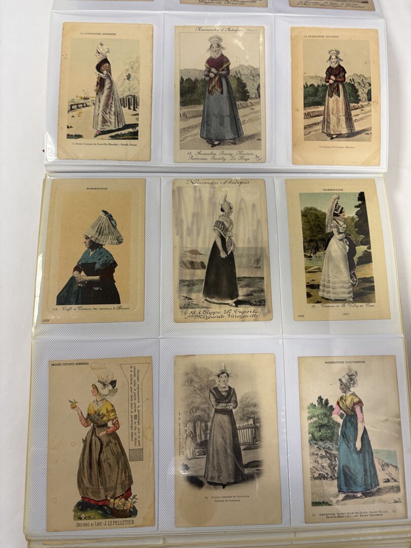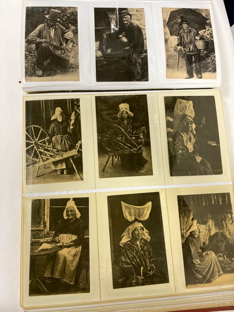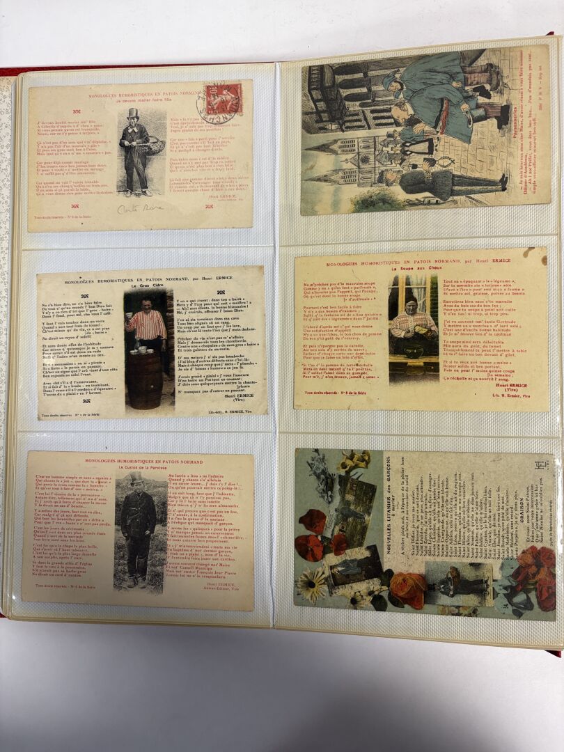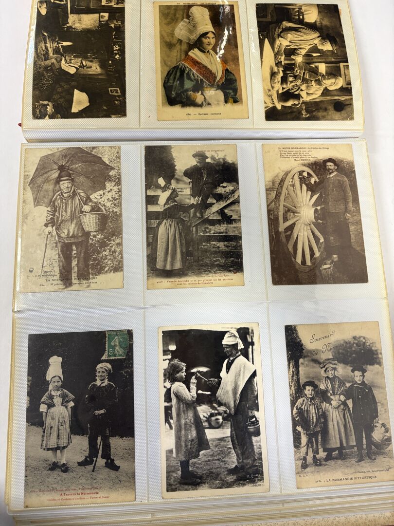 Album rouge de plus de 450 cartes postales anciennes sur la Normandie, les coiffes, les dentelles, les métiers ...