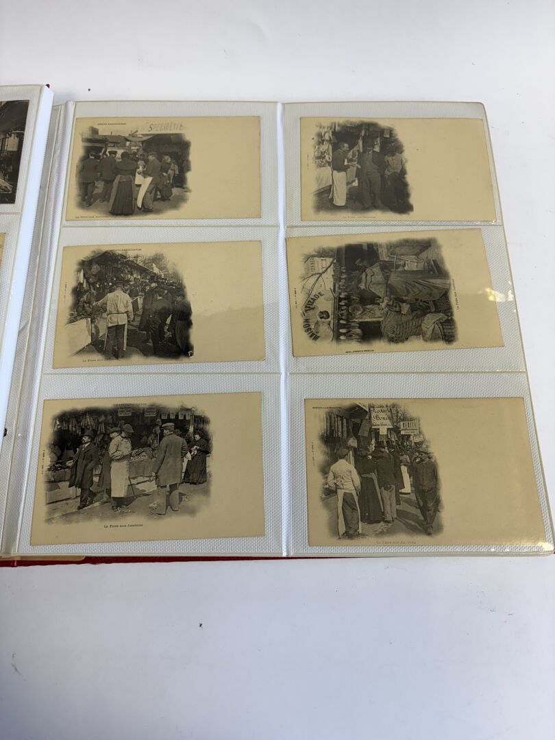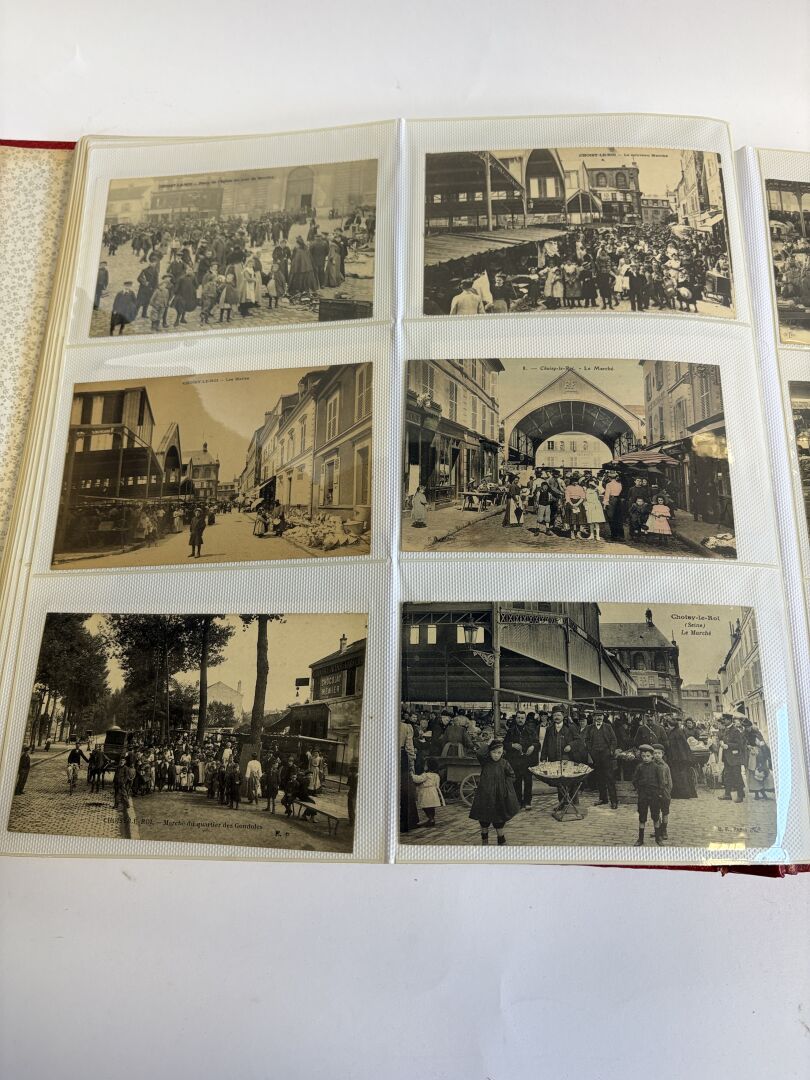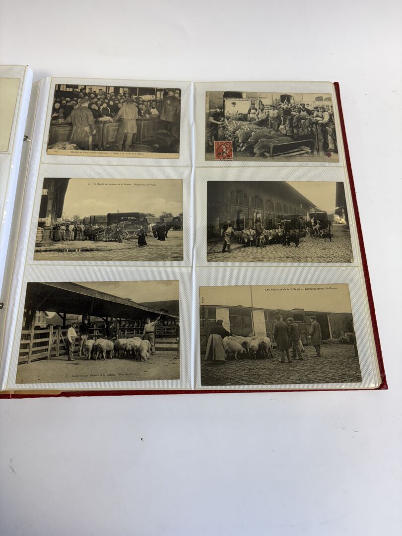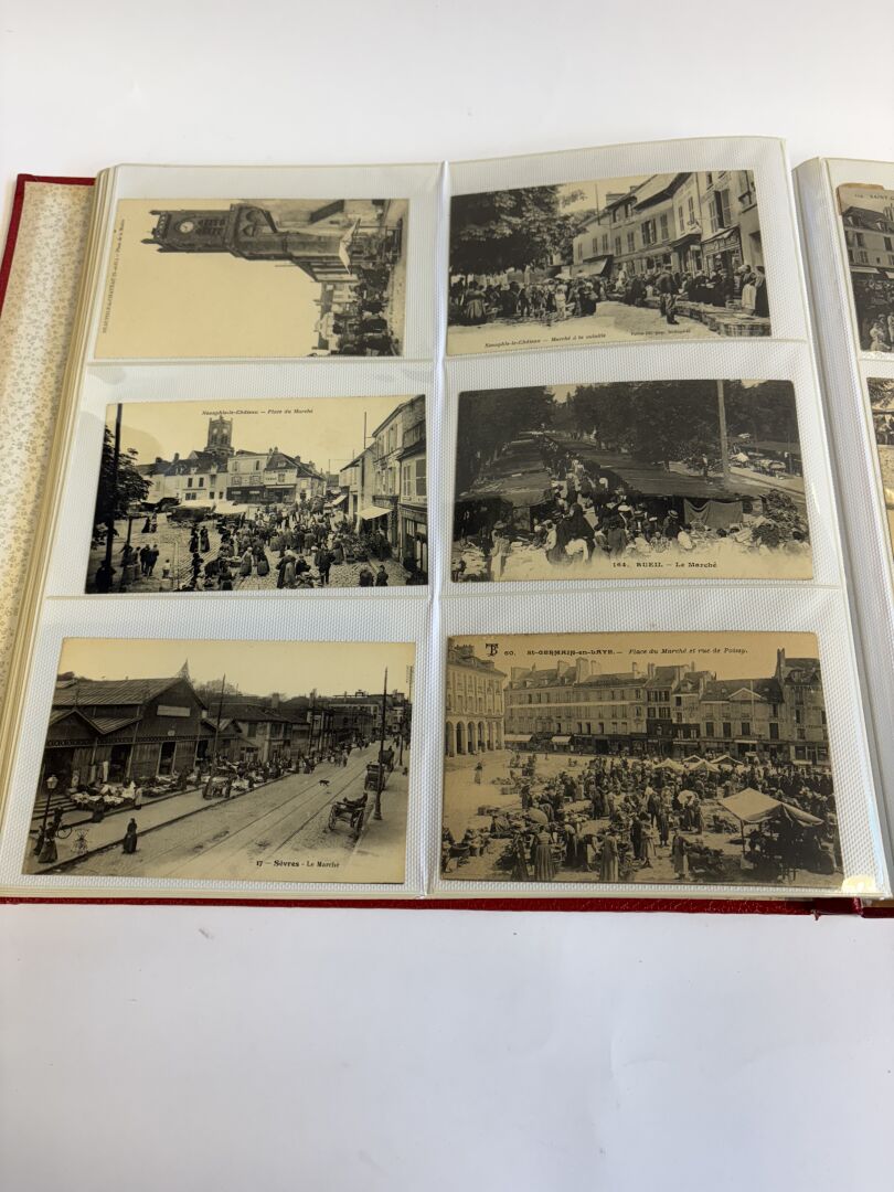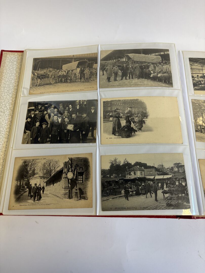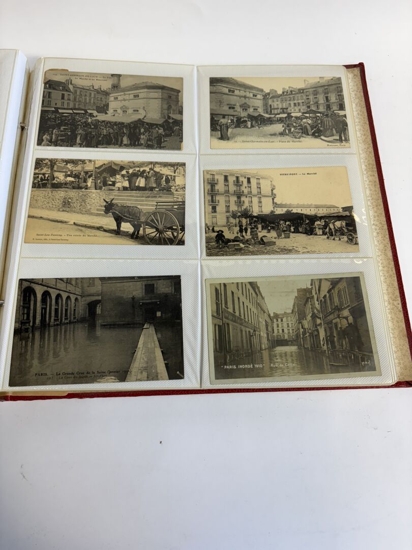 Album rouge de plus de 400 cartes postales anciennes. Nombreuses Gruss, scènes parisiennes, des foires, des marchés et quelques voitures