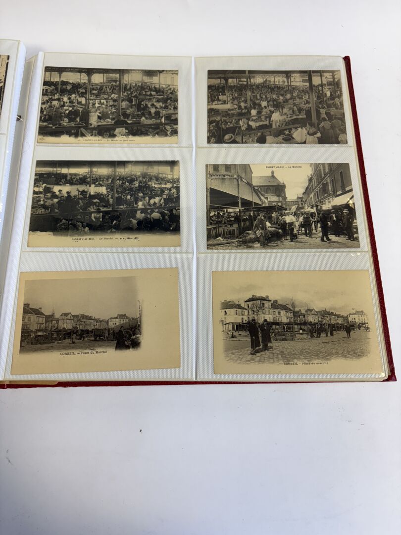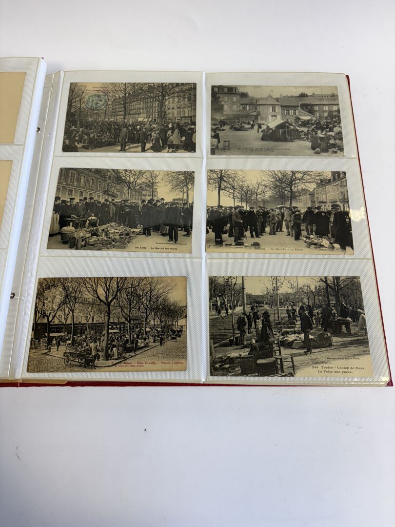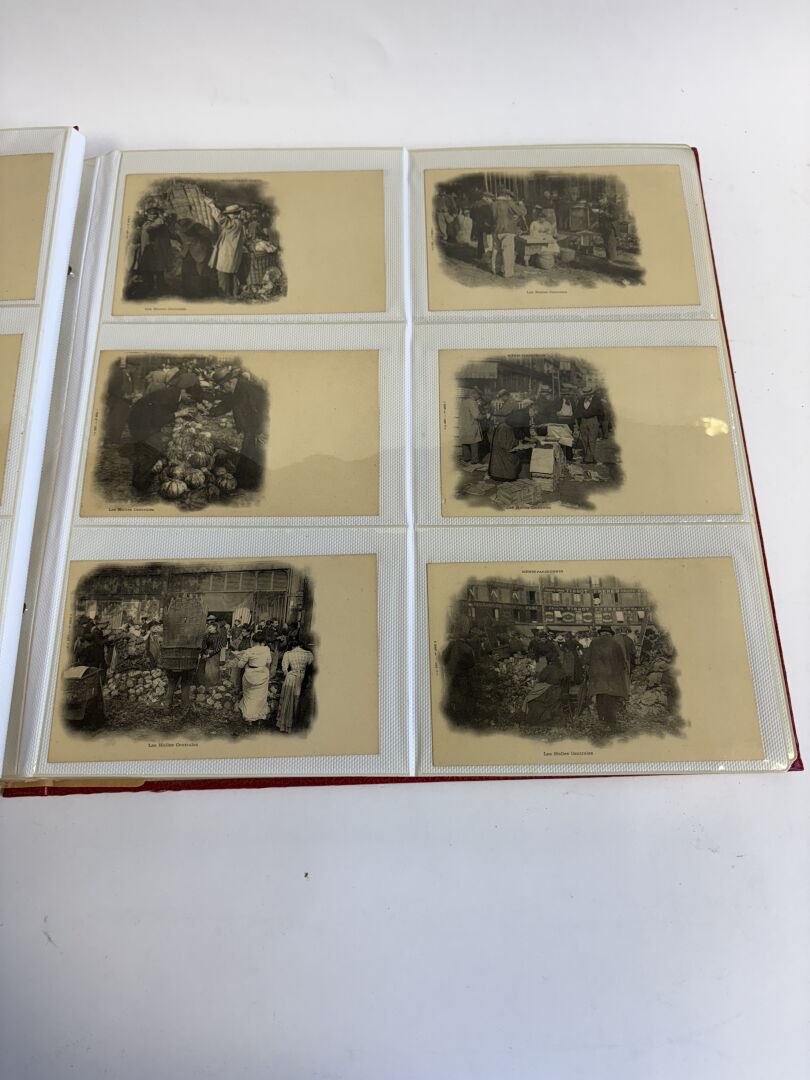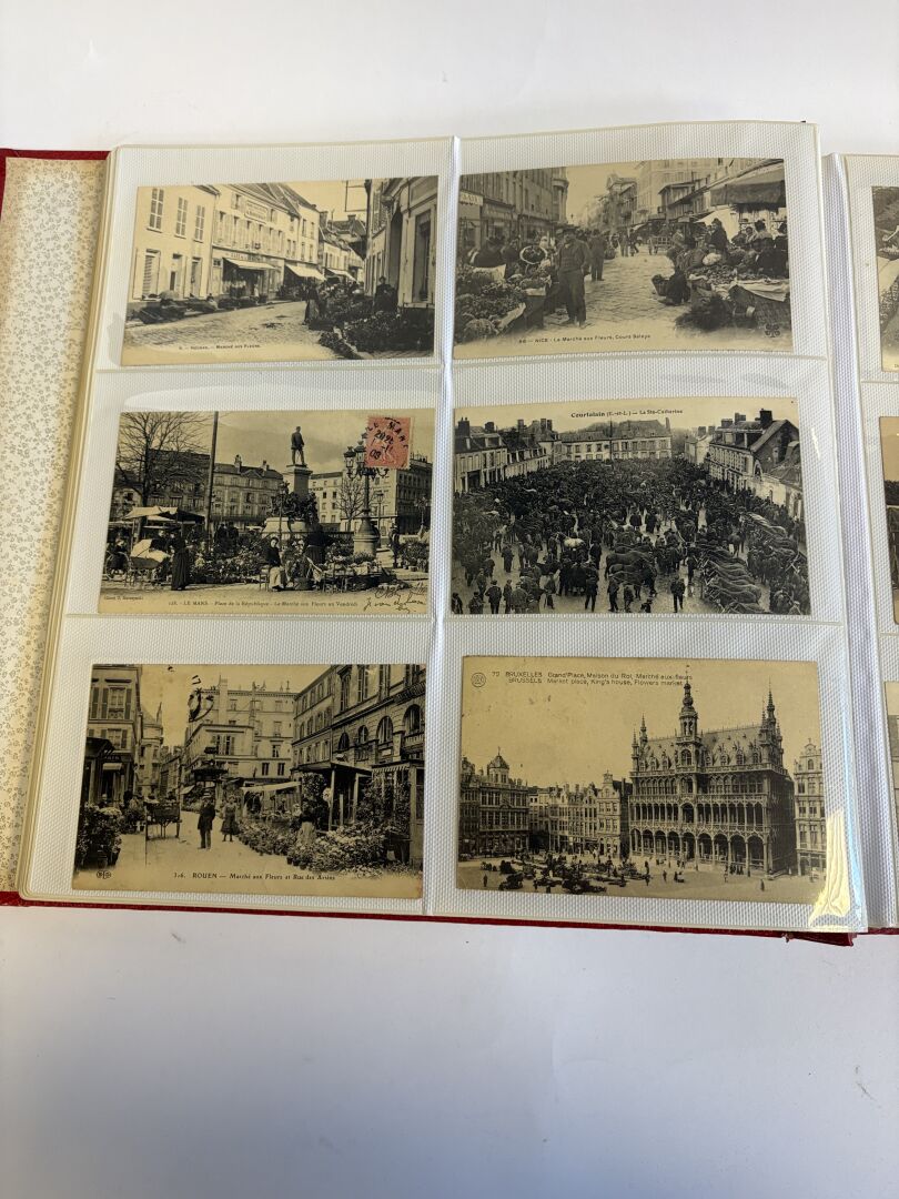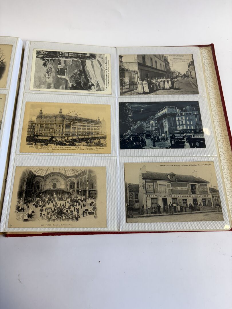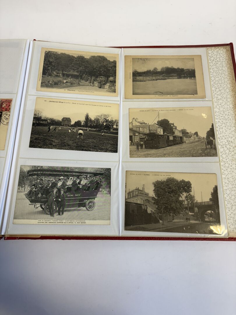 Album rouge de plus de 400 cartes postales anciennes. Nombreuses Gruss, scènes parisiennes, des foires, des marchés et quelques voitures