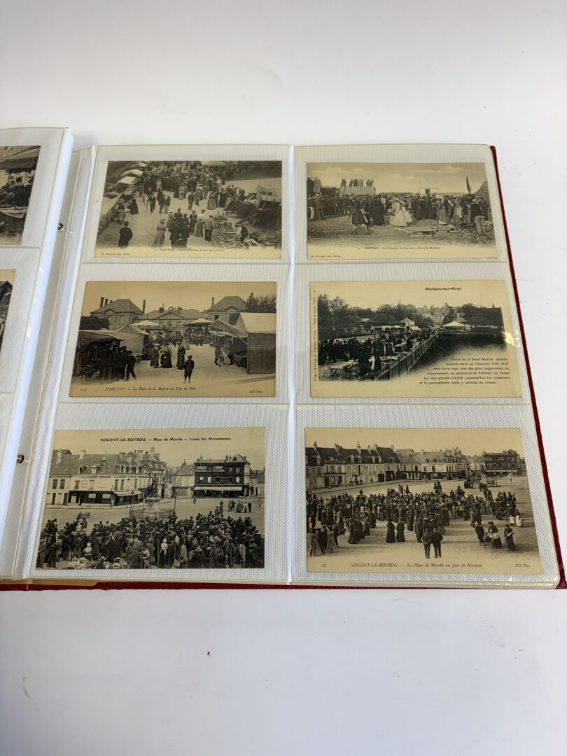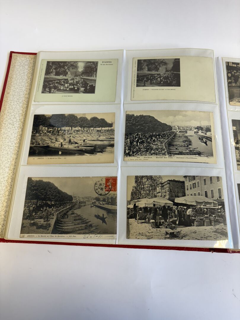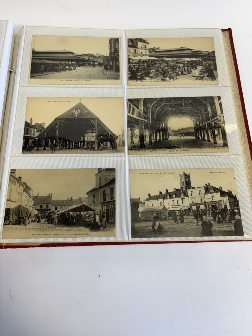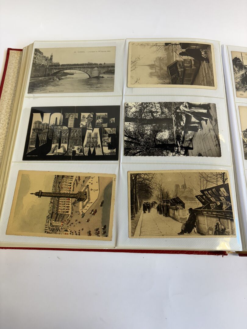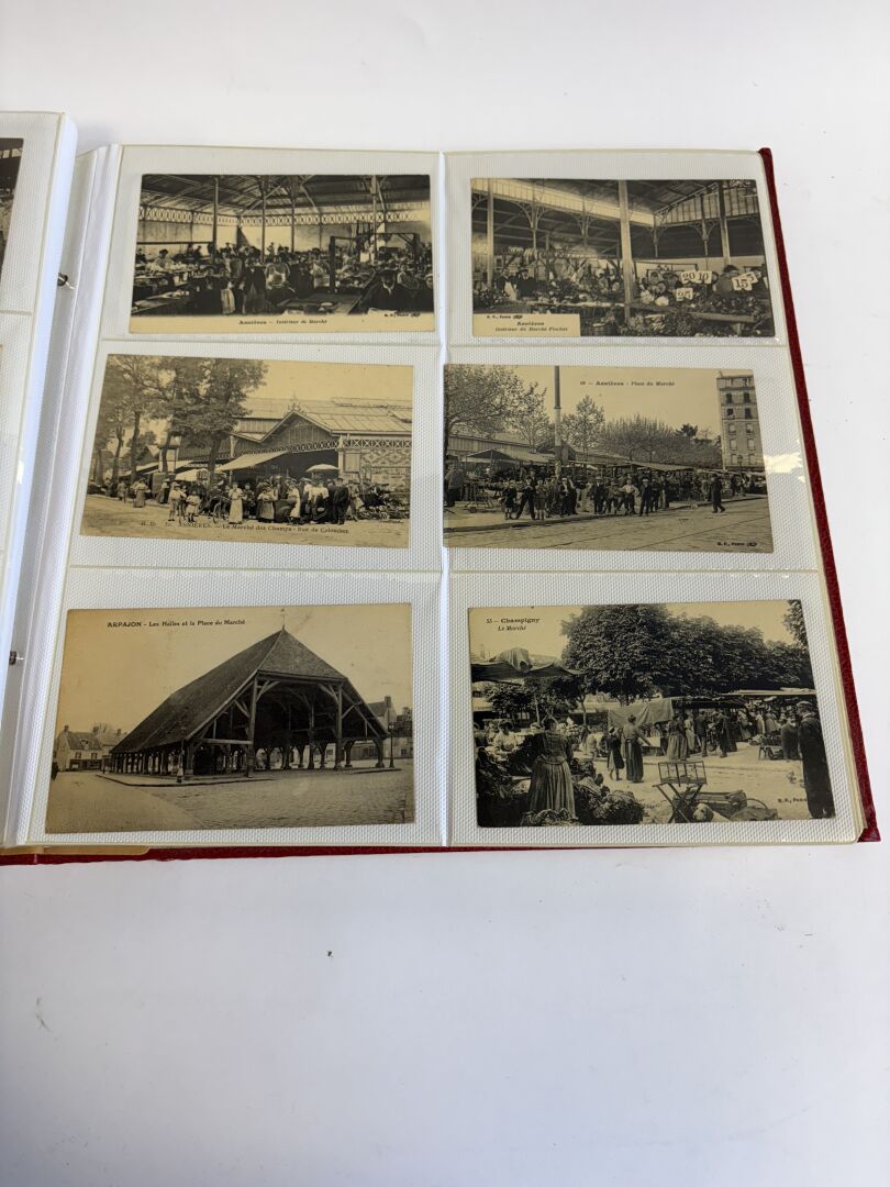 Album rouge de plus de 400 cartes postales anciennes. Nombreuses Gruss, scènes parisiennes, des foires, des marchés et quelques voitures