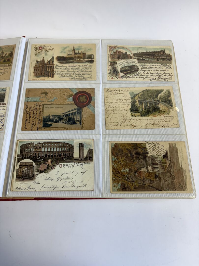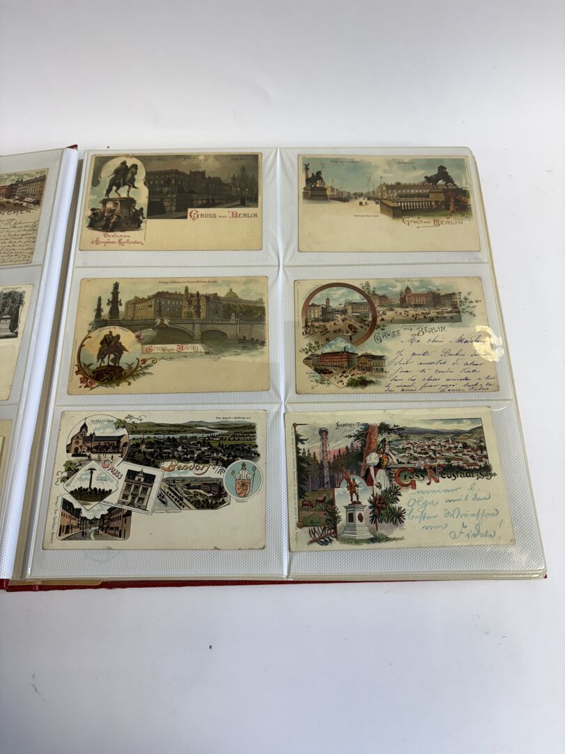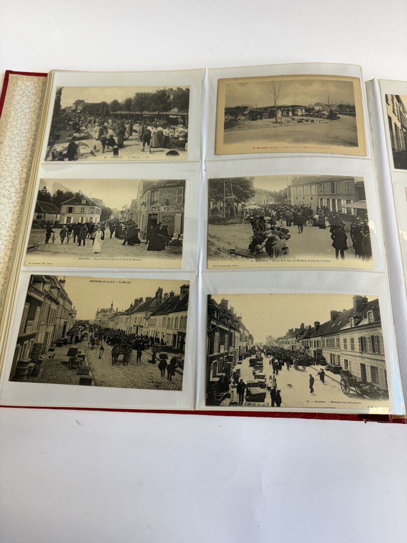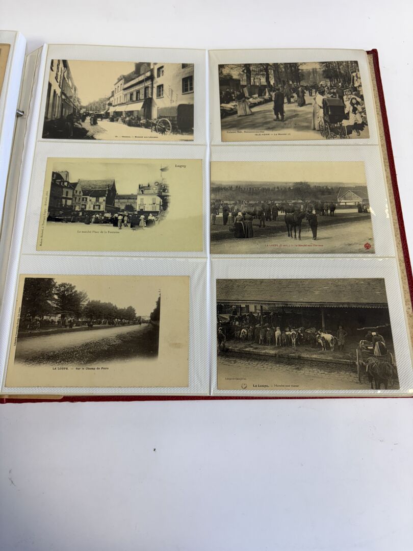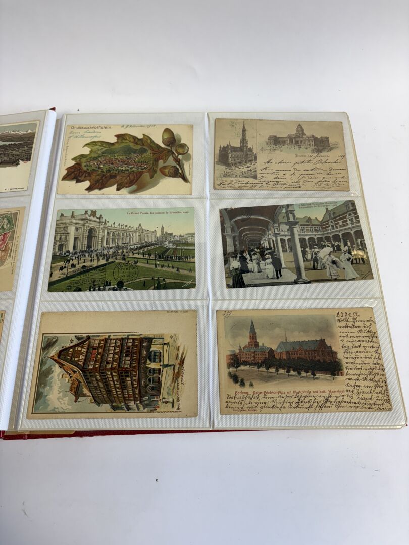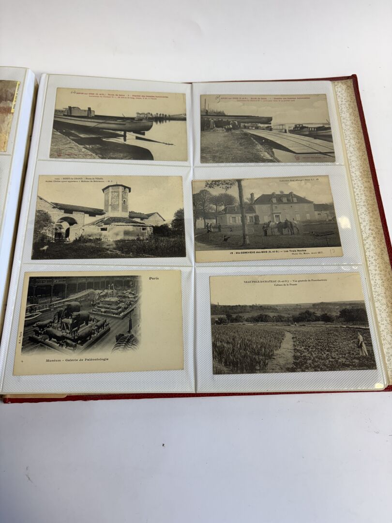 Album rouge de plus de 400 cartes postales anciennes. Nombreuses Gruss, scènes parisiennes, des foires, des marchés et quelques voitures