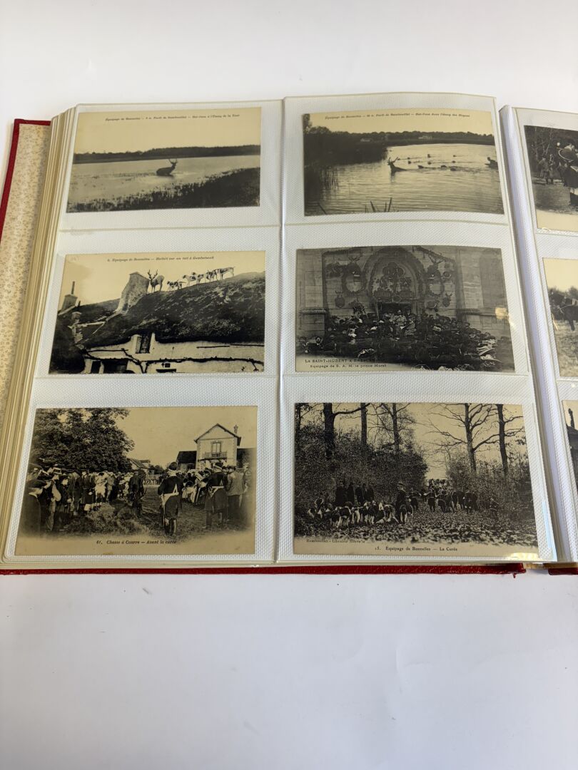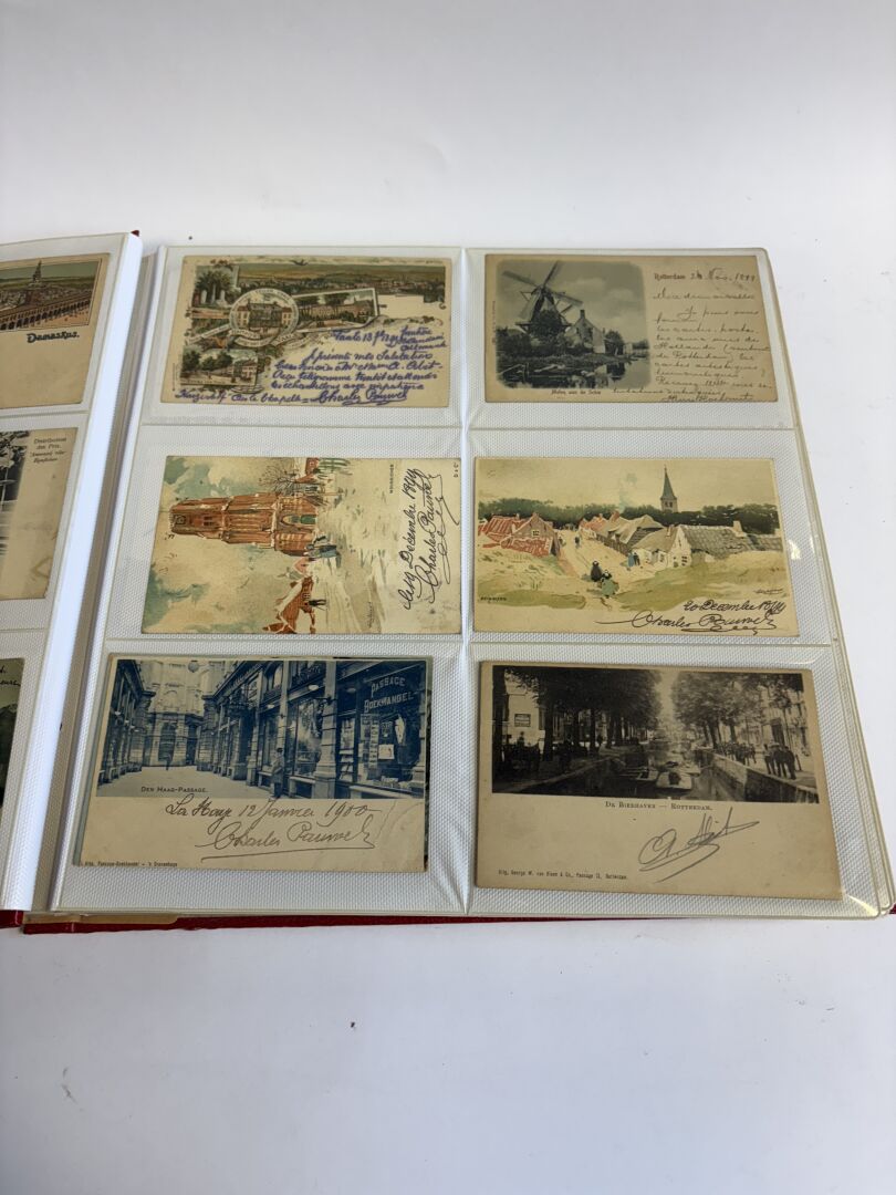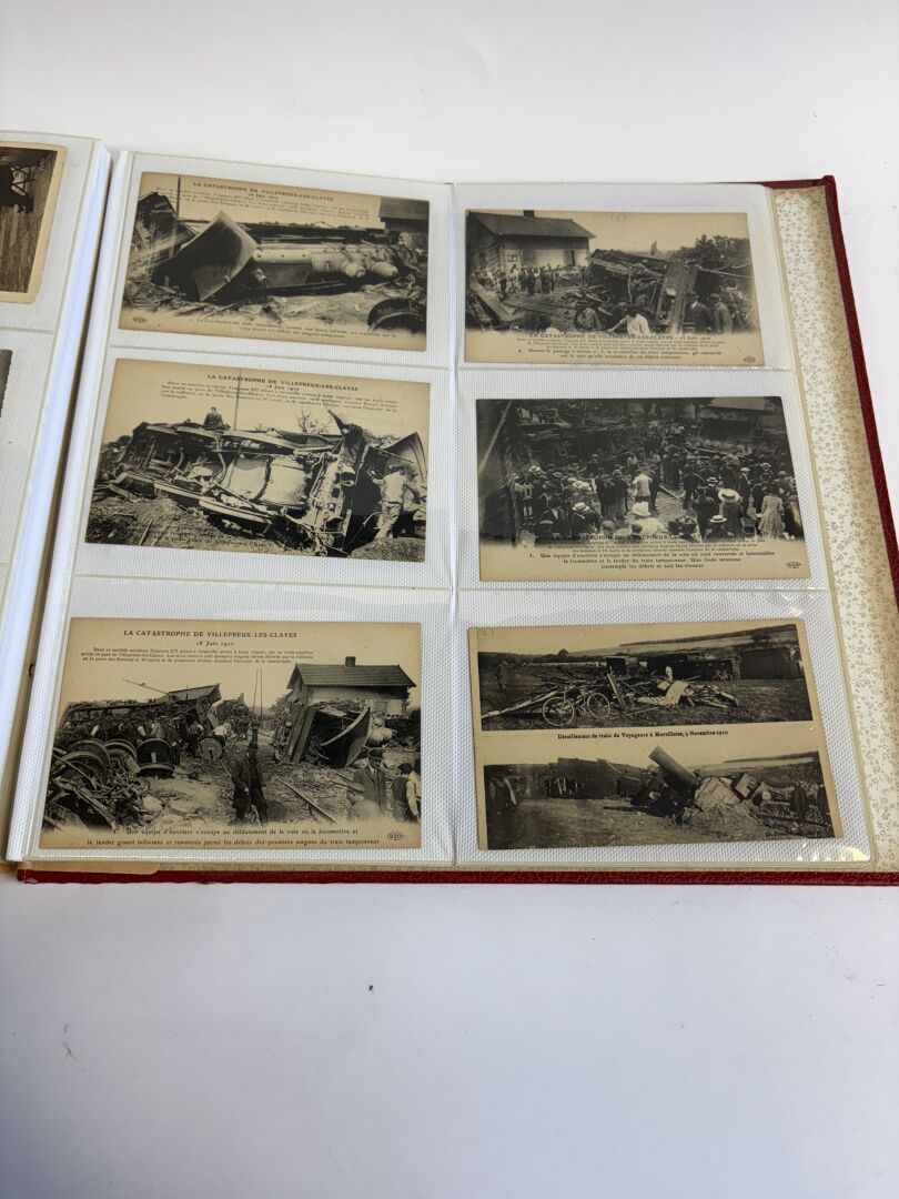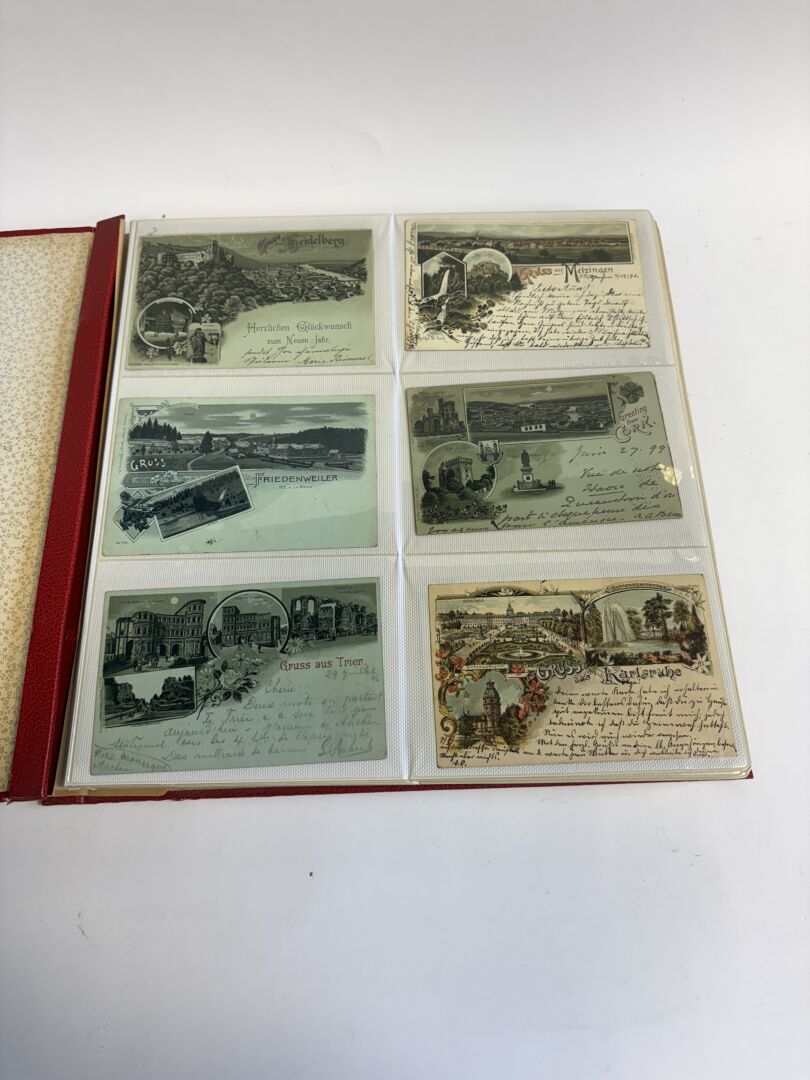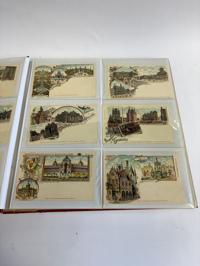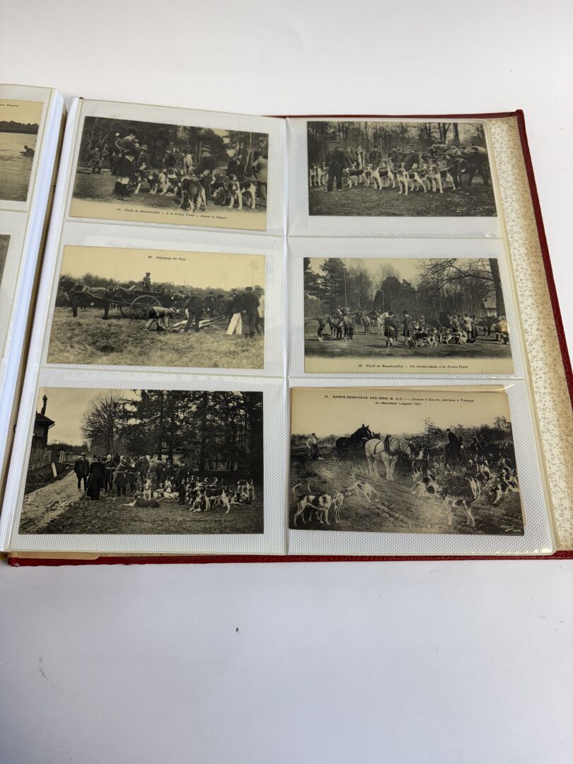 Album rouge de plus de 400 cartes postales anciennes. Nombreuses Gruss, scènes parisiennes, des foires, des marchés et quelques voitures